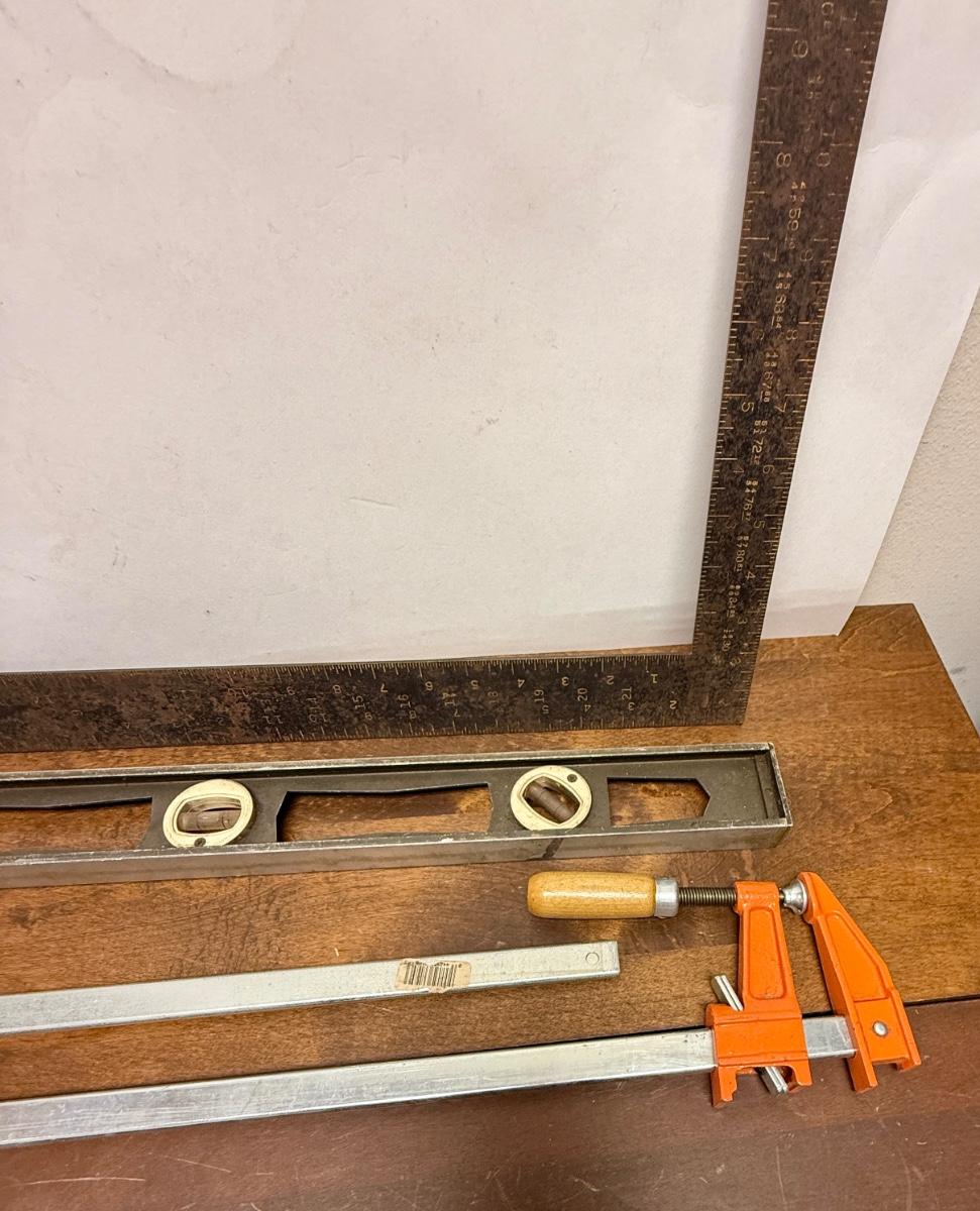 Level and square have some rust, but are in solid, useable condition. Jorgensen Clamps are 18" long and are in new condition.
