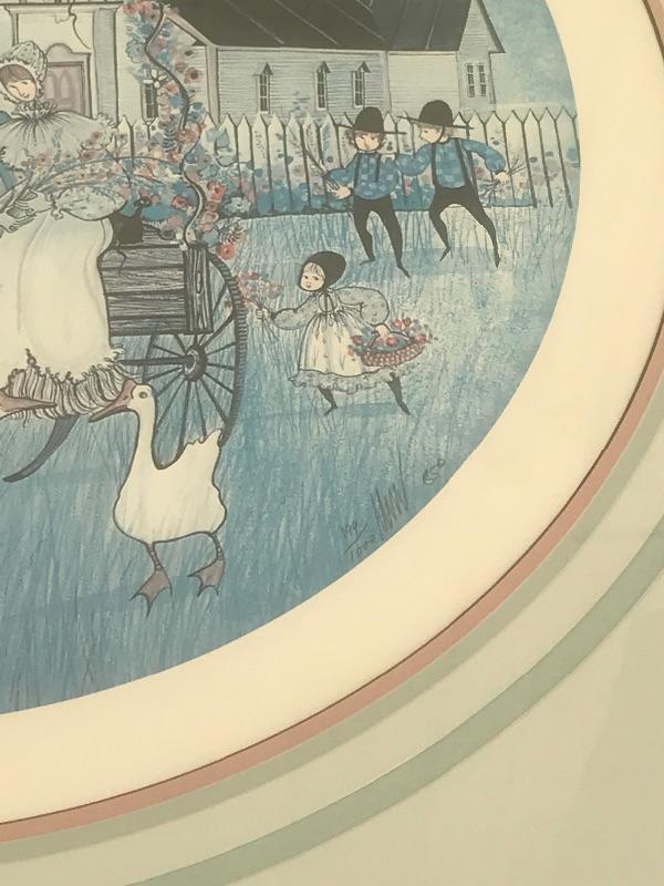 #14 framed print by P. Buckley Moss Couple on Buggy with kids and animals running around 27" x 27"