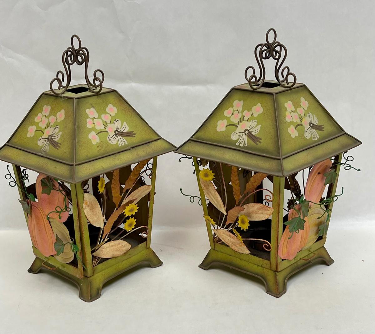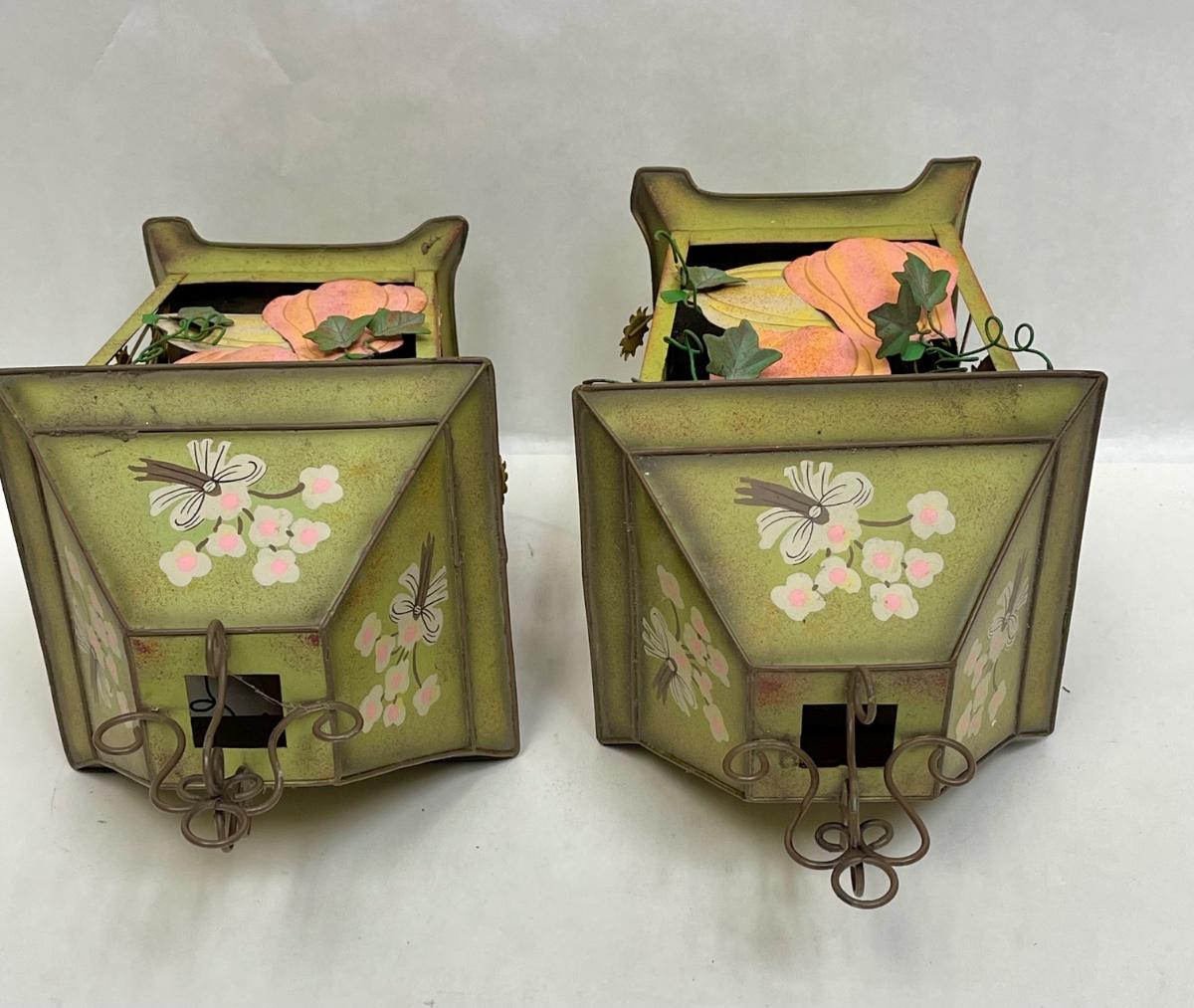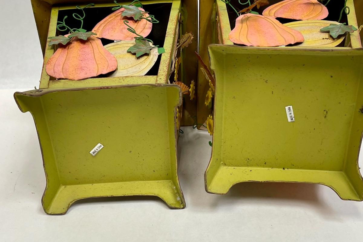With attached metal painted summer and fall flowers, vegetables, and vines. Paint is weathered to give them a rustic look. Good, solid condition, no rust.