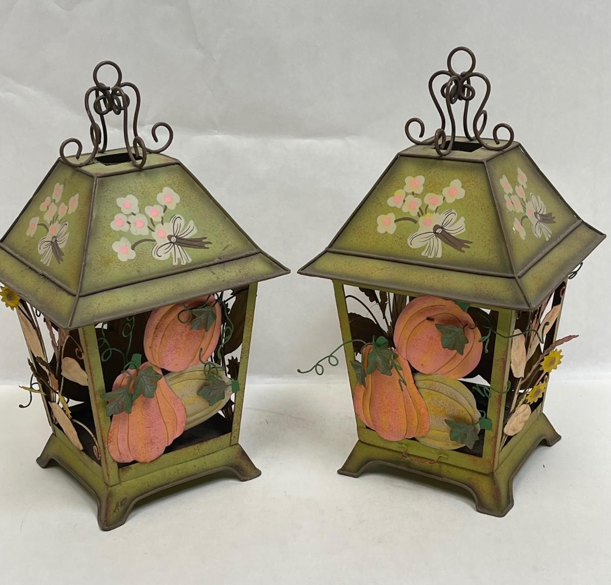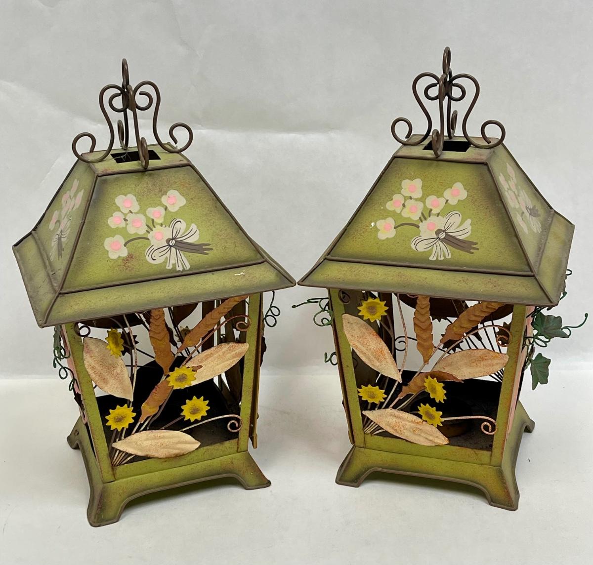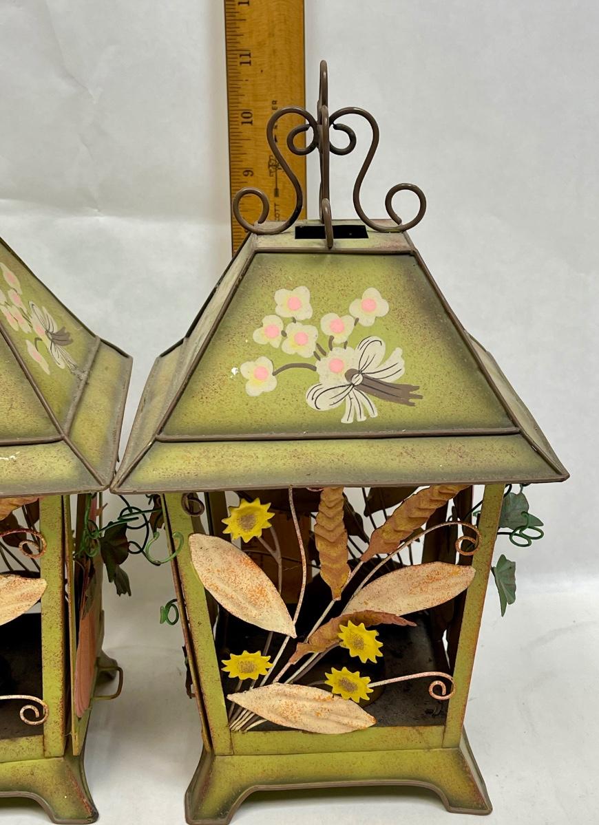 With attached metal painted summer and fall flowers, vegetables, and vines. Paint is weathered to give them a rustic look. Good, solid condition, no rust.