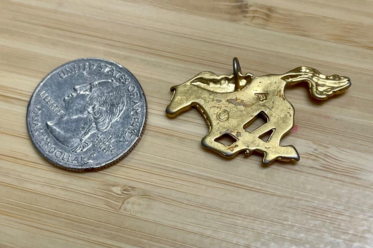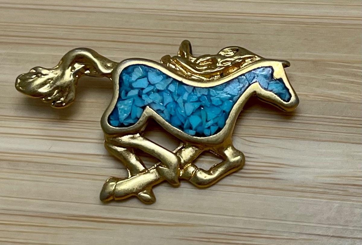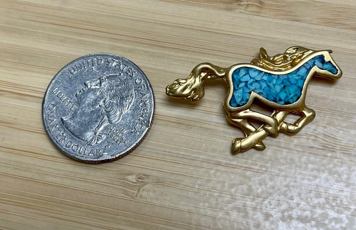 Turquoise Stone Filled Gold Tone Plated Galloping Running Horse Pendant Charm. There is a couple of marks on the back but no 14k marks. In good condition. About 1" size. Body looks like turquoise set in resin.