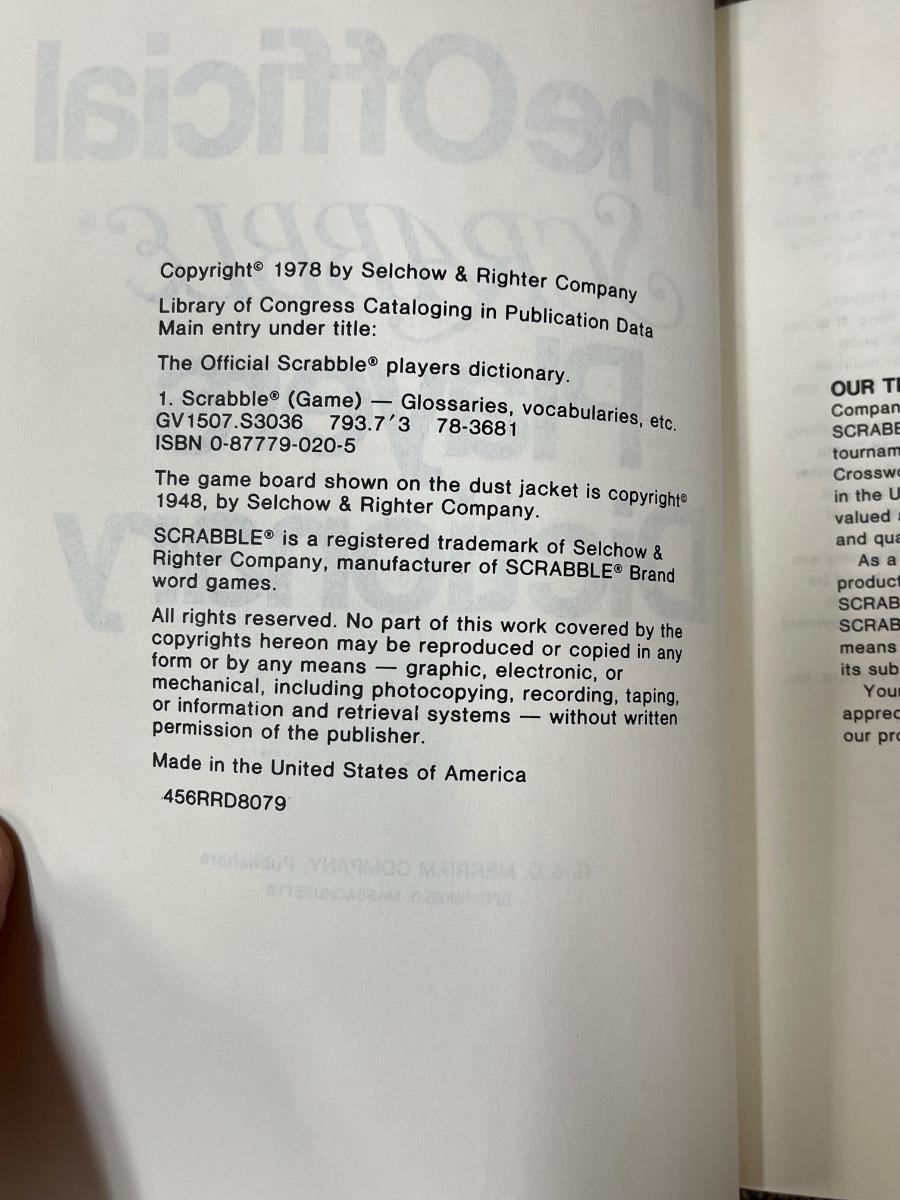 1978 The Official Scrabble Players Dictionary Book. In good condition. Had a Christmas Card inside, it was given as a gift.