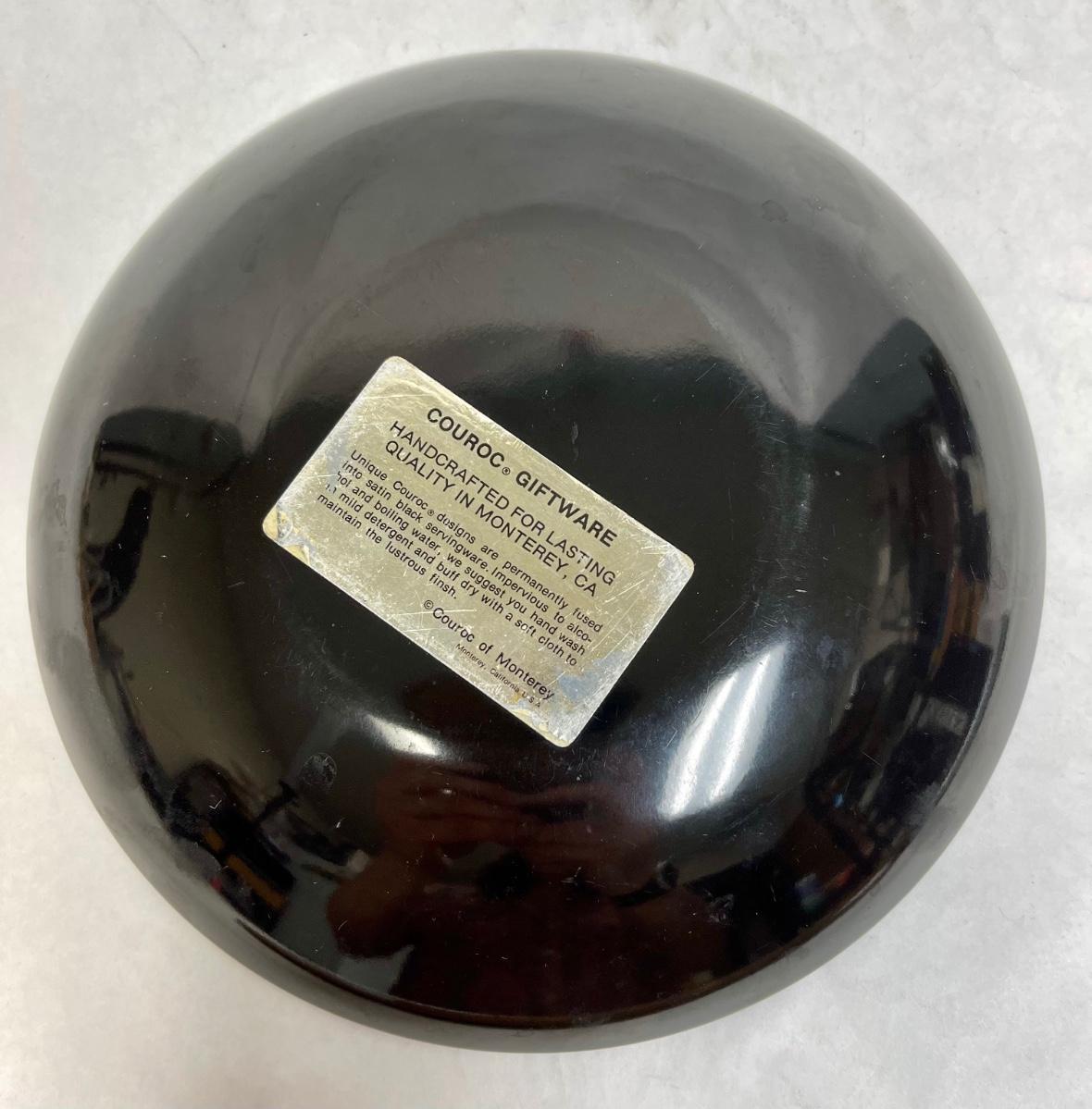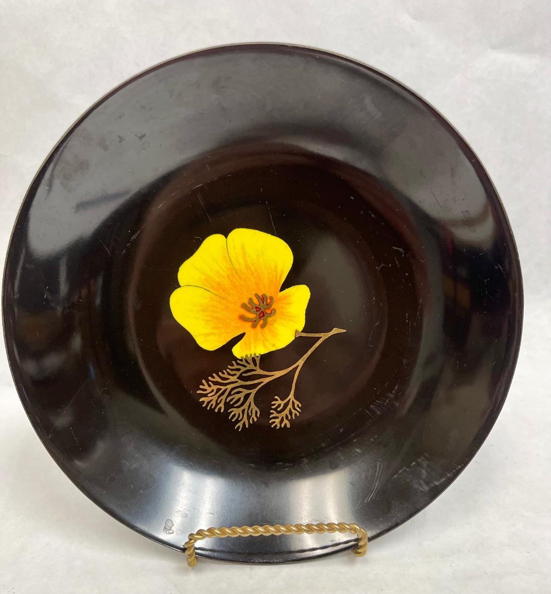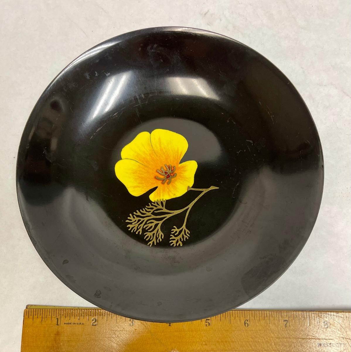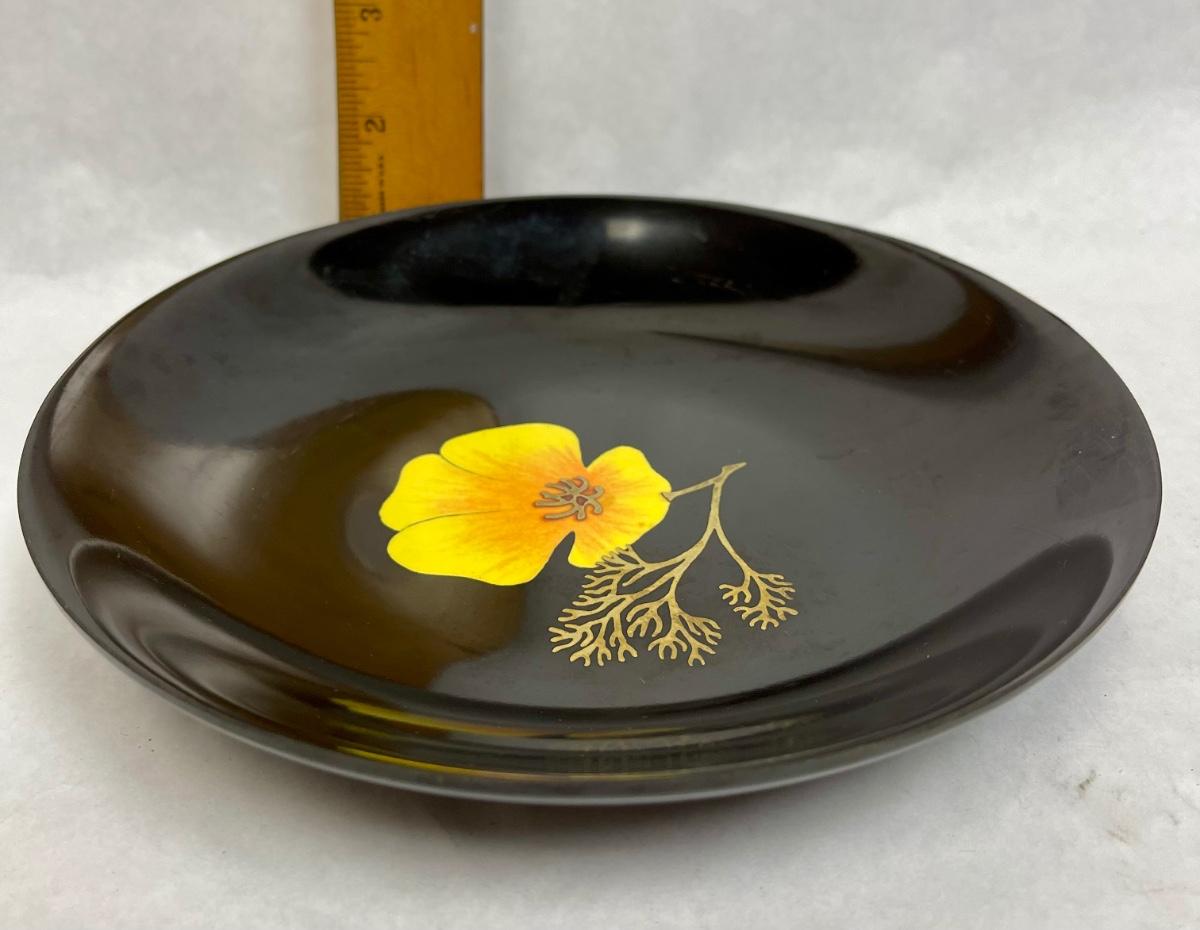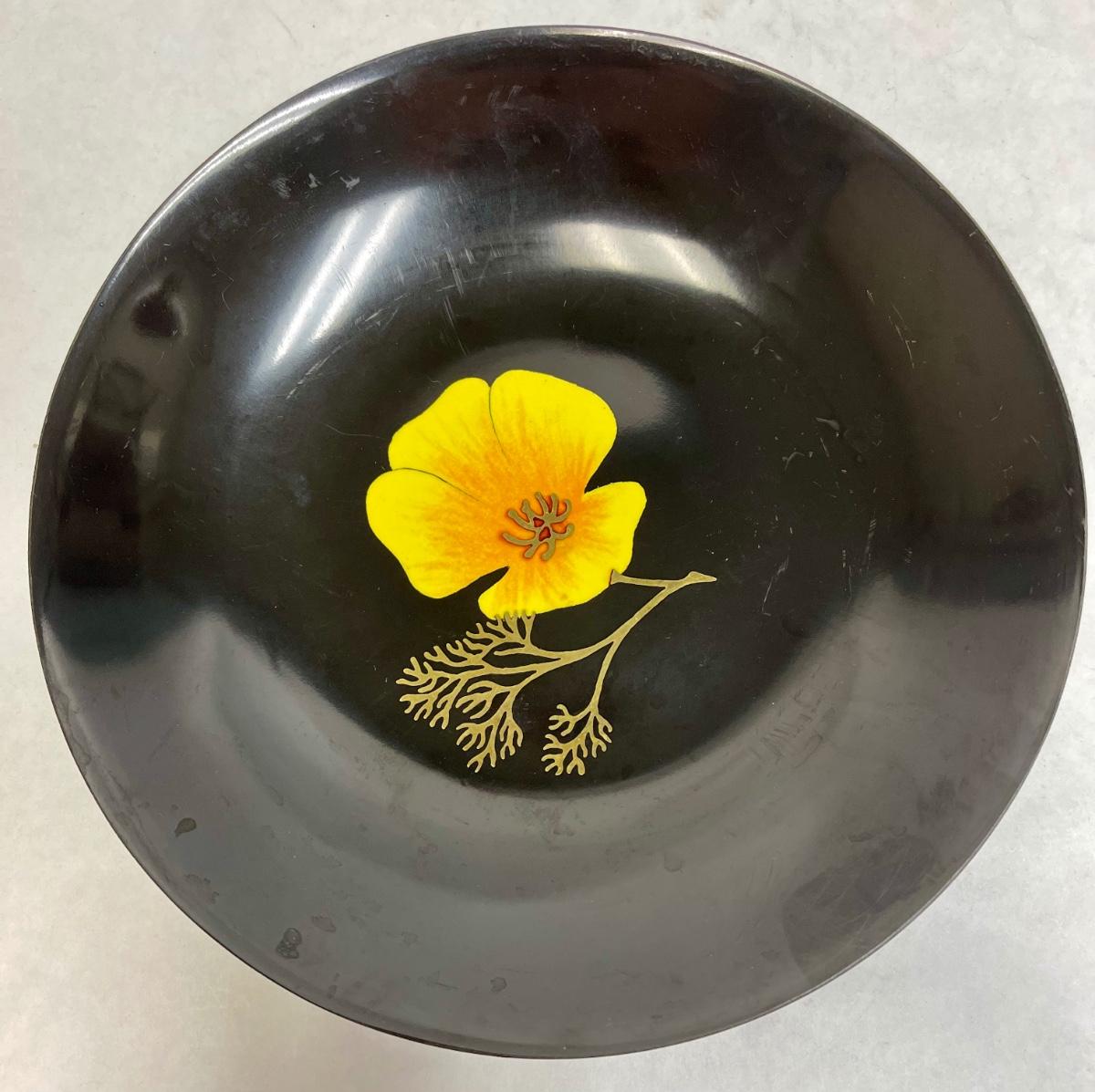 Courier Giftware of Monterey CA Black Lacquer Bowl with Hand-painted Yellow Flower Poppy