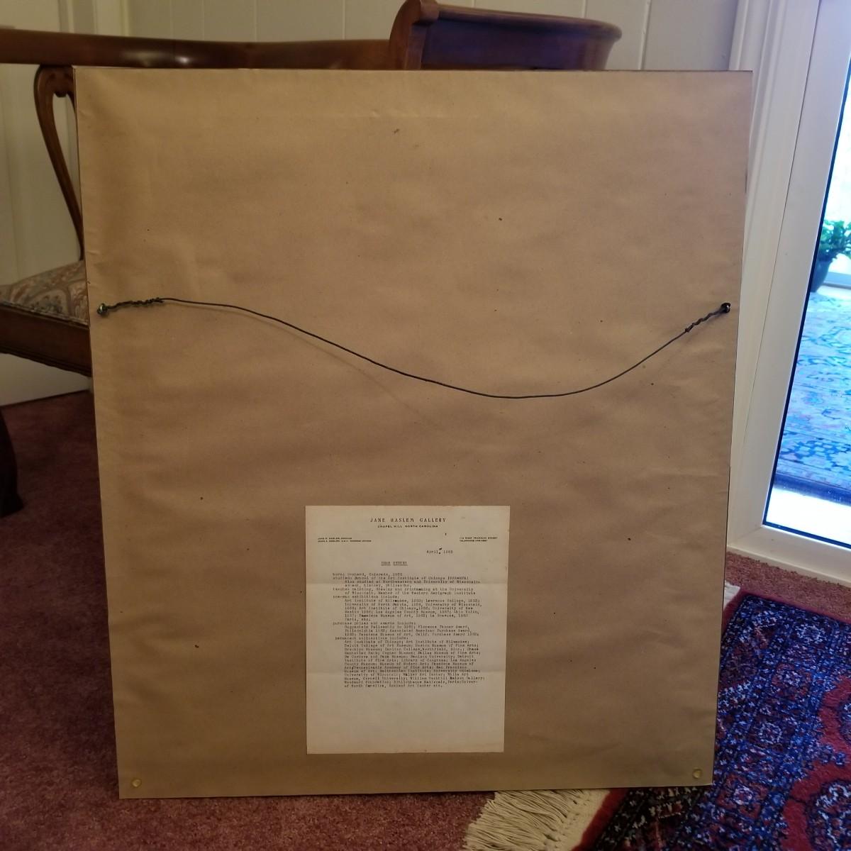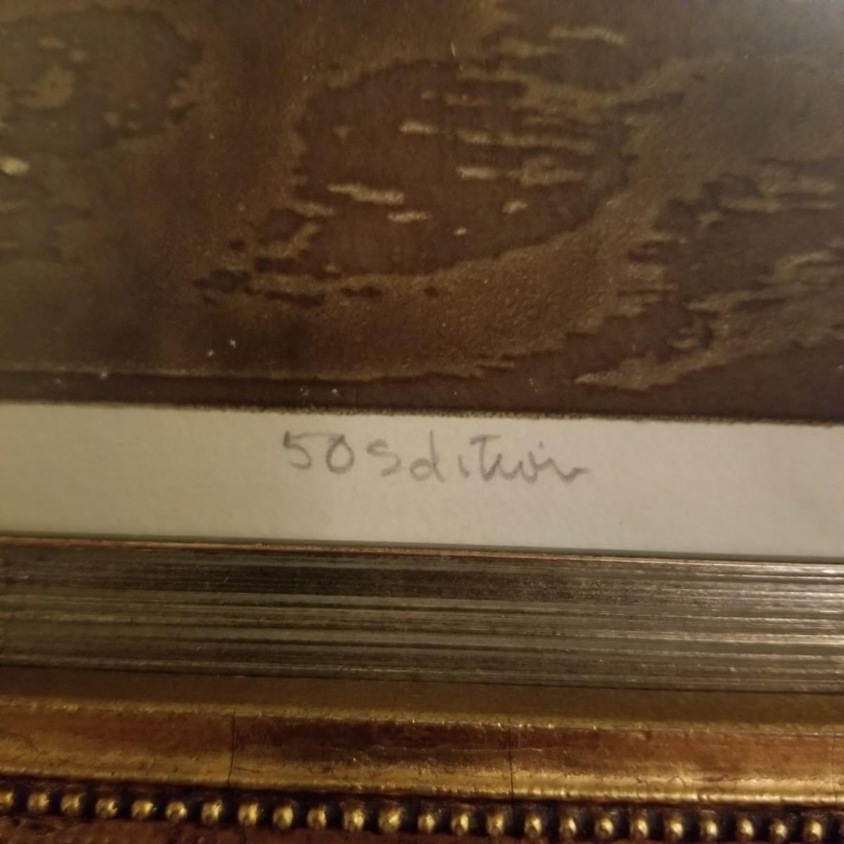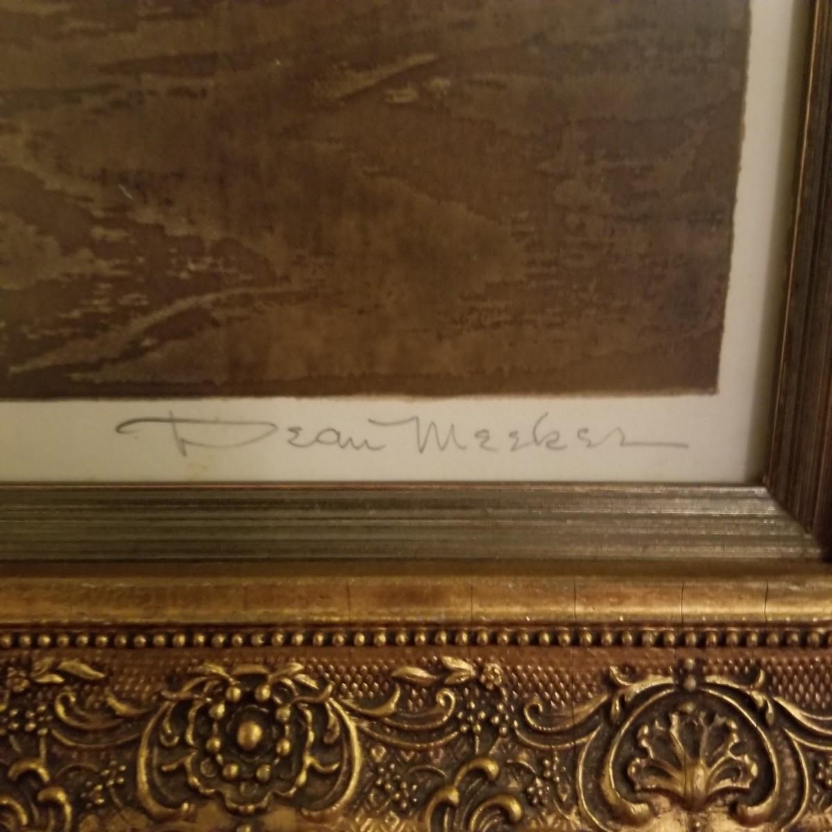 Unique signed print by artist Dean Meeker. Highly decorative gold colored wooden frame. Signature and info at bottom of picture, see photos for details. Letter on back from art gallery describing artist and his career. 26"x30"x2". Shipping available. Shipping Art can be costly please call UPS store at 828-252-6930 for quote.
