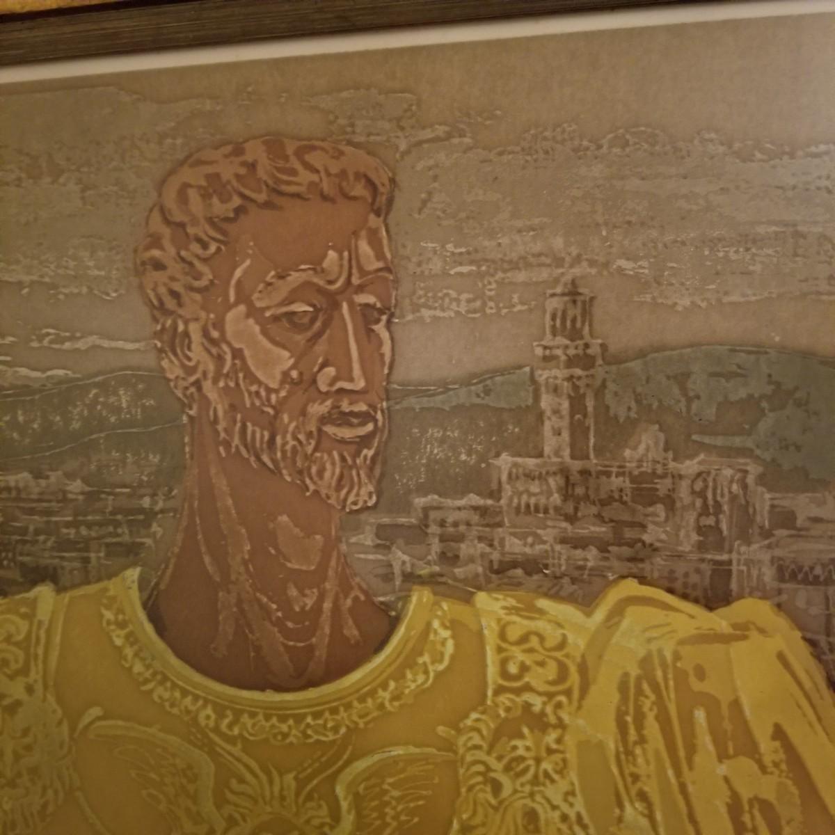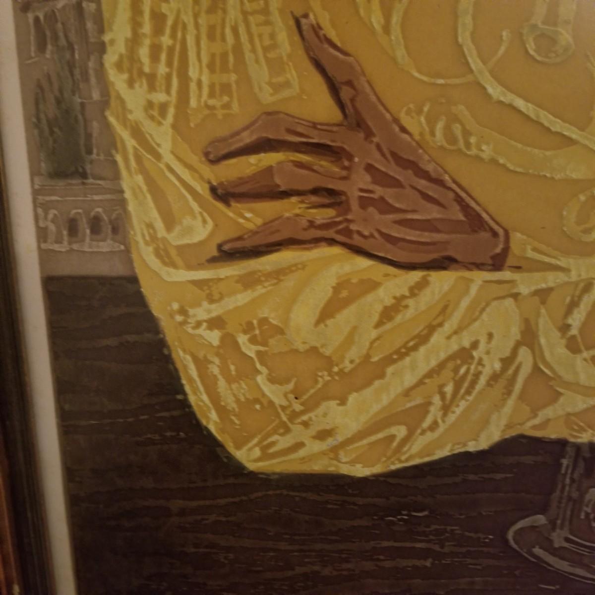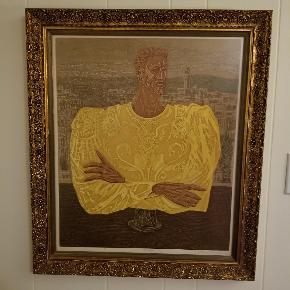 Unique signed print by artist Dean Meeker. Highly decorative gold colored wooden frame. Signature and info at bottom of picture, see photos for details. Letter on back from art gallery describing artist and his career. 26"x30"x2". Shipping available. Shipping Art can be costly please call UPS store at 828-252-6930 for quote.