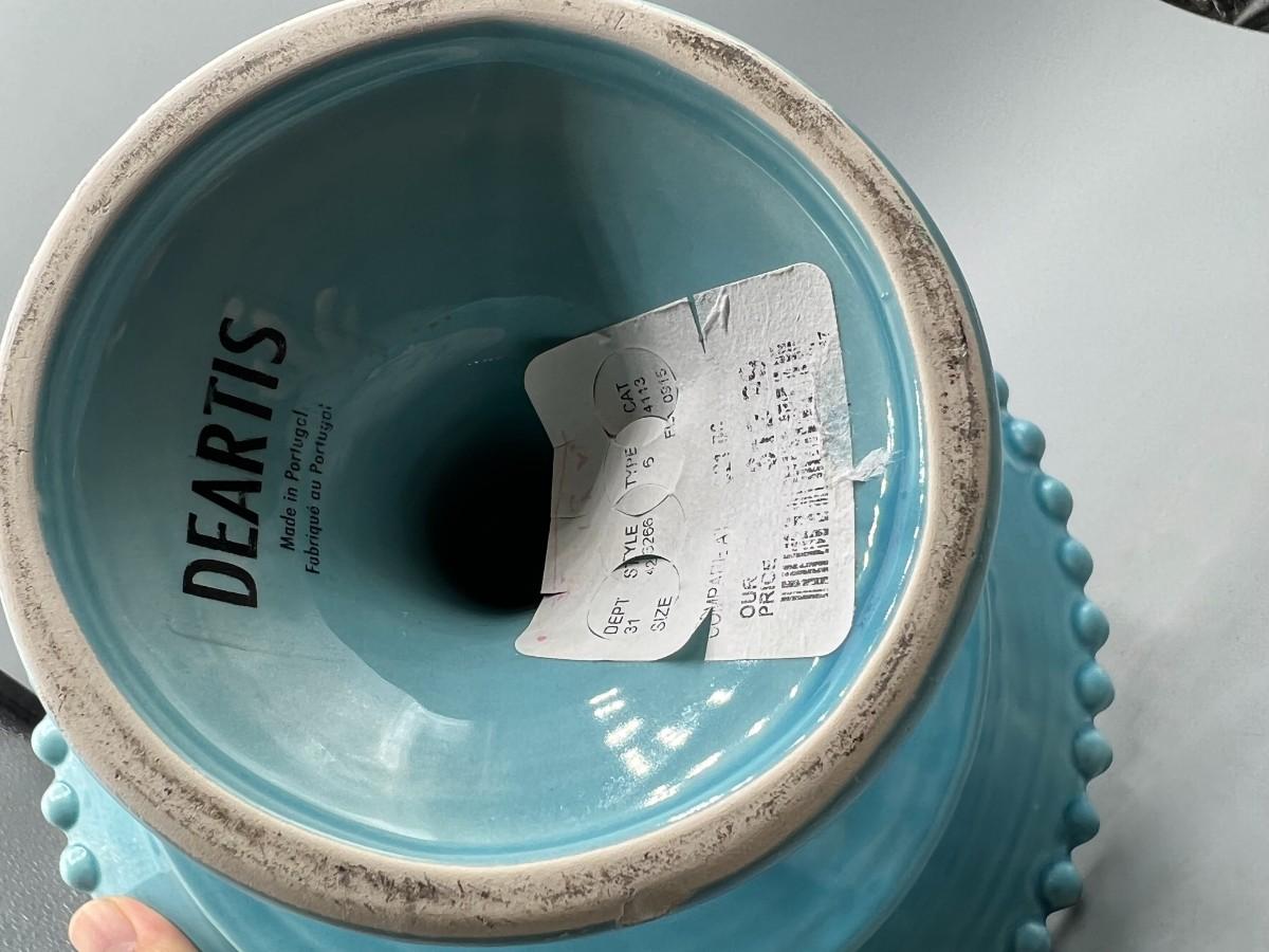 Deartis Turquoise Blue Ceramic Pedestal Candy Dish Compote Candle Holder. Newer ceramic. 7" tall.