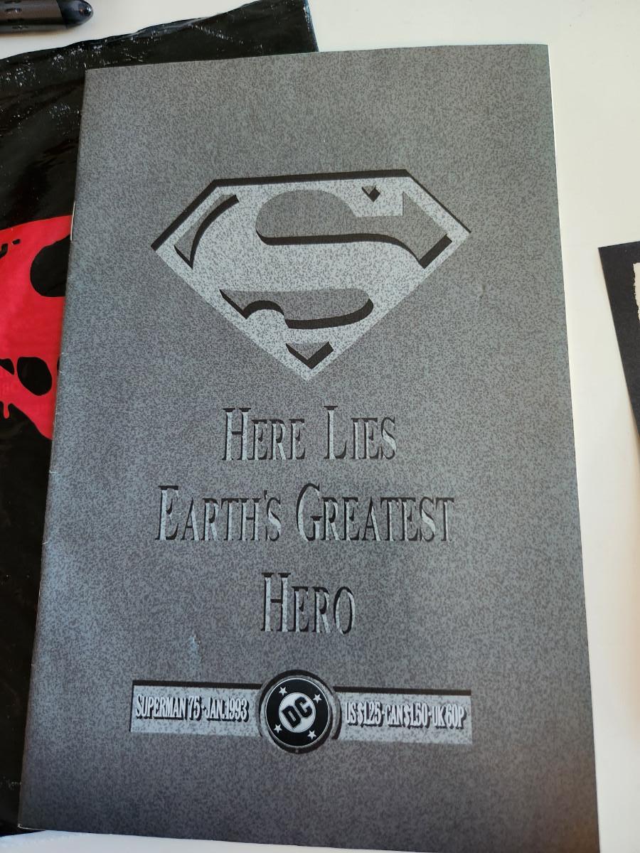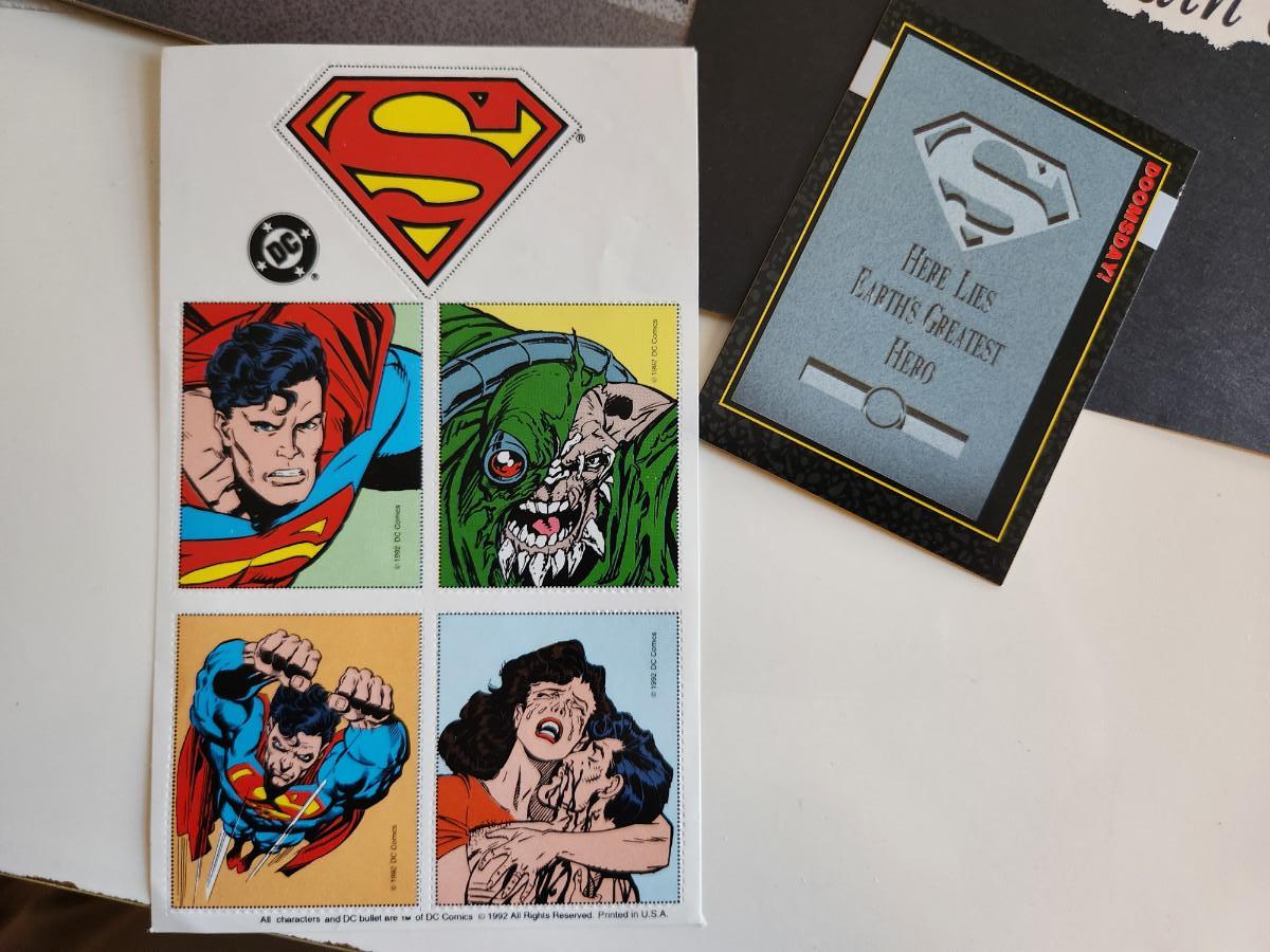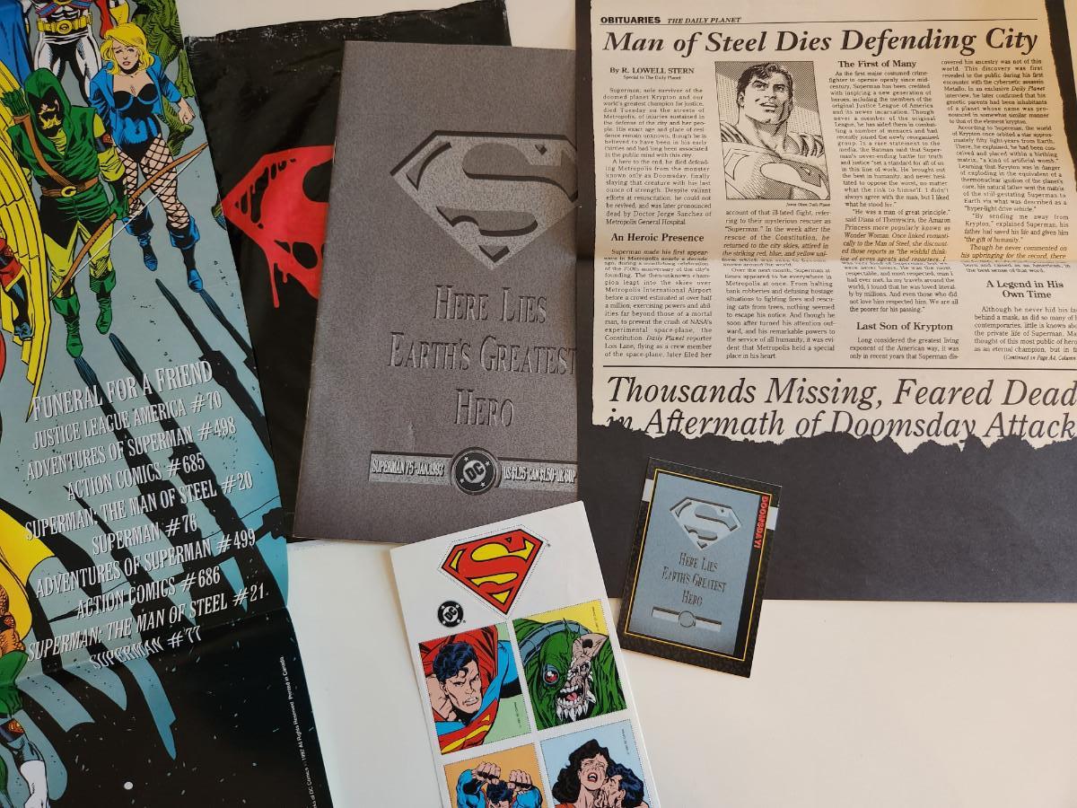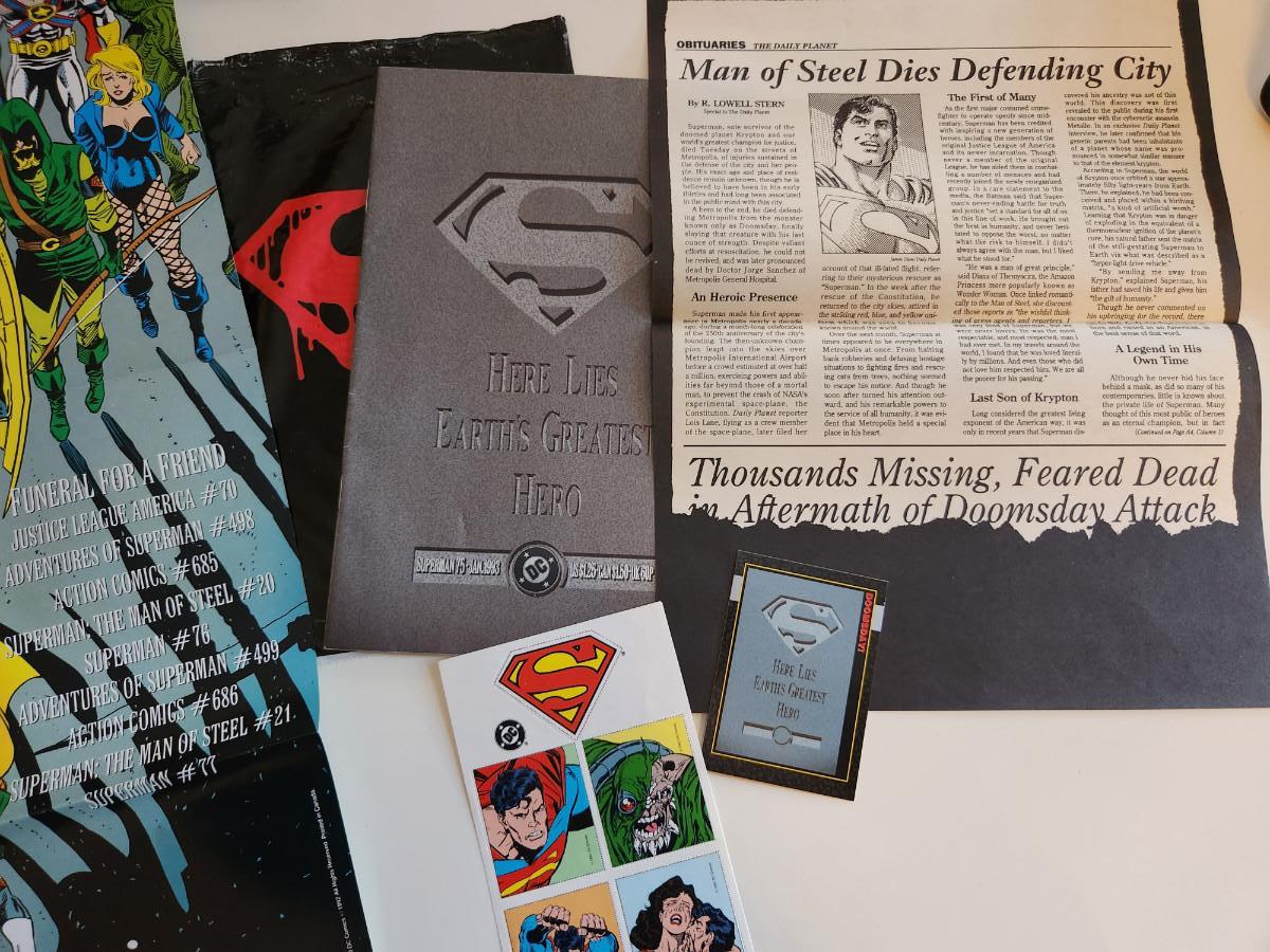 This auction lot is for a Death of Superman Memorial Set. This set has been opened and the outer plastic sleeve shows some wear. The contents includes a comic book: Superman 75 with fold out splash back cover dated January 1993 published by DC Comics, a black mourning armband with Superman logo, a newspaper obituary from the Daily Planet, a full-color commemorative stamp page with 5 stamps that have not been perforated, a Doomsday Skybox trading card and a large 8 section fold-out full color poster. Overall the items are in very good condition but not mint. Great for most any Superman collection.