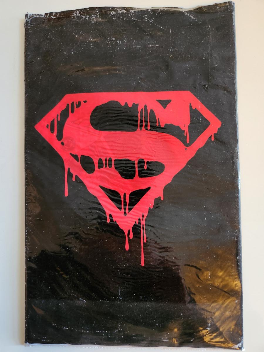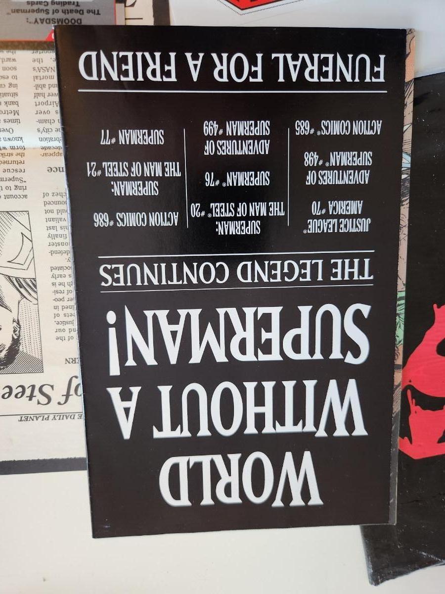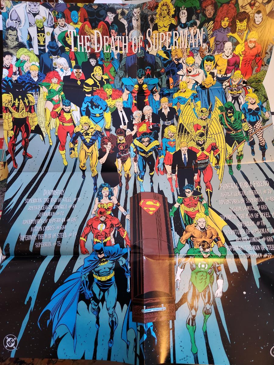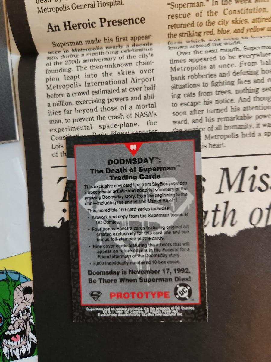This auction lot is for a Death of Superman Memorial Set. This set has been opened and the outer plastic sleeve shows some wear. The contents includes a comic book: Superman 75 with fold out splash back cover dated January 1993 published by DC Comics, a black mourning armband with Superman logo, a newspaper obituary from the Daily Planet, a full-color commemorative stamp page with 5 stamps that have not been perforated, a Doomsday Skybox trading card and a large 8 section fold-out full color poster. Overall the items are in very good condition but not mint. Great for most any Superman collection.