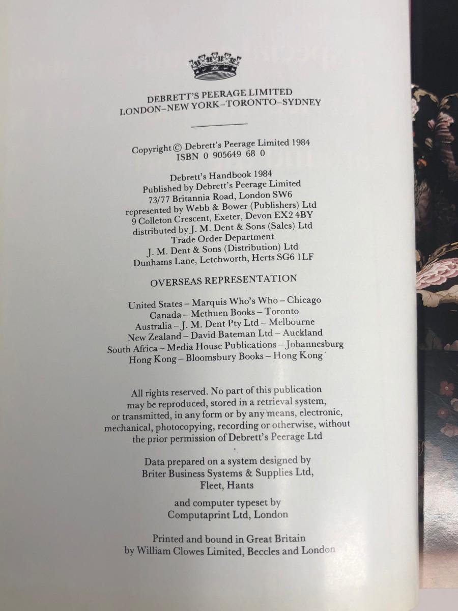 Description: Suzanne Duke, Dawn Henderson, Antonia Gaisford-St Lawrence. Editors. Debrett's Handbook 1984 London: Debrett Peerage Ltd 1984 Measurement Approximately: 9.5” H.Material: Paper. DJ. has some wear Note: 2056 pp., Hard Cover.
