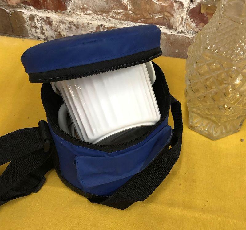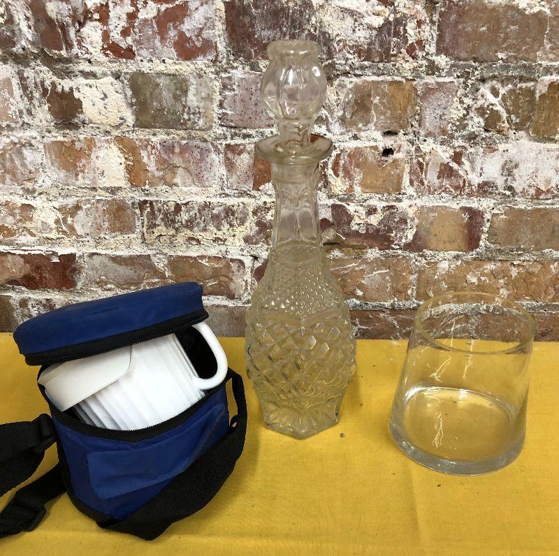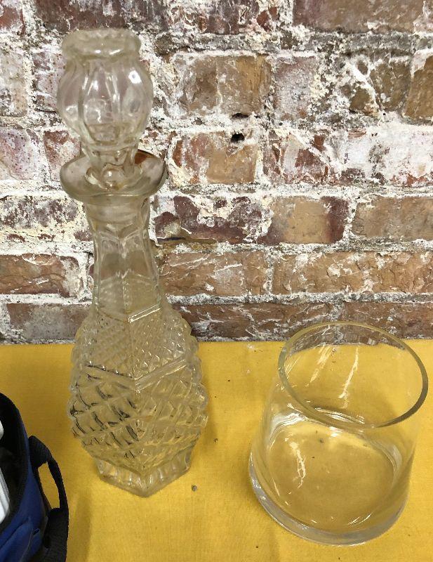 Here is a mixed lot with a pressed glass decanter,,,a modern glass ice bucket and a food warmer...