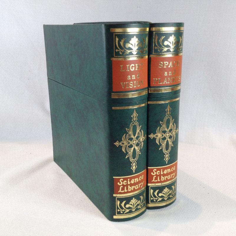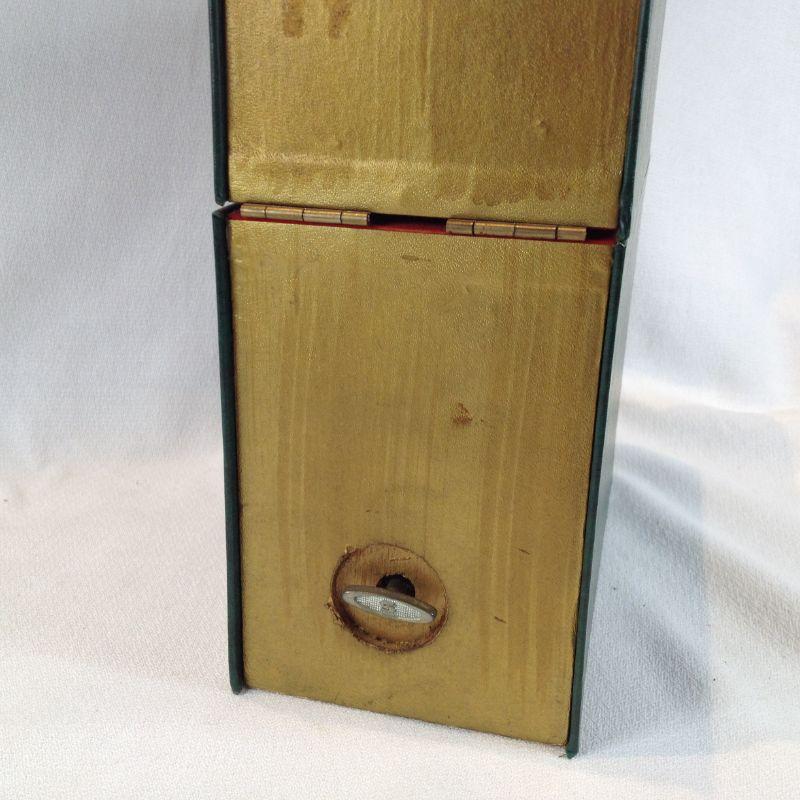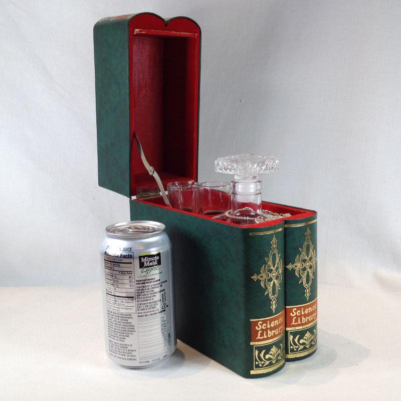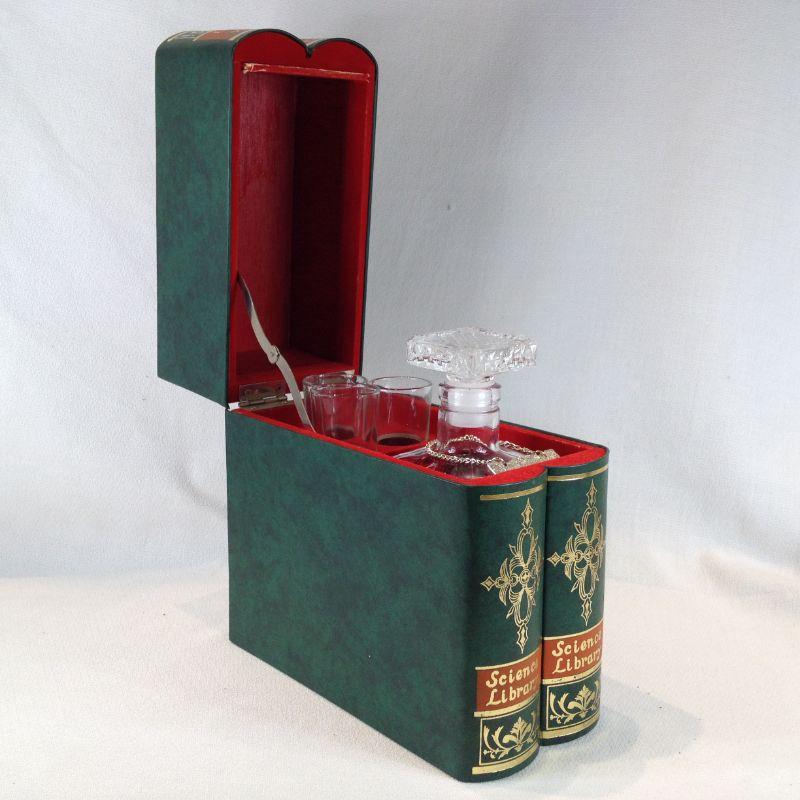 This lot is a small glass decanter with 3 glass shots nestled in a pair of fake books. Music plays when you lift out decanter. Really kind of fun. In very good condition. Book box stands 8-inches tall. We don't recognize the song it plays but it works great and would be a interesting conversation piece.