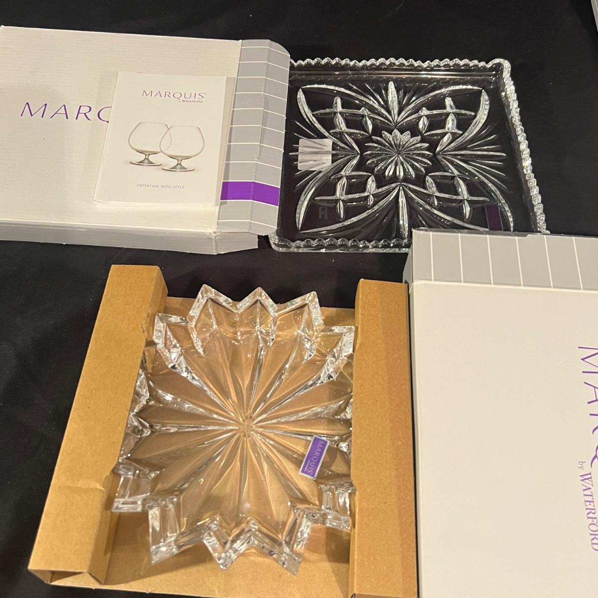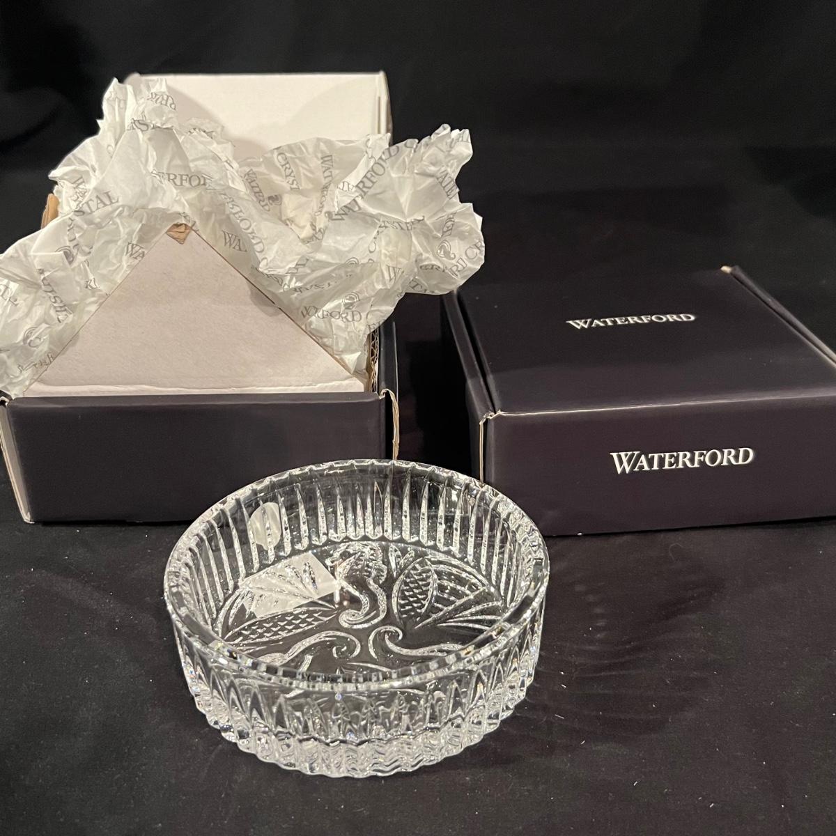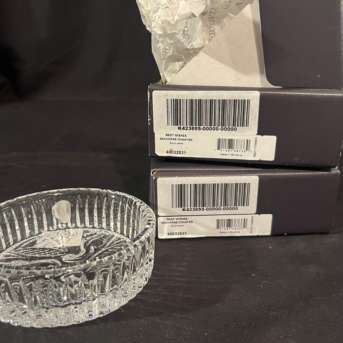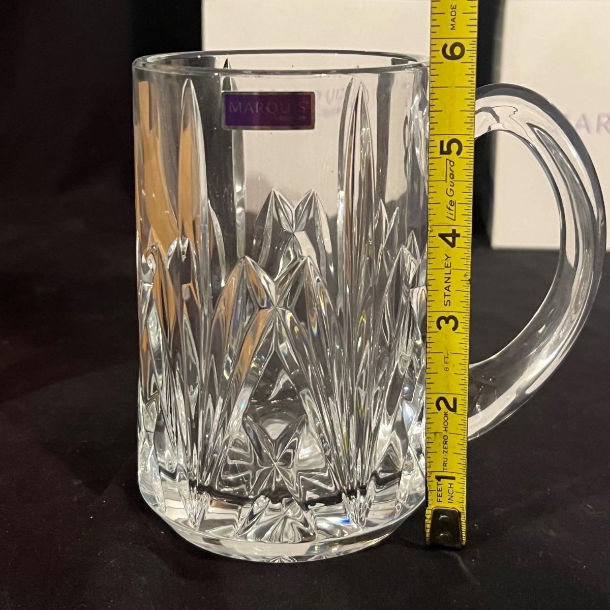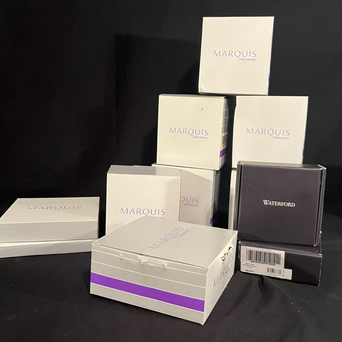 Sixteen Waterford Crystal bar items includes a tall and shorter decanters, six matching beer steins, wine bottle coaster’s, trays and more. Steins, some of the trays and coaster’s appear to be new in box (one box has minor damage); other items all have their original boxes and have been out of boxes, on display. Boxes are indicative of size of contents. Tallest decanter measures approximately 4” x 4” x 9”.