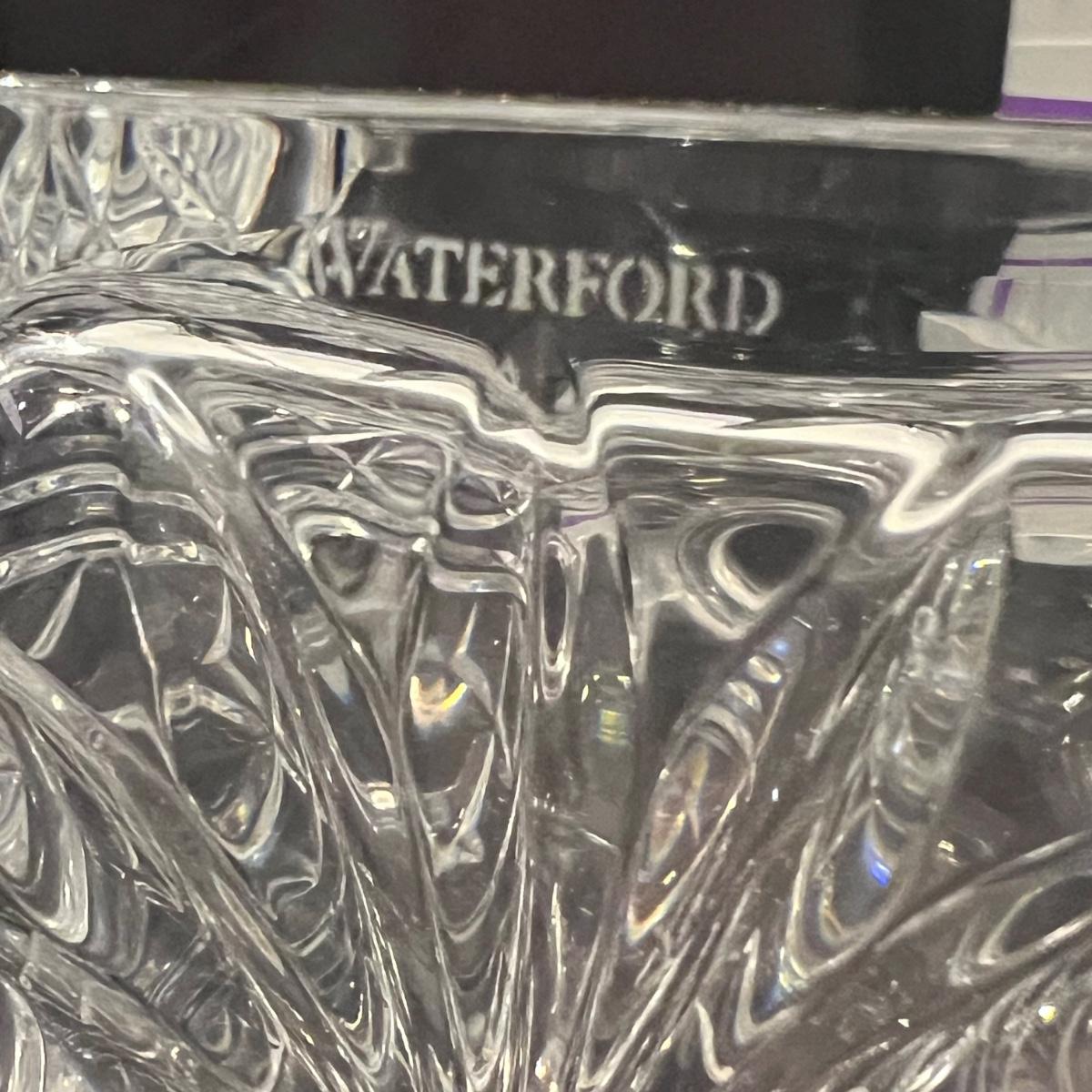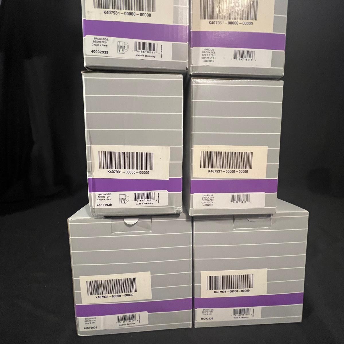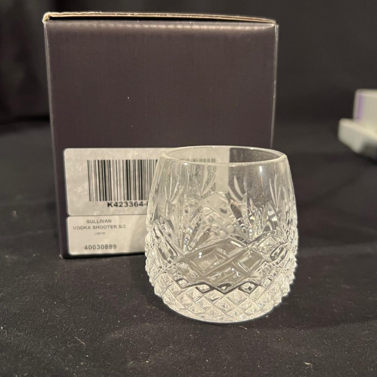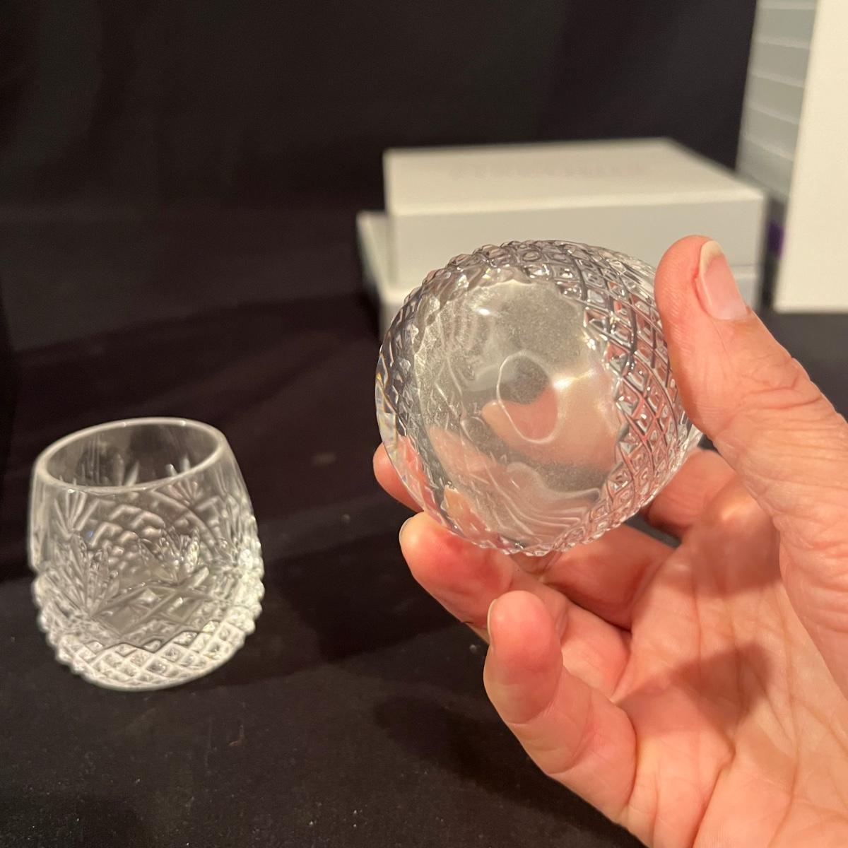 Sixteen Waterford Crystal bar items includes a tall and shorter decanters, six matching beer steins, wine bottle coaster’s, trays and more. Steins, some of the trays and coaster’s appear to be new in box (one box has minor damage); other items all have their original boxes and have been out of boxes, on display. Boxes are indicative of size of contents. Tallest decanter measures approximately 4” x 4” x 9”.