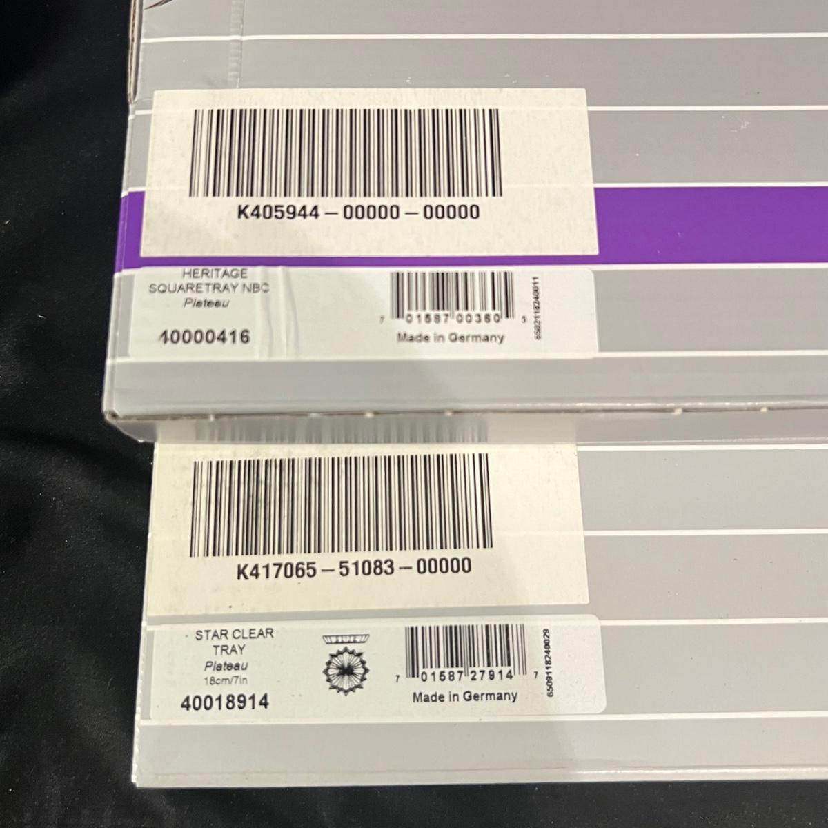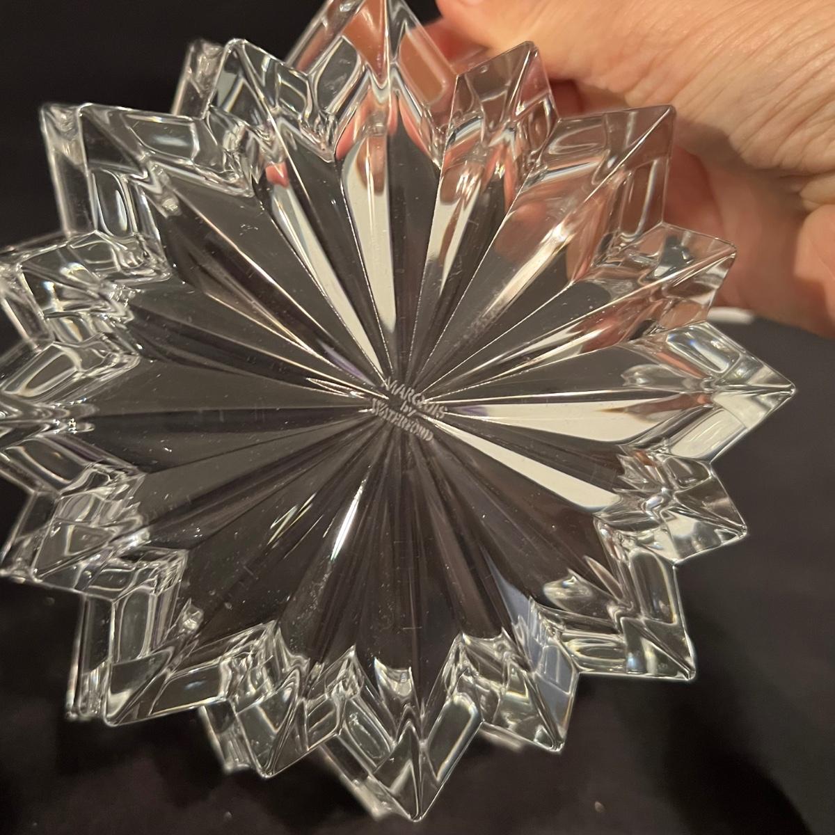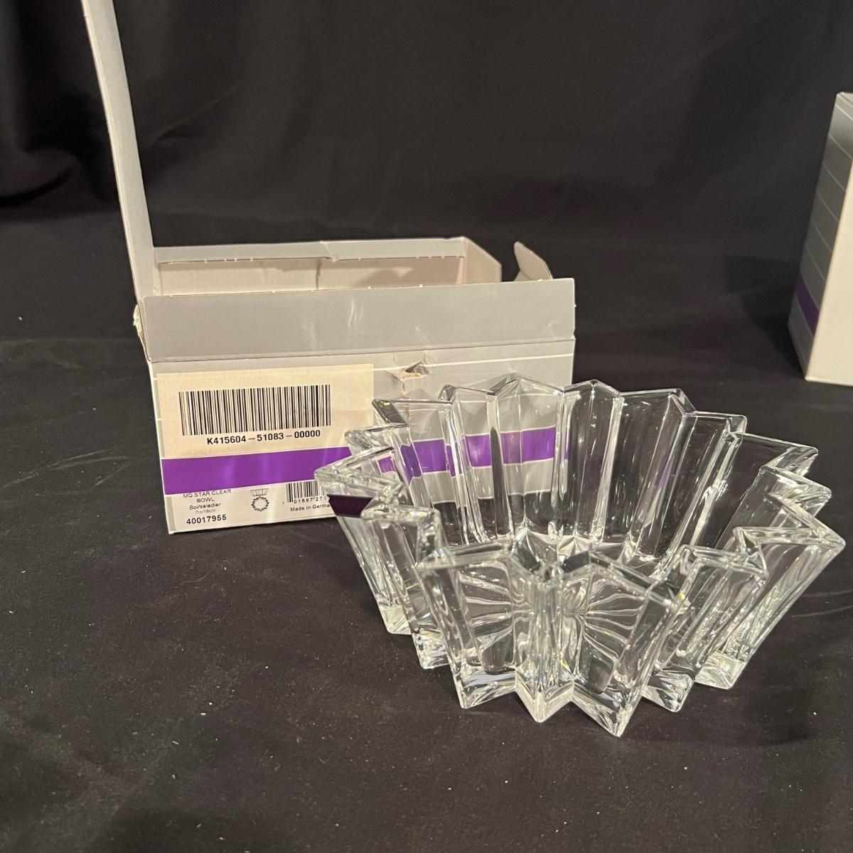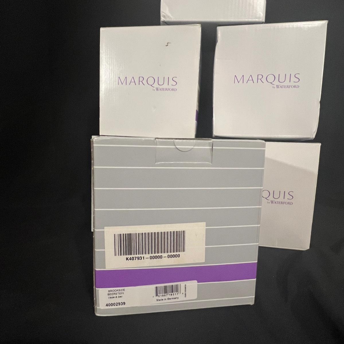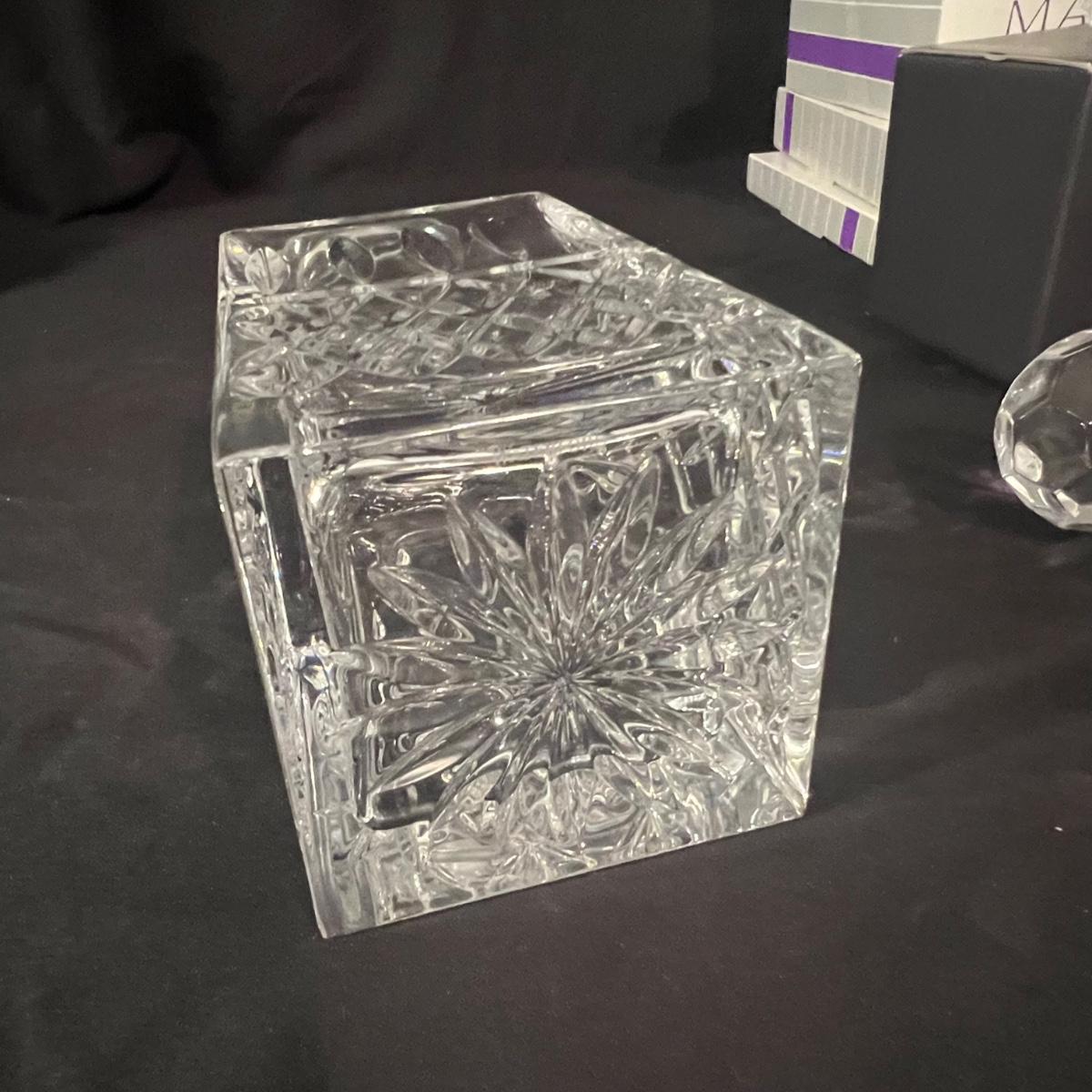 Sixteen Waterford Crystal bar items includes a tall and shorter decanters, six matching beer steins, wine bottle coaster’s, trays and more. Steins, some of the trays and coaster’s appear to be new in box (one box has minor damage); other items all have their original boxes and have been out of boxes, on display. Boxes are indicative of size of contents. Tallest decanter measures approximately 4” x 4” x 9”.