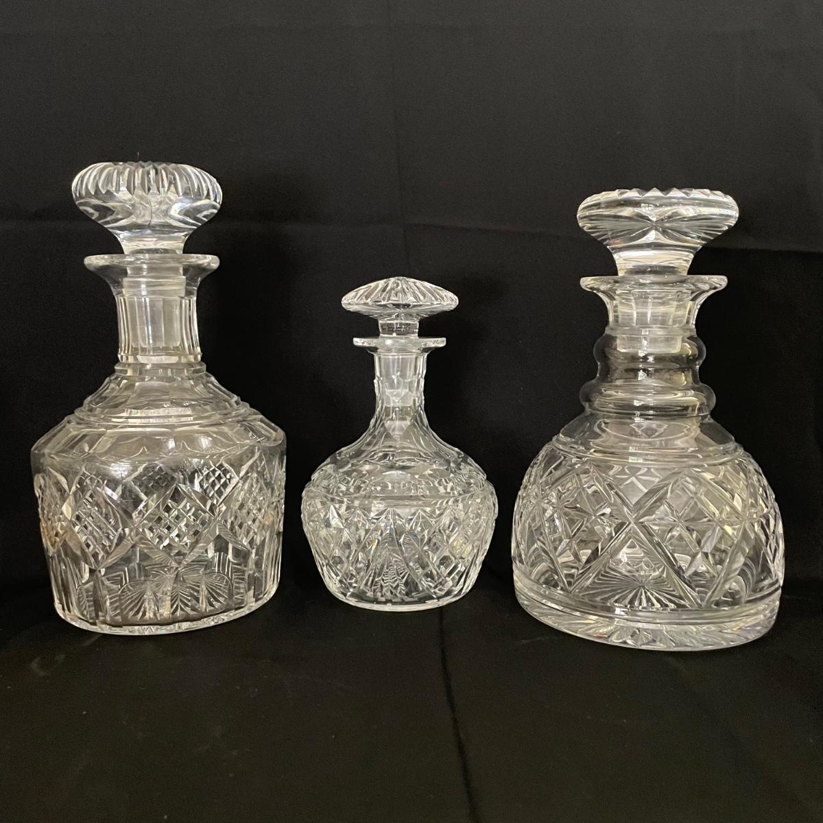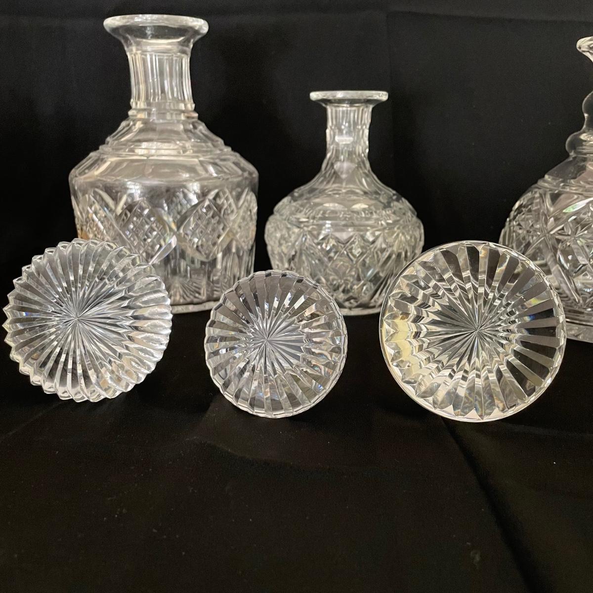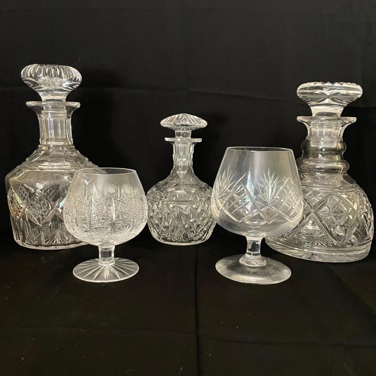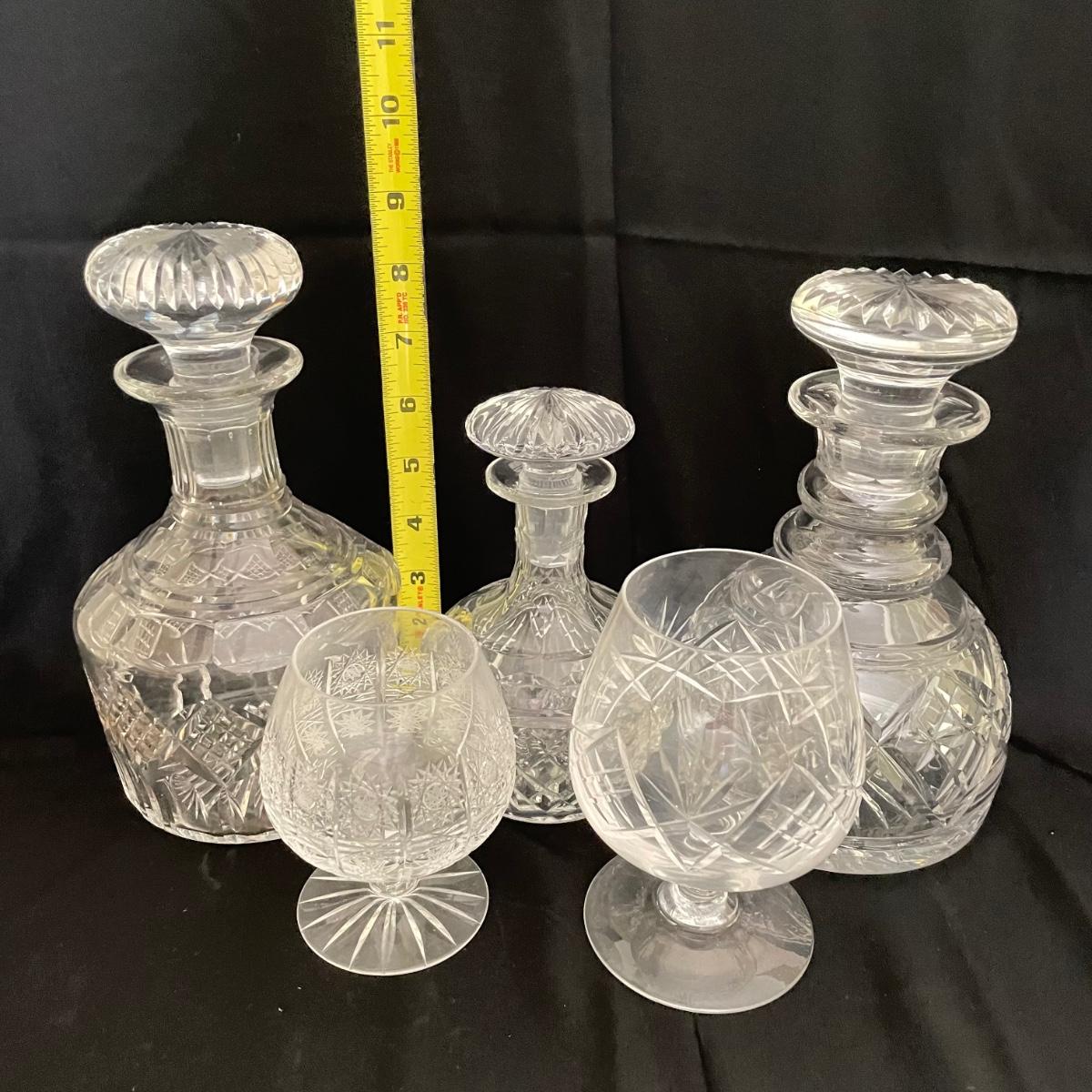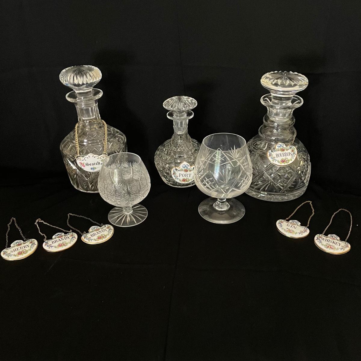 Three unique cut glass decanters with stoppers, two unique crystal snifters, and seven ceramic decanter labels by Crown Staffordshire and one by Oakley China. See images. Shipping available.