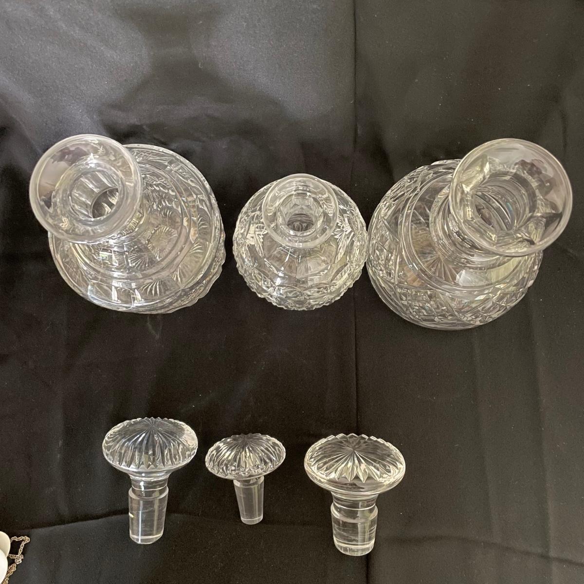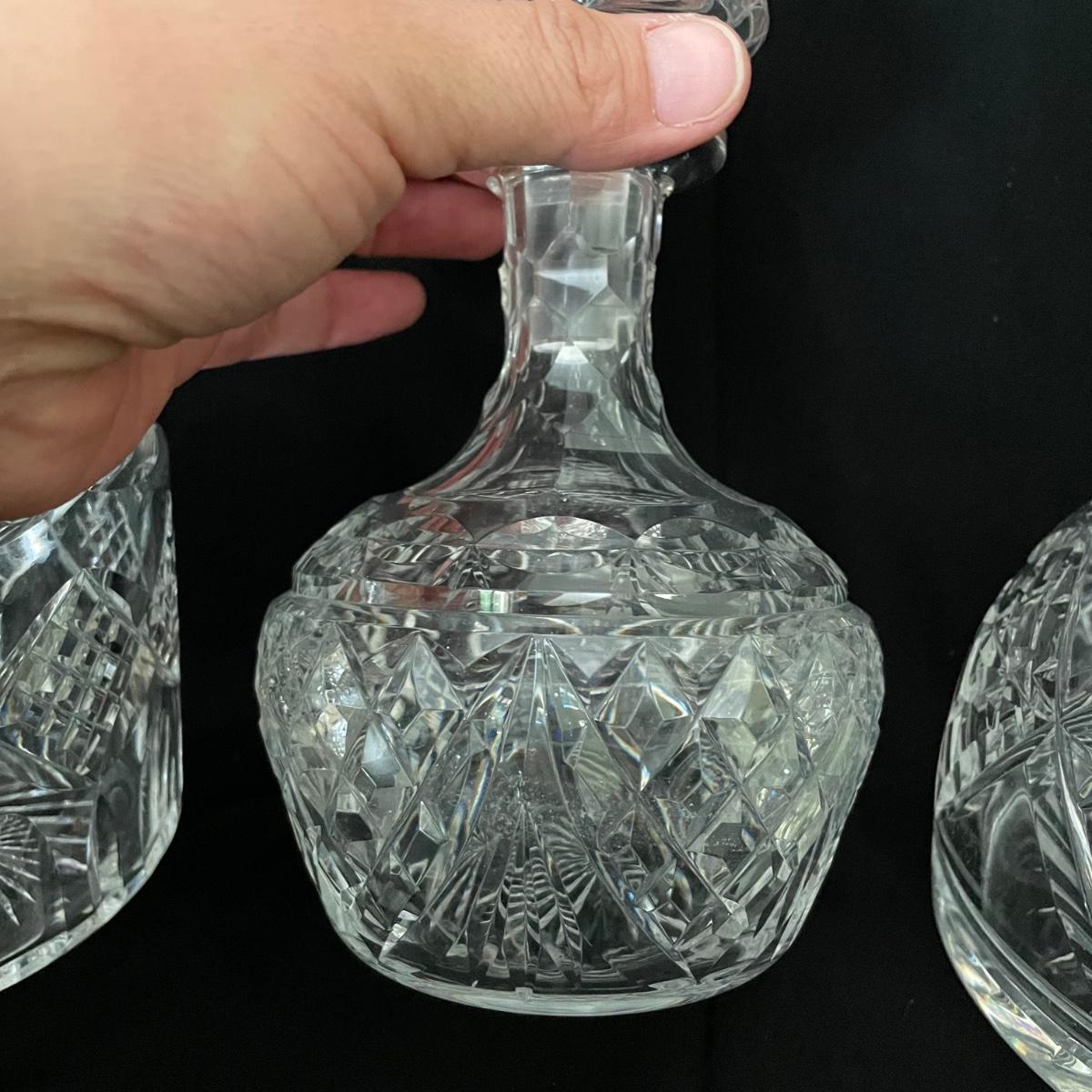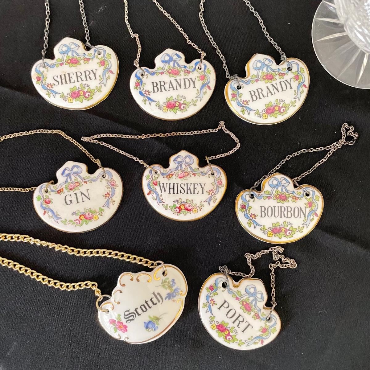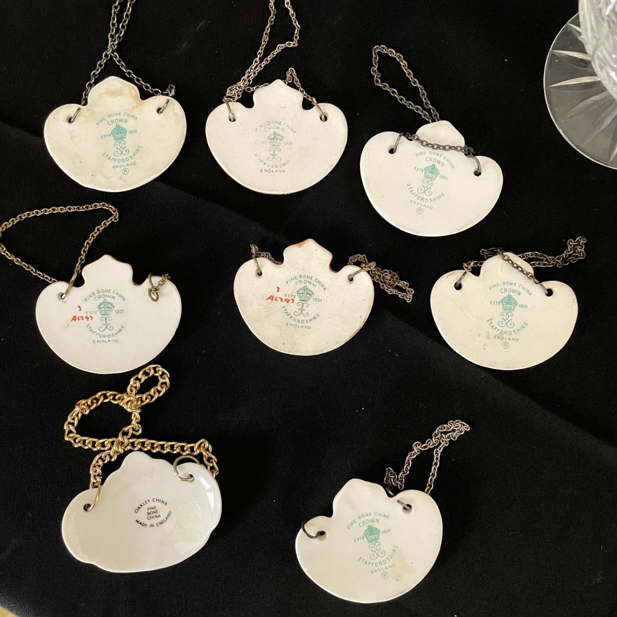 Three unique cut glass decanters with stoppers, two unique crystal snifters, and seven ceramic decanter labels by Crown Staffordshire and one by Oakley China. See images. Shipping available.