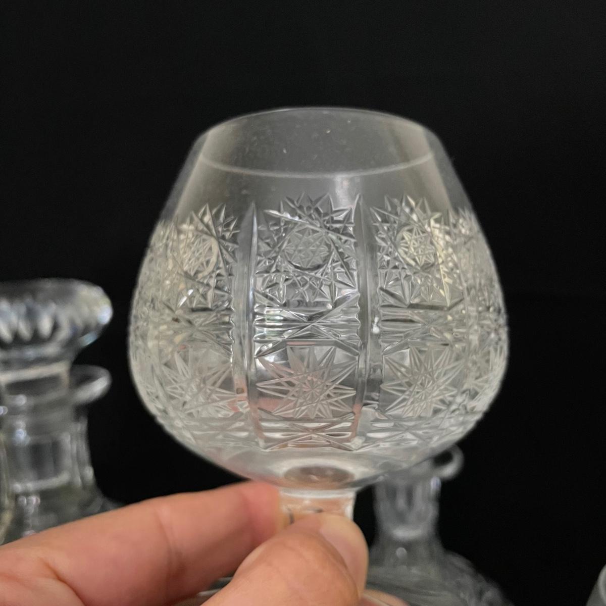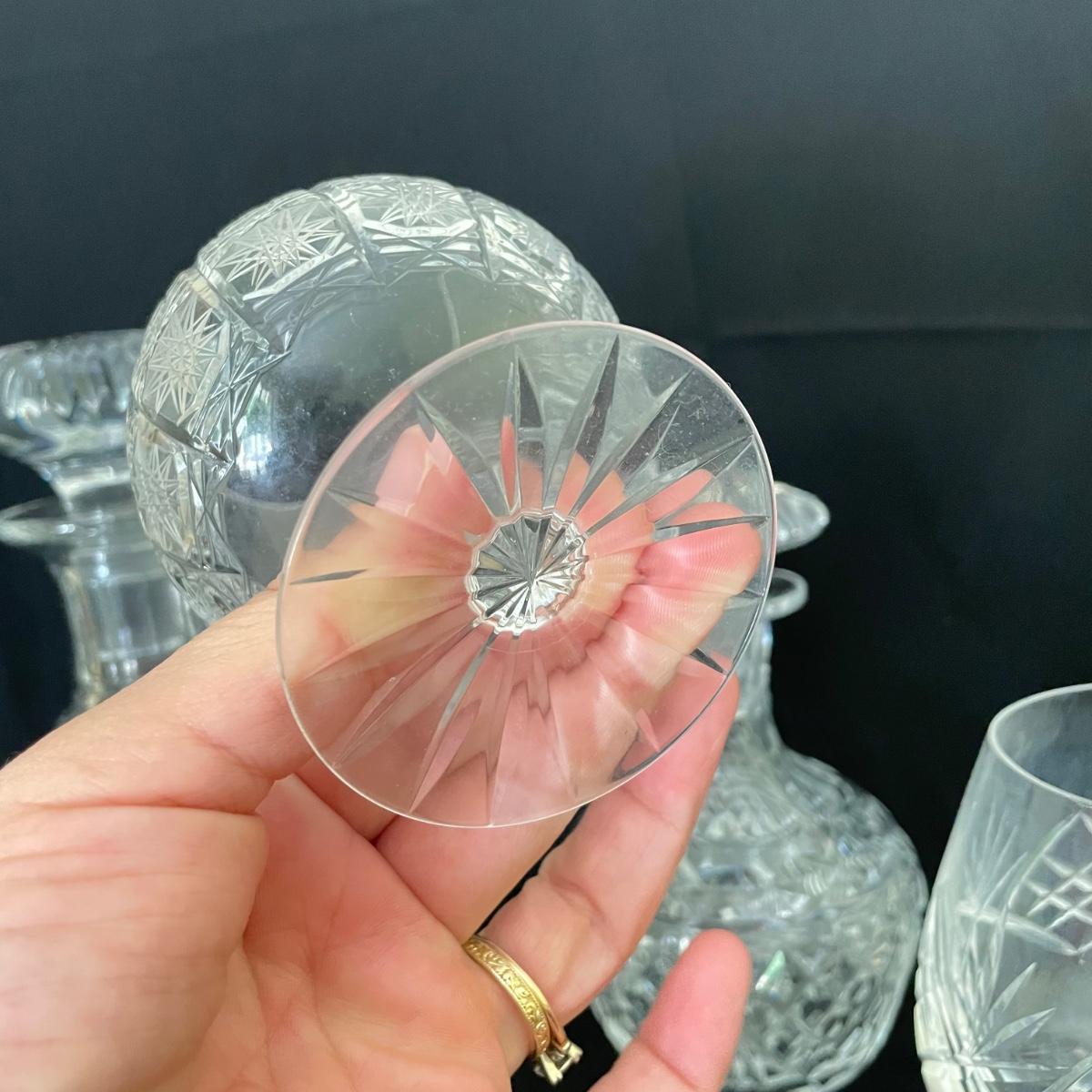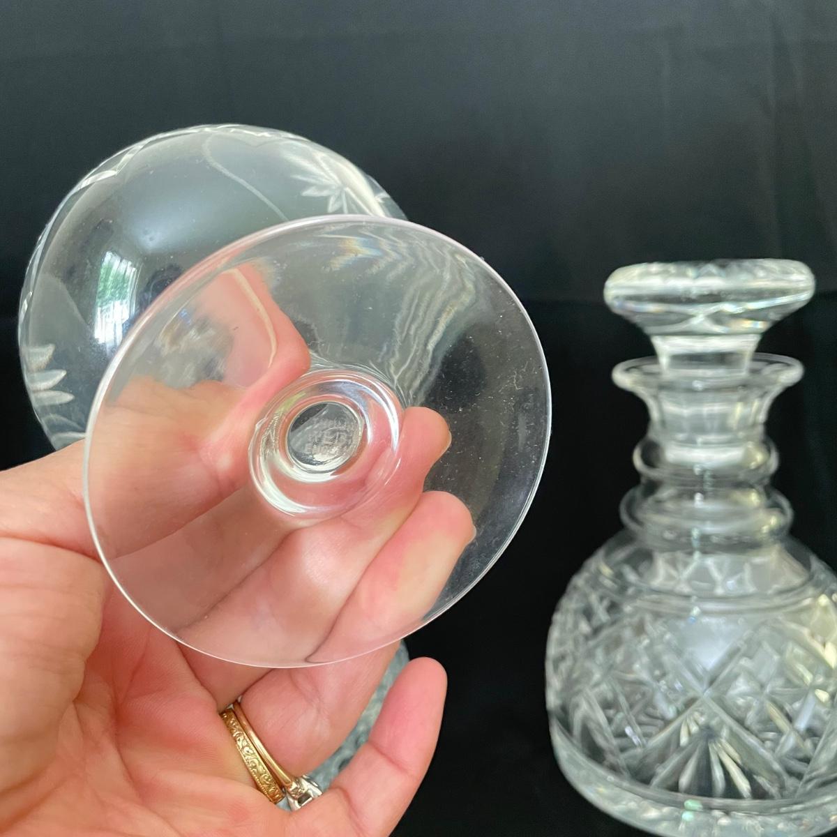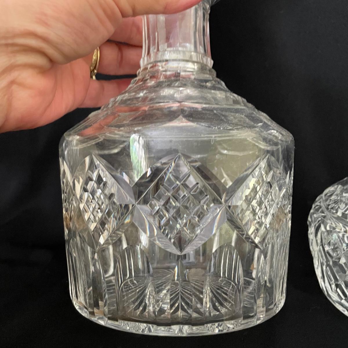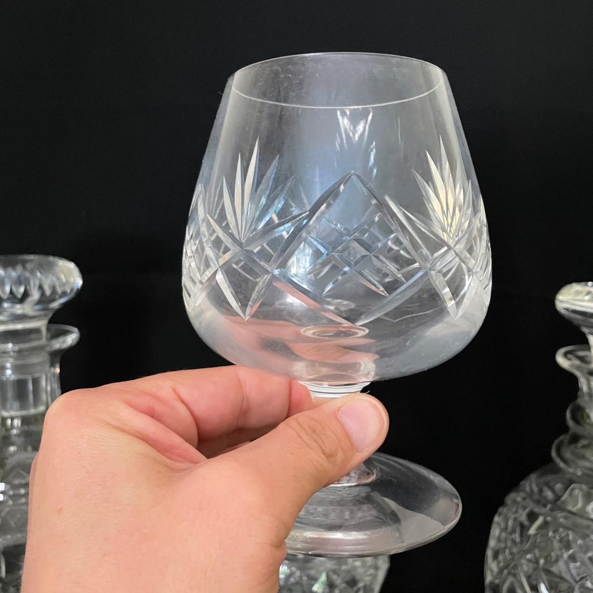 Three unique cut glass decanters with stoppers, two unique crystal snifters, and seven ceramic decanter labels by Crown Staffordshire and one by Oakley China. See images. Shipping available.