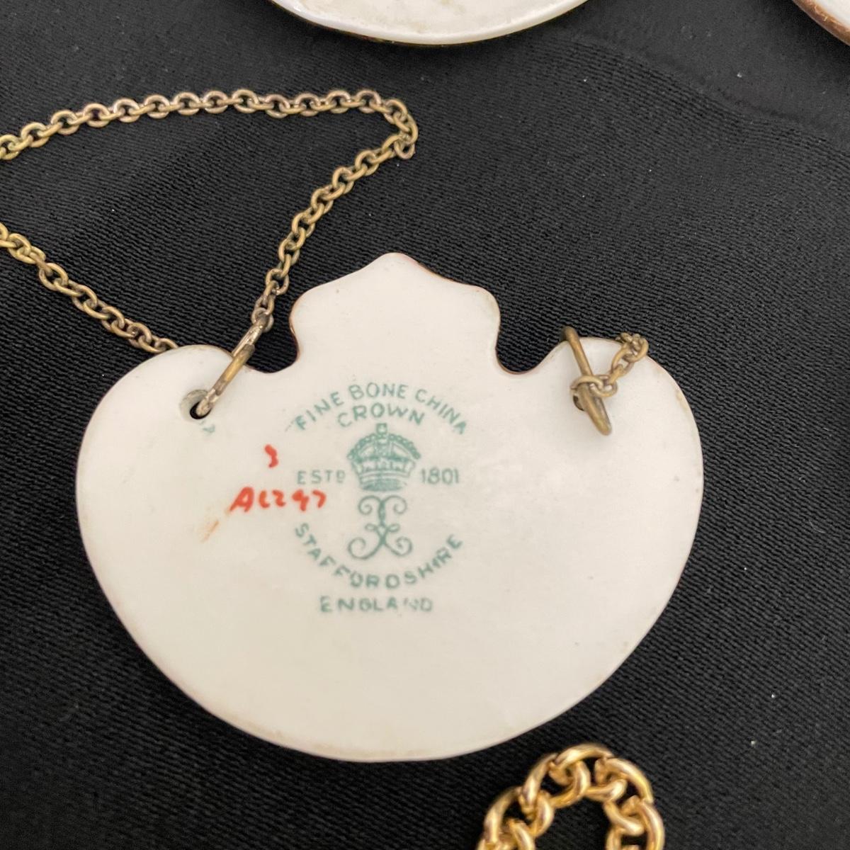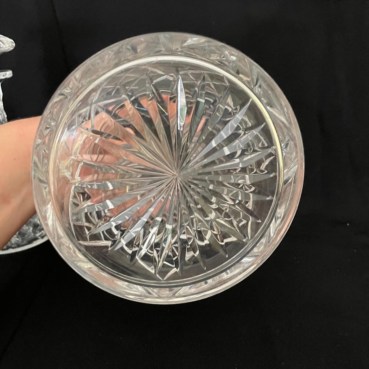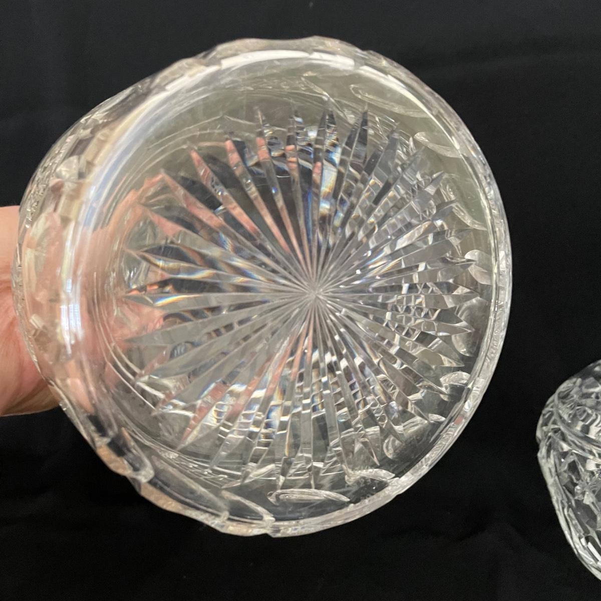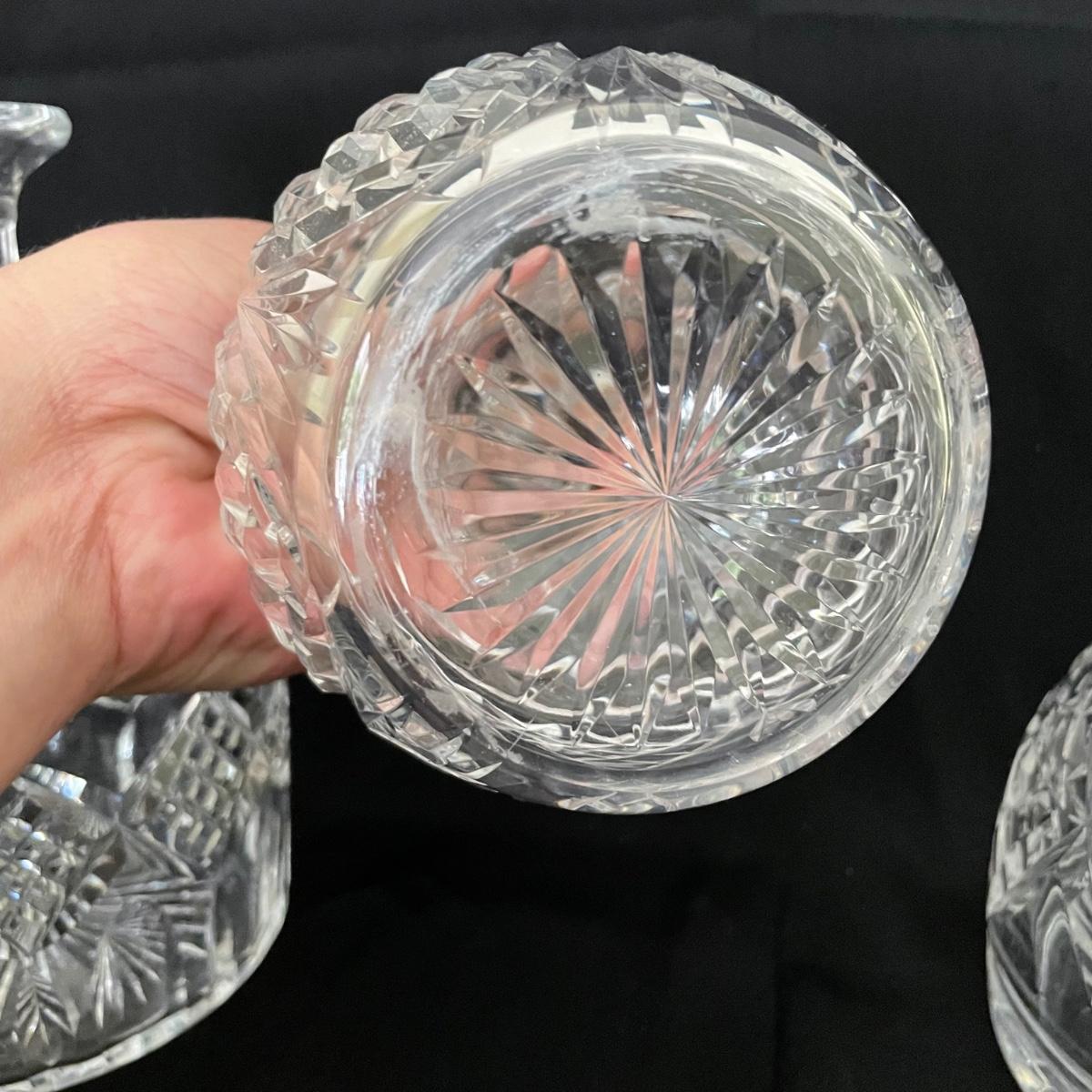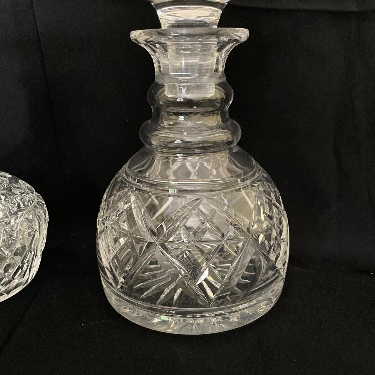 Three unique cut glass decanters with stoppers, two unique crystal snifters, and seven ceramic decanter labels by Crown Staffordshire and one by Oakley China. See images. Shipping available.