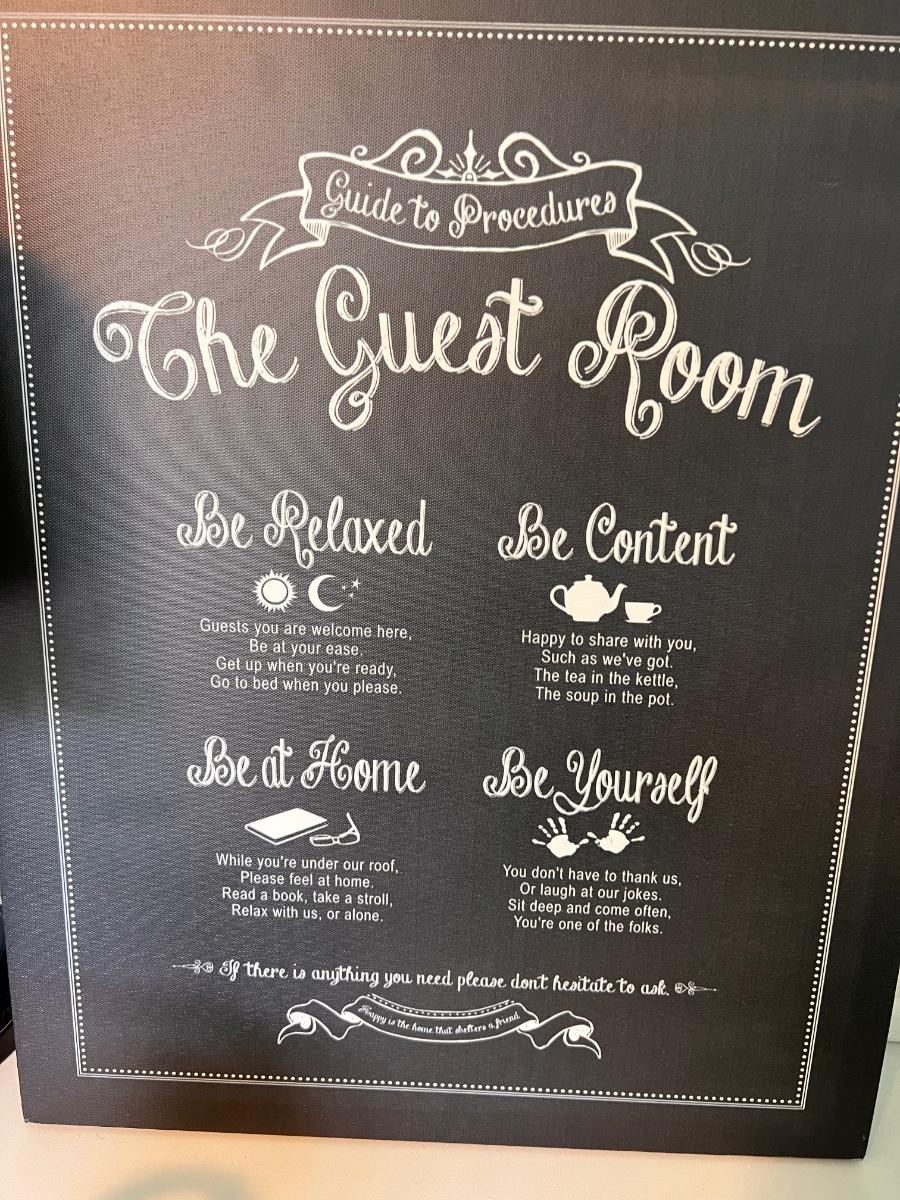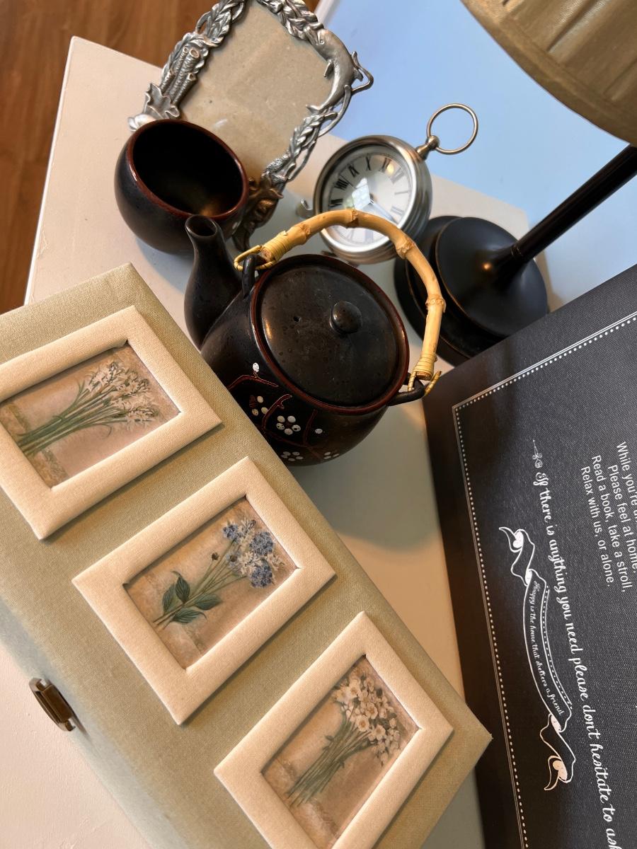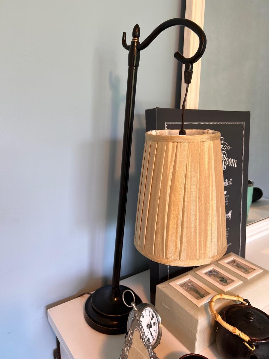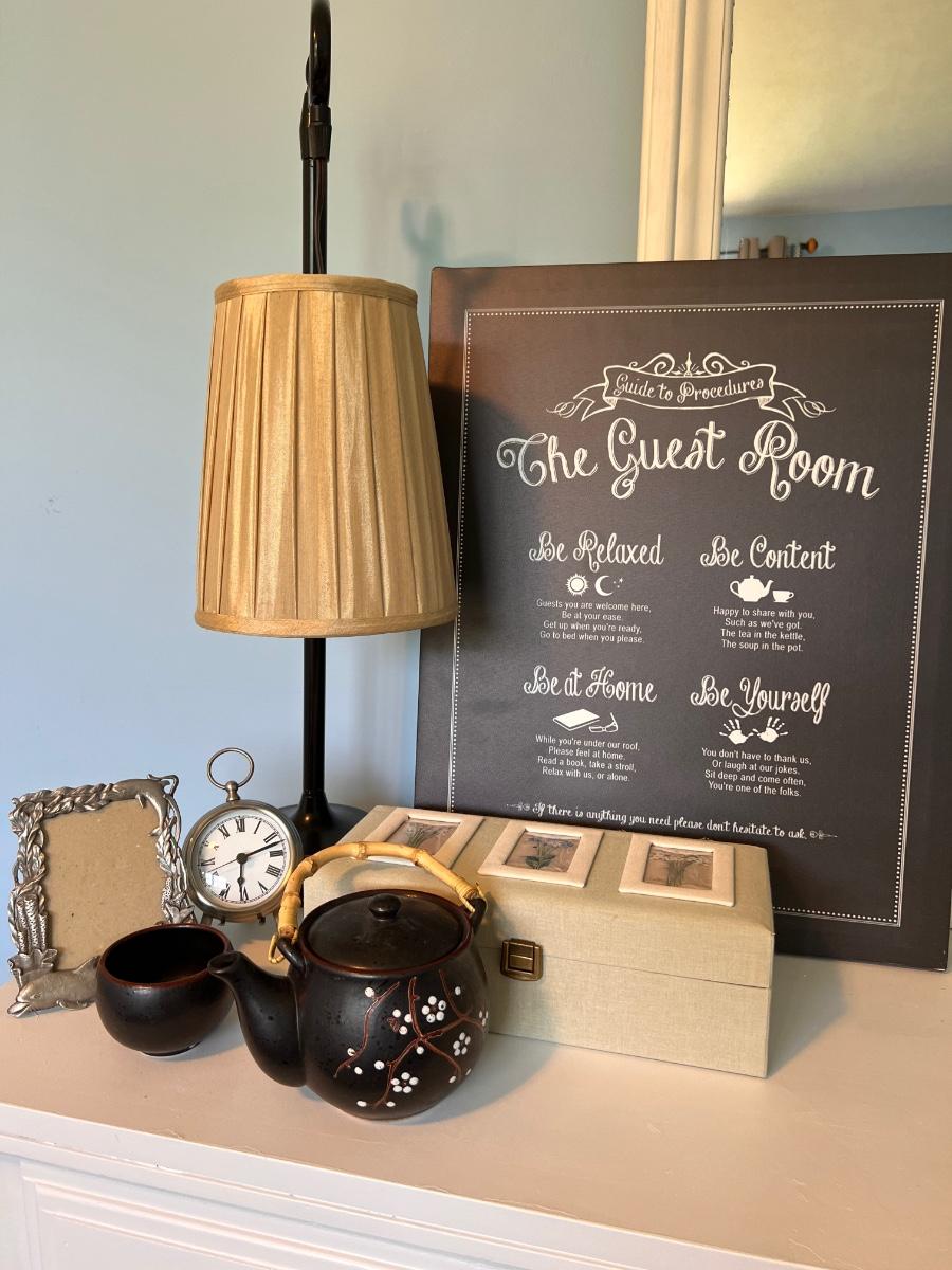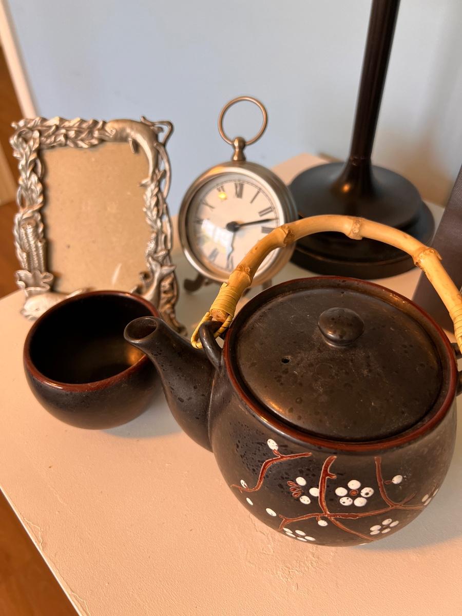 Swing arm metal lamp, battery operated clock, guest room art canvas, decorative pottery tea pot and cup, fabric covered box.