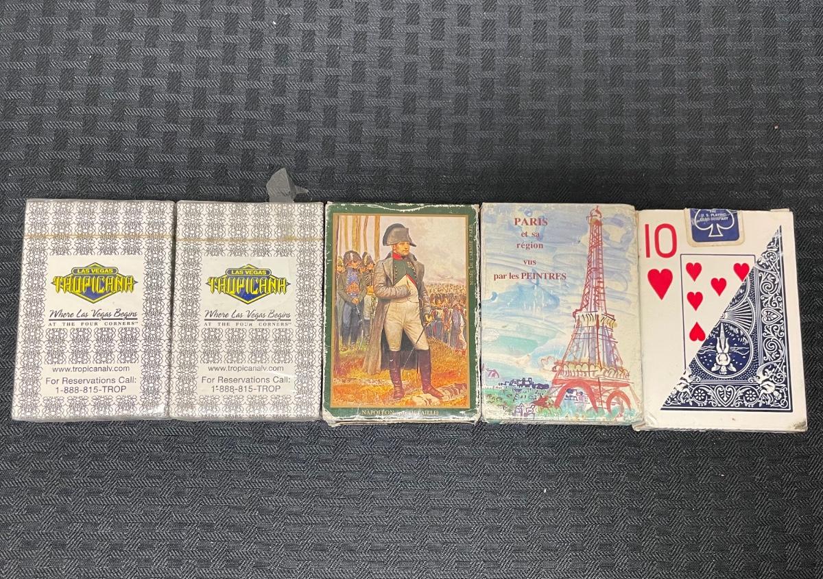 This set comes with five different decks of cards. It includes: two Las Vegas Tropicana decks, one Napoleon deck, one Paris et sa région vus par les peintres deck, and one jumbo index playing card deck. All cards are in great condition and some have no even been opened.