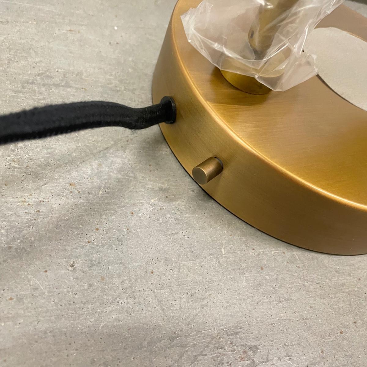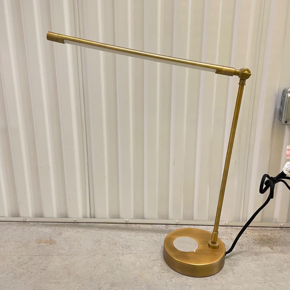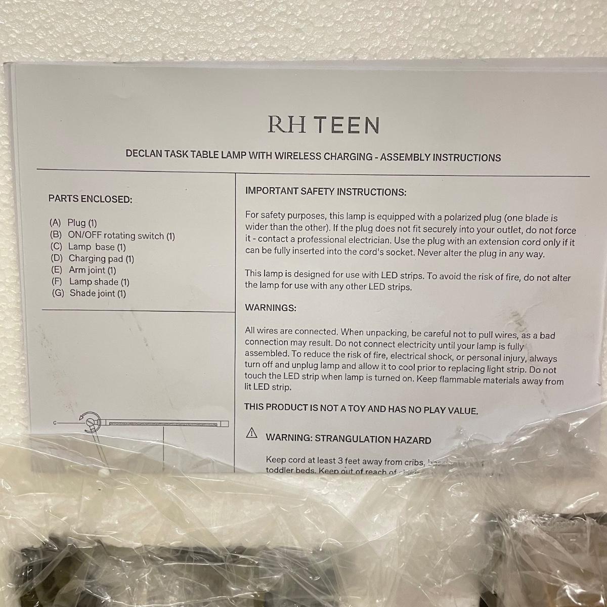 Brass colored metal Declan Task Table Lamp with wireless charging pad. Lamp powered on when plugged in, it appears to be new-in-box. Lamp has a jointed arm to adjust light angle. As shown in photos, it measures 19” x 20”H with a 6.75”D base. The charger was only briefly tested, the phone used flickered to charge, but did not stay charging. See images. Lamp comes with box with styrofoam packaging and safety instructions. Shipping available.