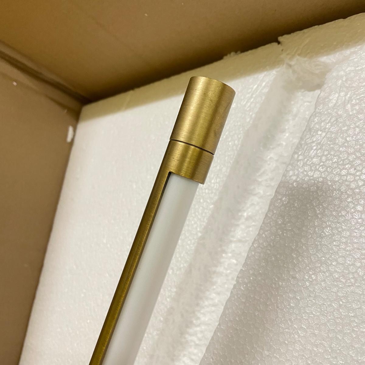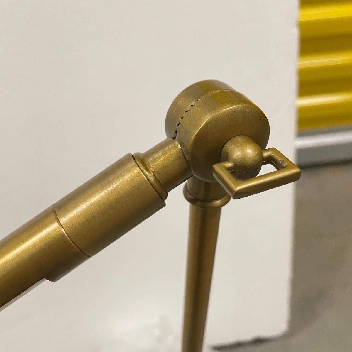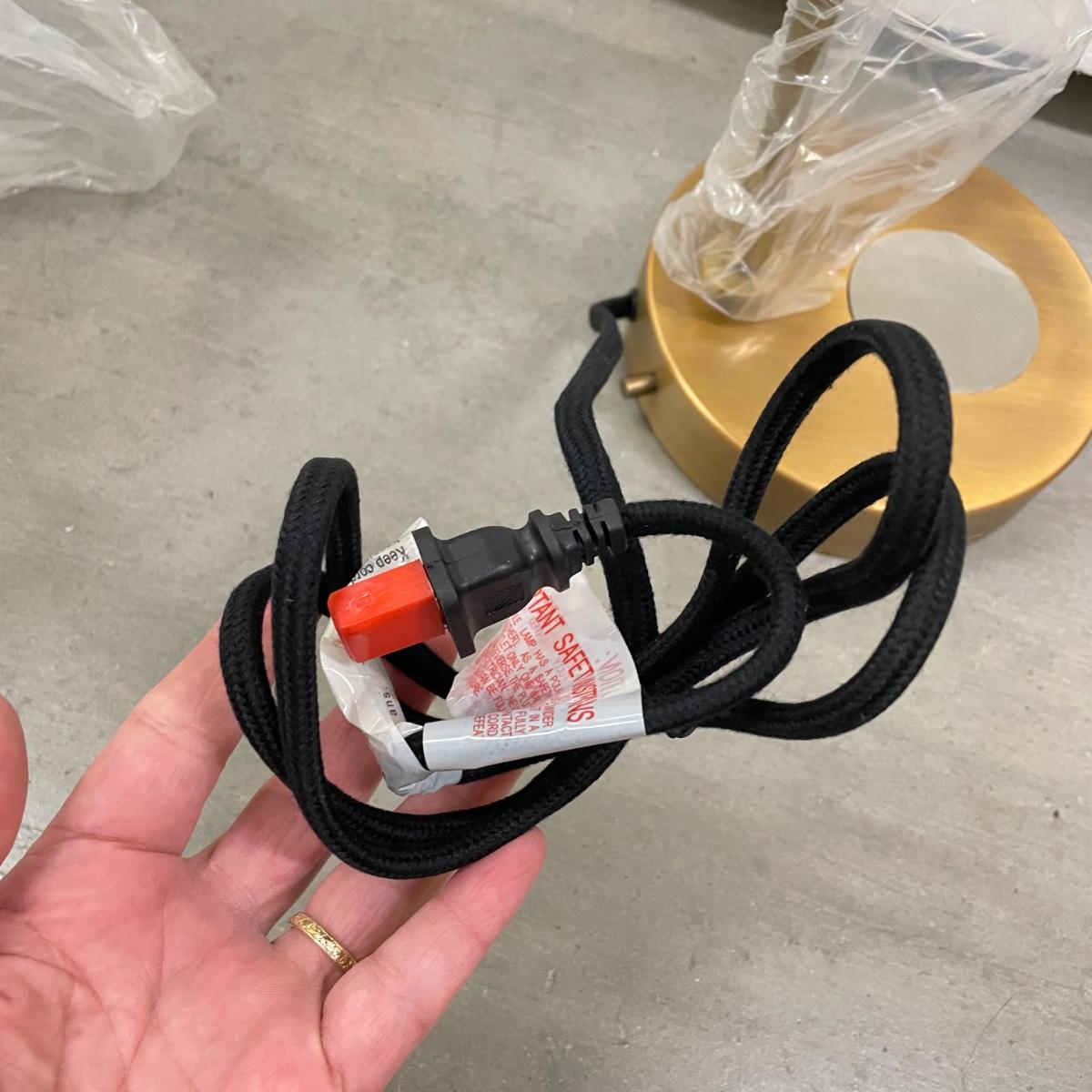 Brass colored metal Declan Task Table Lamp with wireless charging pad. Lamp powered on when plugged in, it appears to be new-in-box. Lamp has a jointed arm to adjust light angle. As shown in photos, it measures 19” x 20”H with a 6.75”D base. The charger was only briefly tested, the phone used flickered to charge, but did not stay charging. See images. Lamp comes with box with styrofoam packaging and safety instructions. Shipping available.