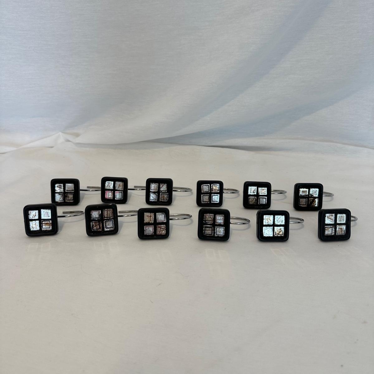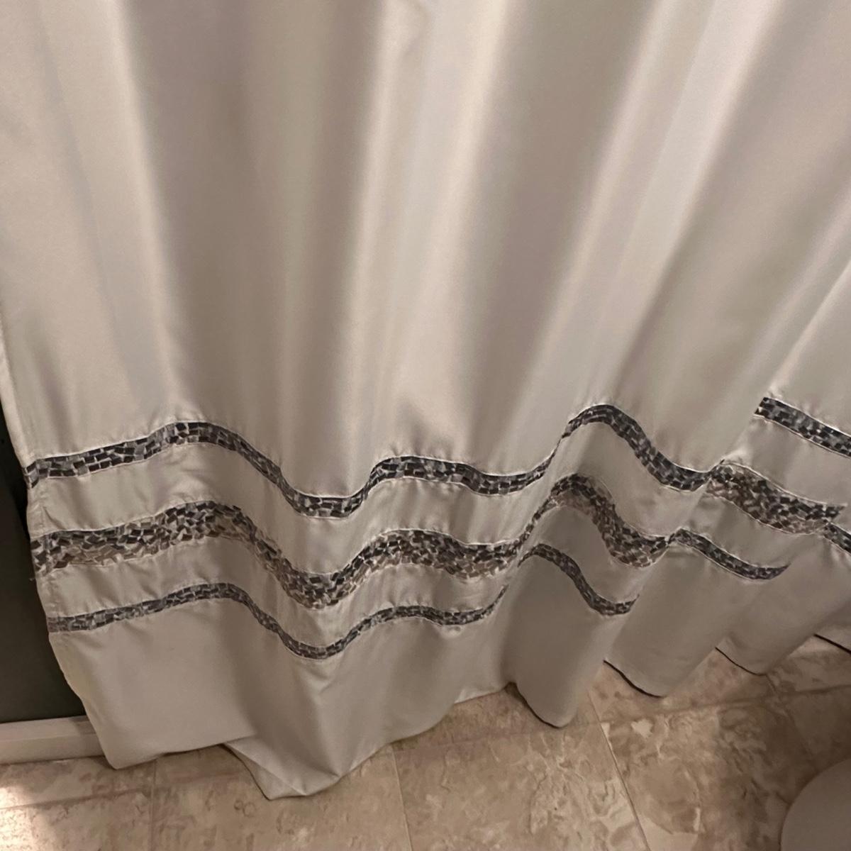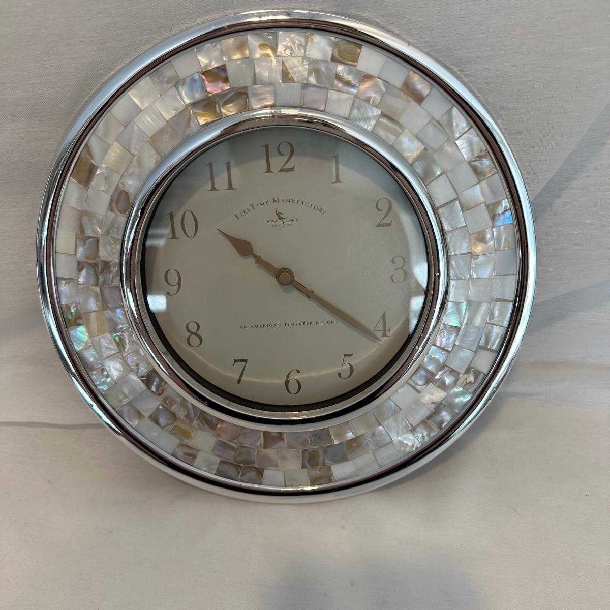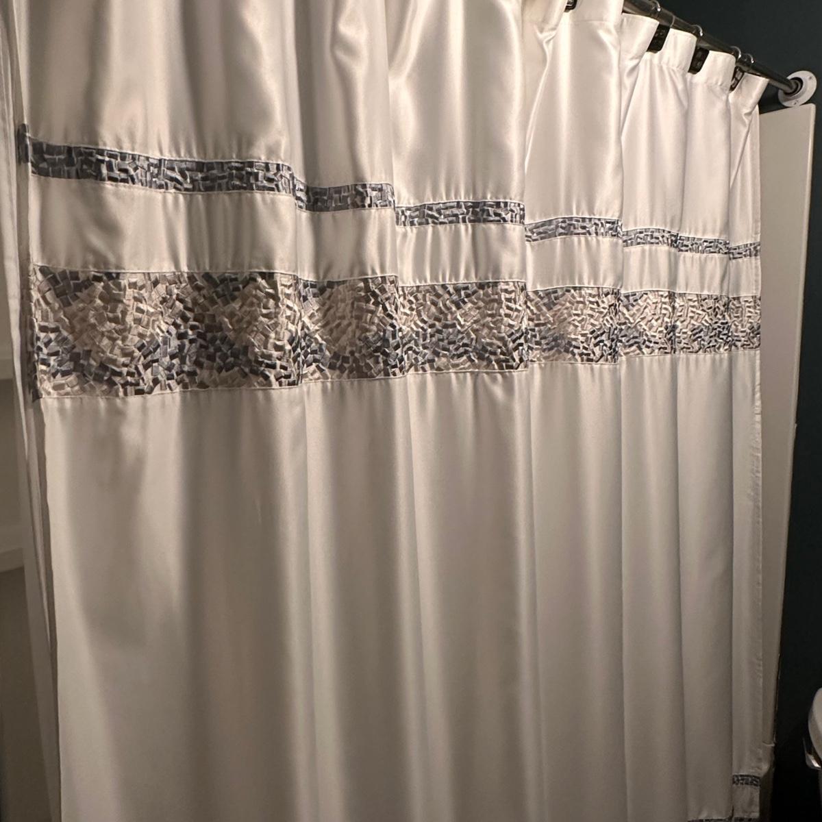DecoBain 100% polyester shower curtain with attached, weighted liner measures 72” X 72”. First Time Manufactory round clock is 10.5”W, is in working condition on batteries. Includes 12 shower curtain hangers. Shipping available.