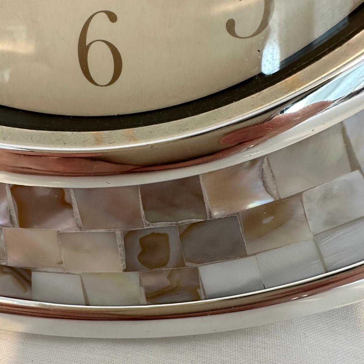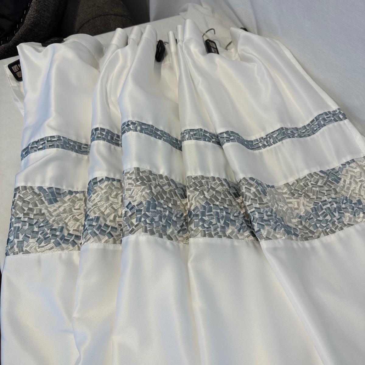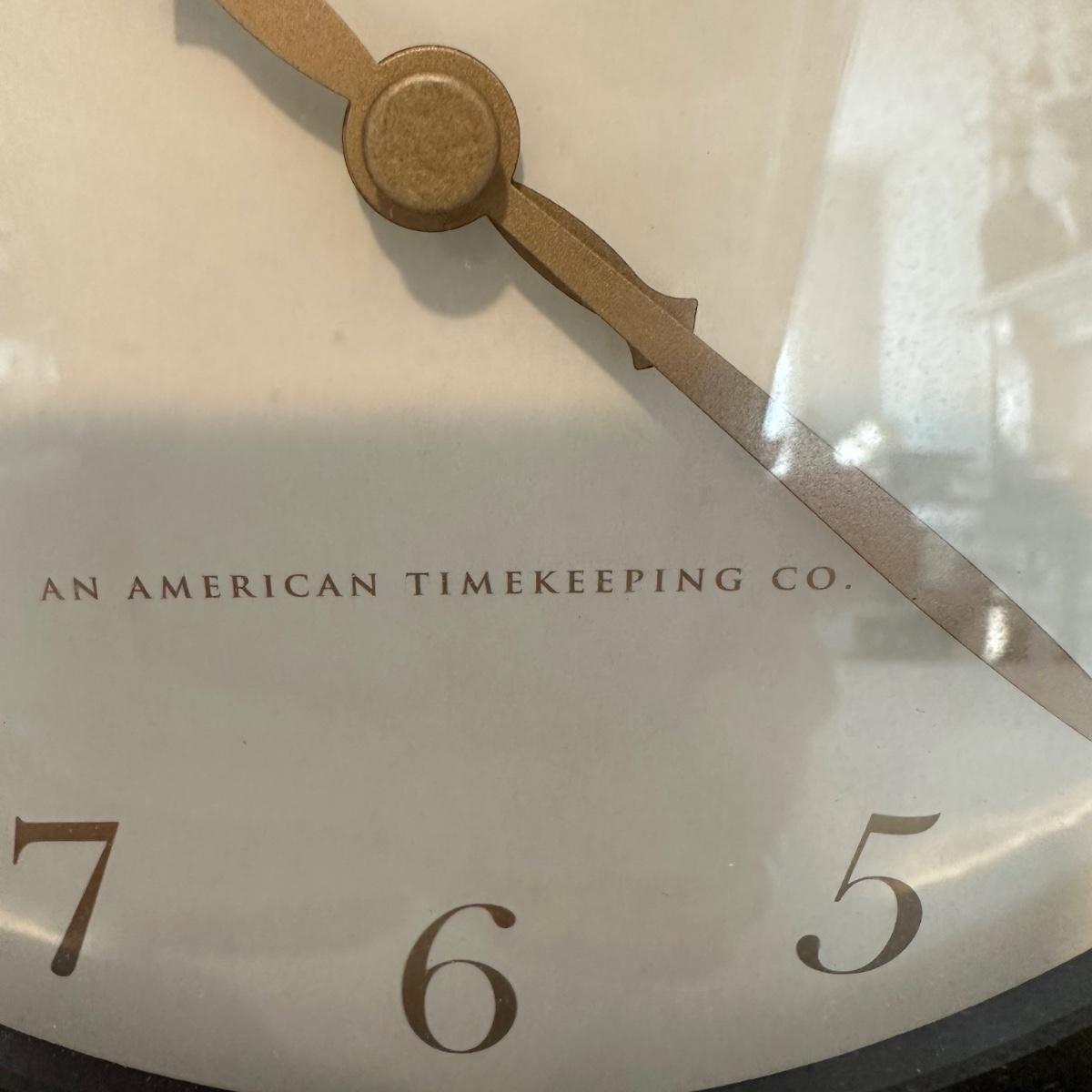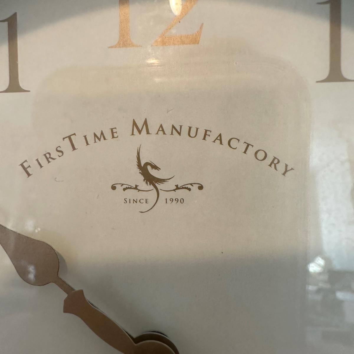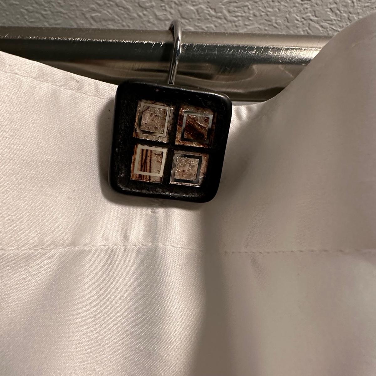 DecoBain 100% polyester shower curtain with attached, weighted liner measures 72” X 72”. First Time Manufactory round clock is 10.5”W, is in working condition on batteries. Includes 12 shower curtain hangers. Shipping available.