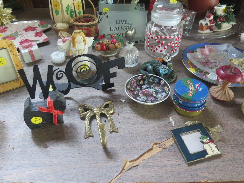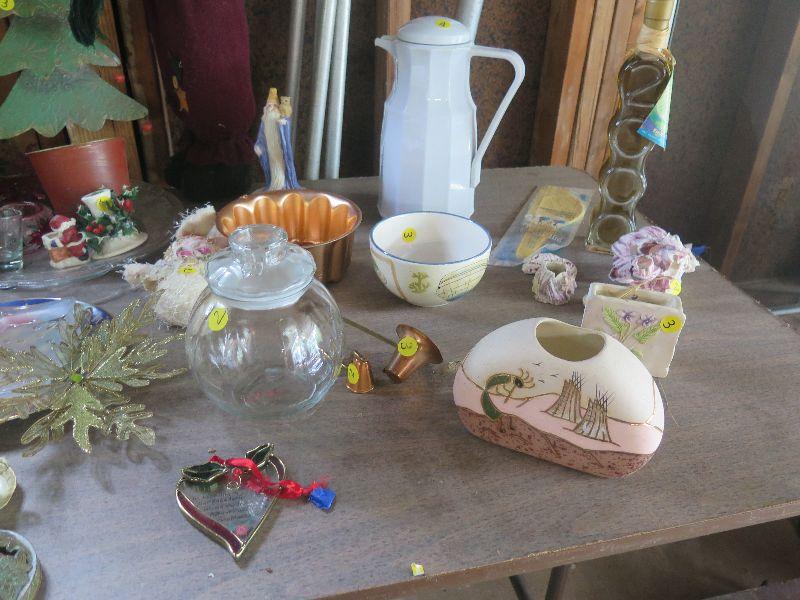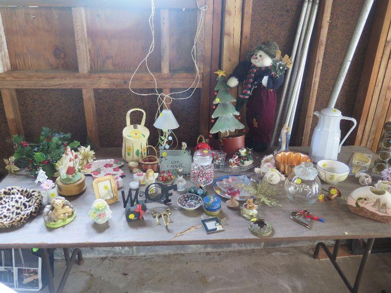 Christmas decorations, music box, picture frames, vases, carafe, and more.
