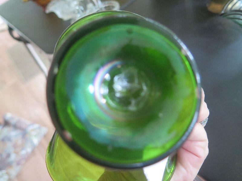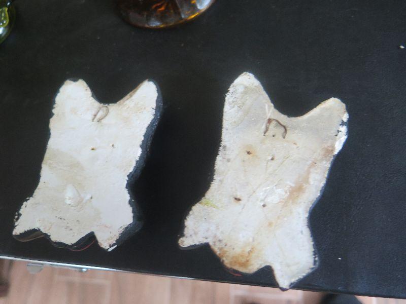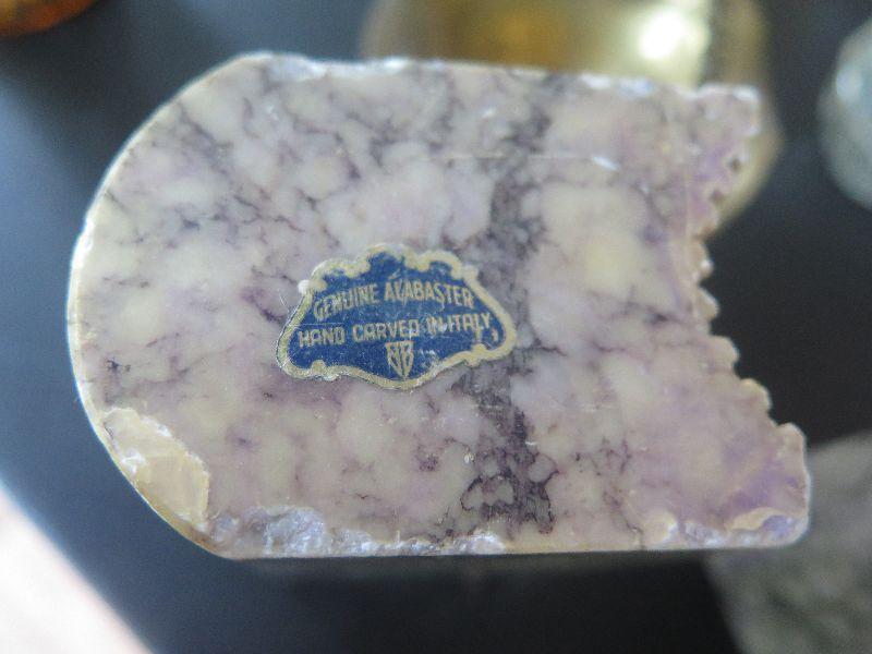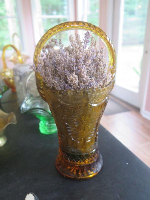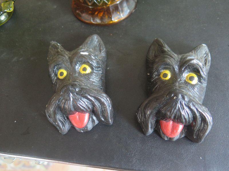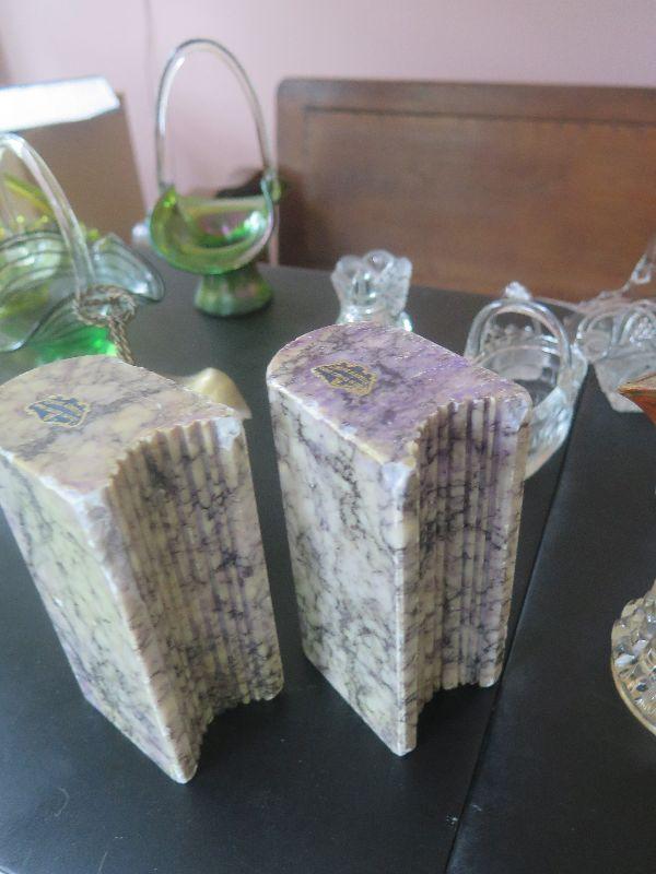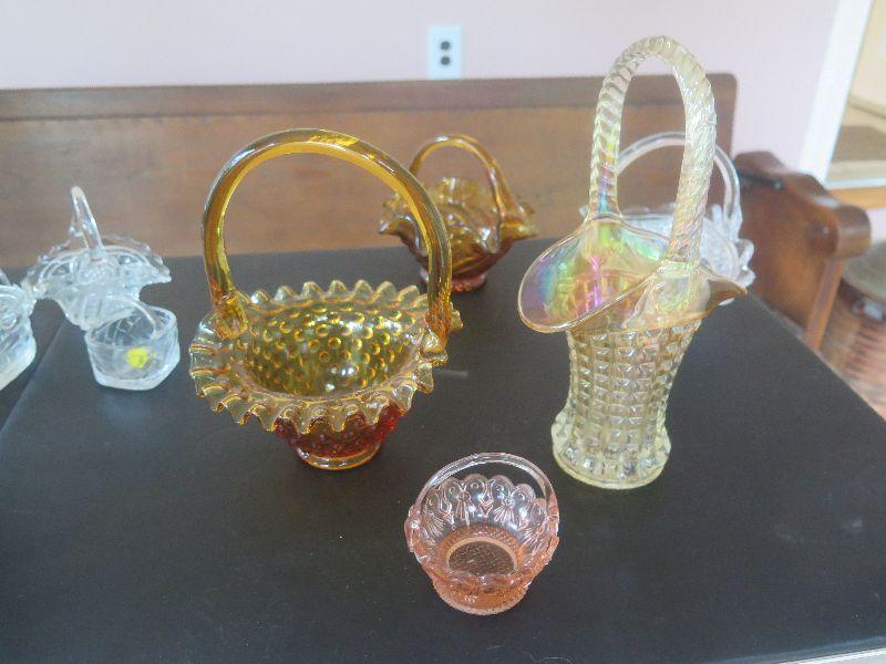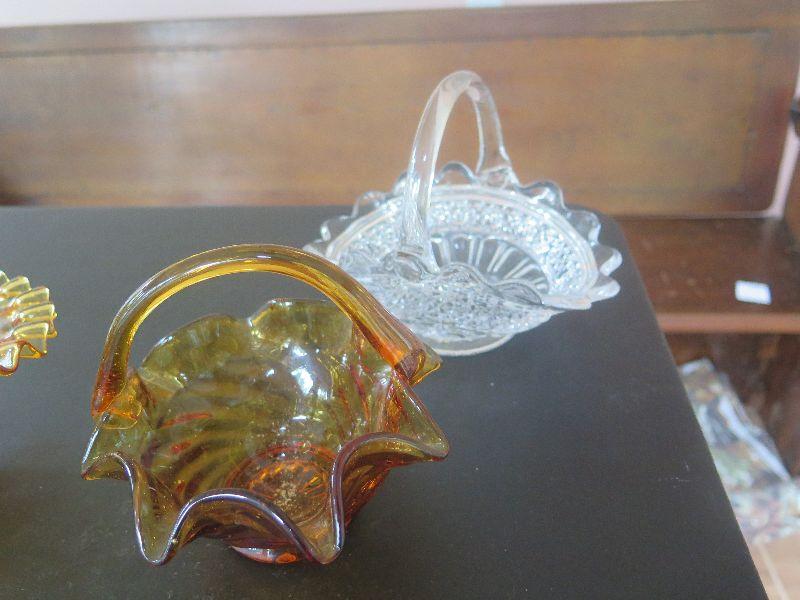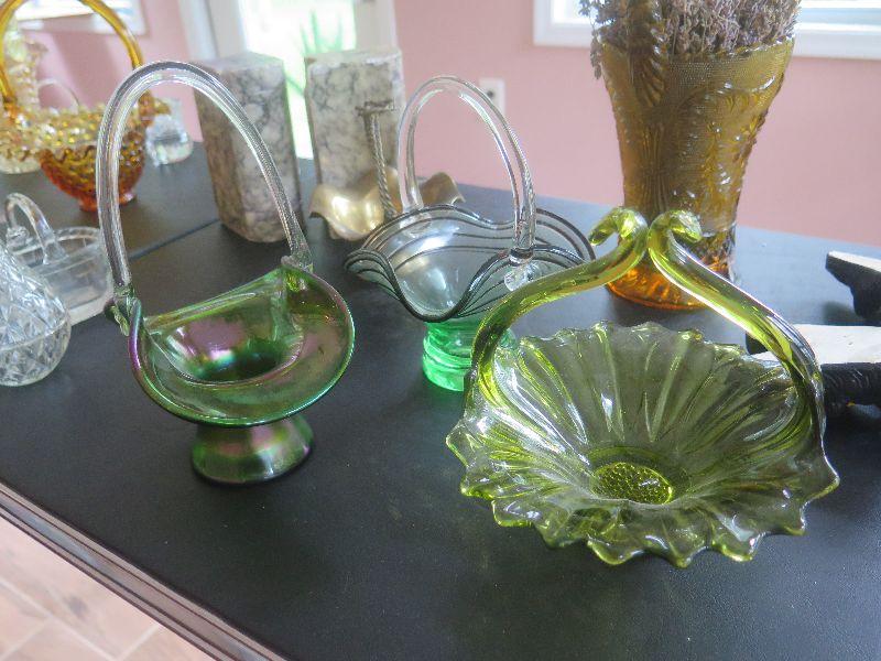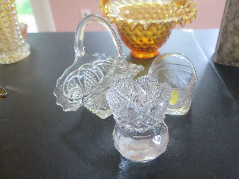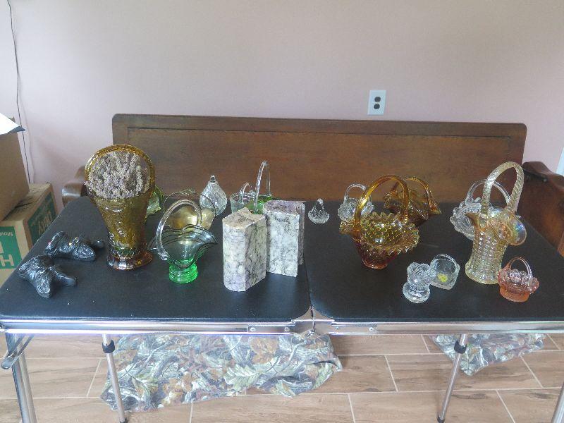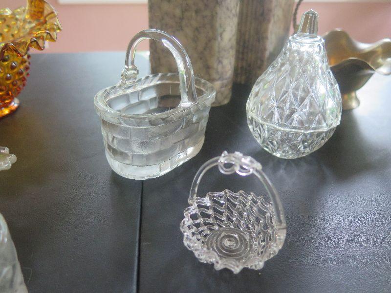 Hobnail basket, crystal and glass baskets, amber pressed glass vase, vintage chalkware dogs, alabaster bookends, damage noted, and more. Bring box to remove.