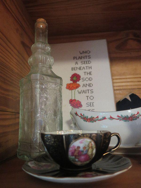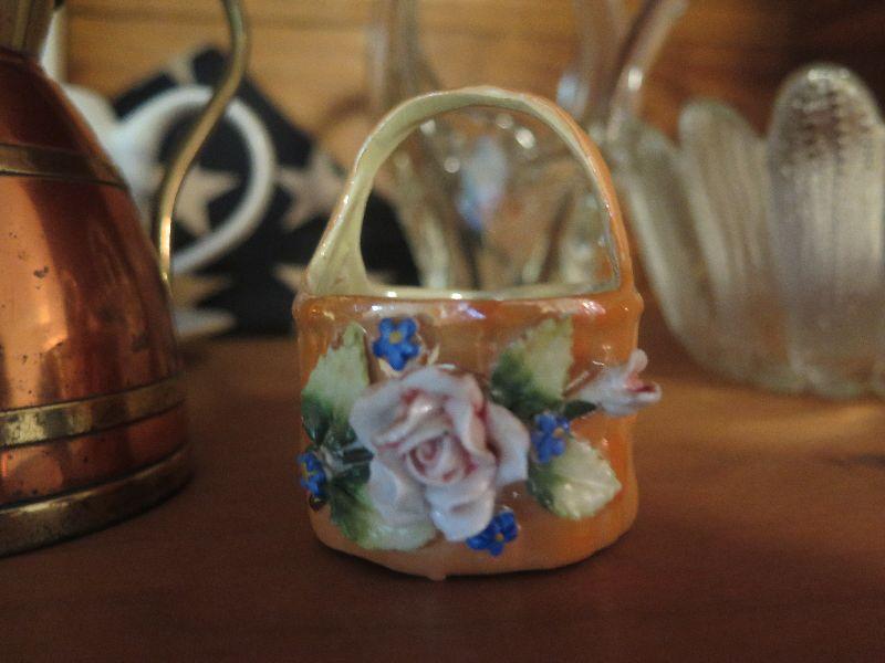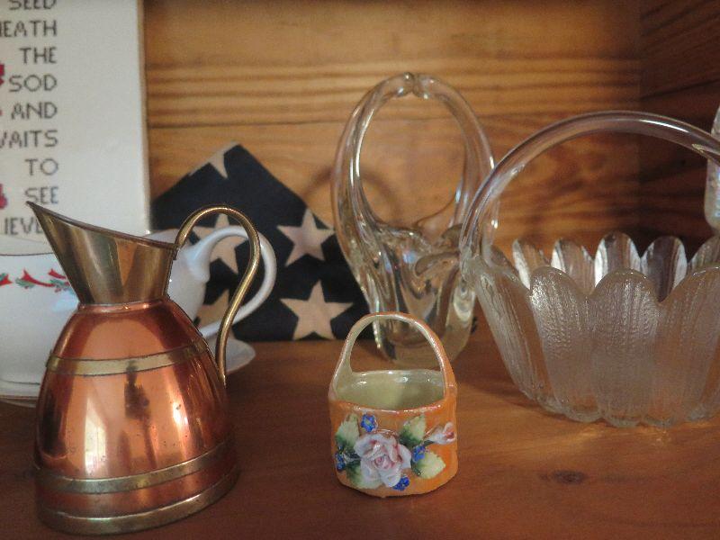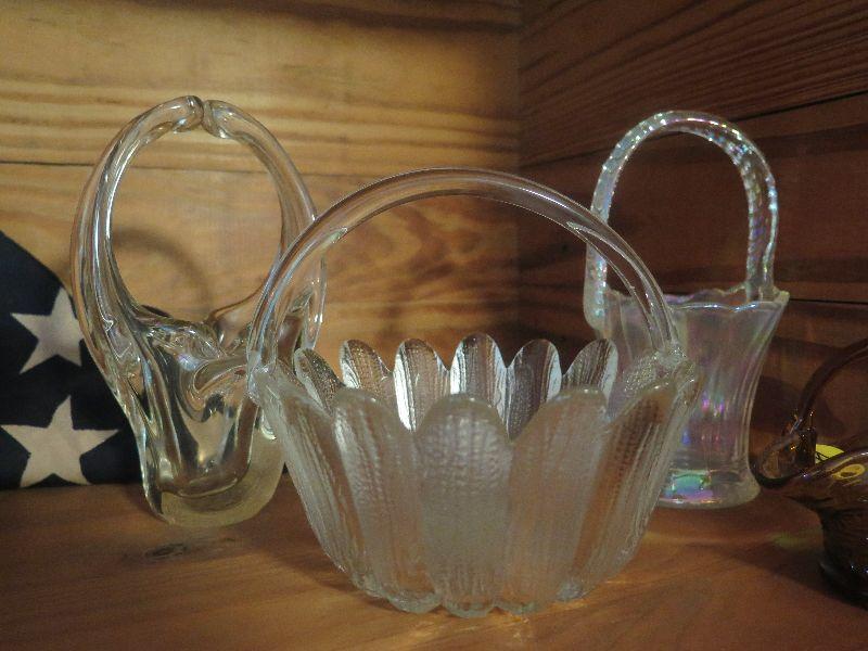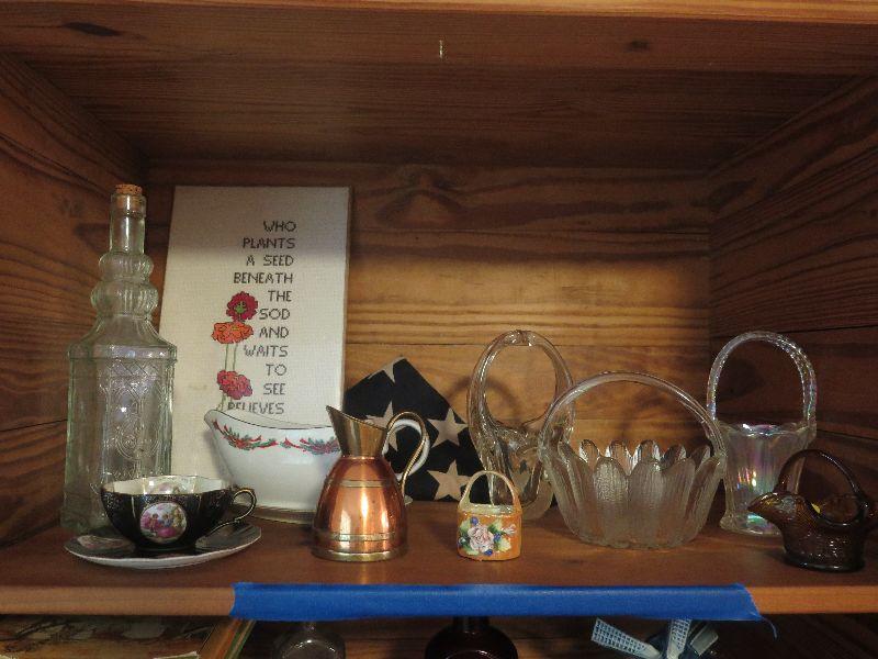 American flag, decanter, collectible tea cup and saucer, iridescent glass basket, frosted glass basket, and more. Bring box to remove.