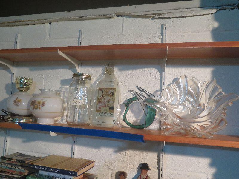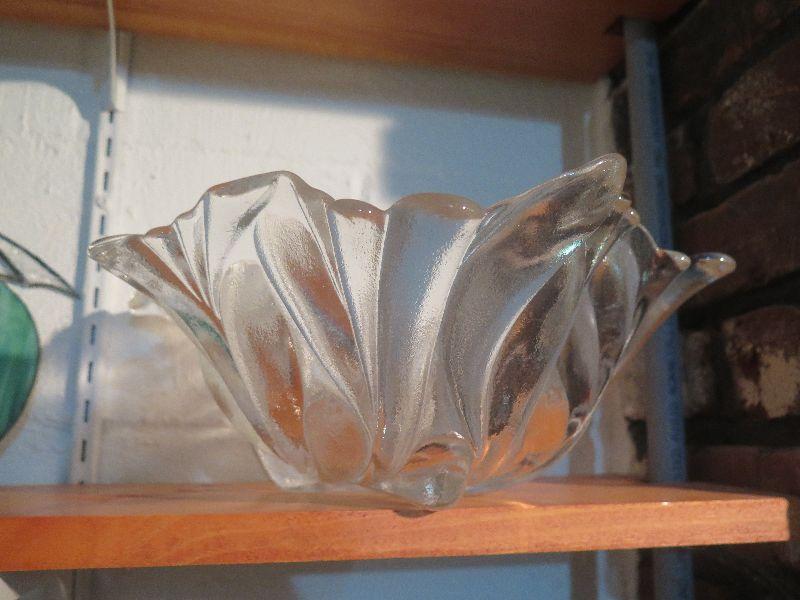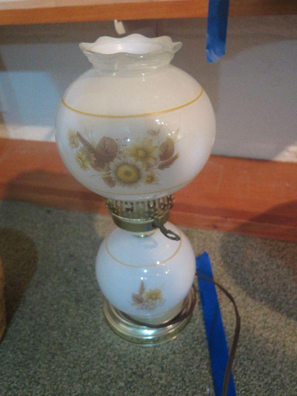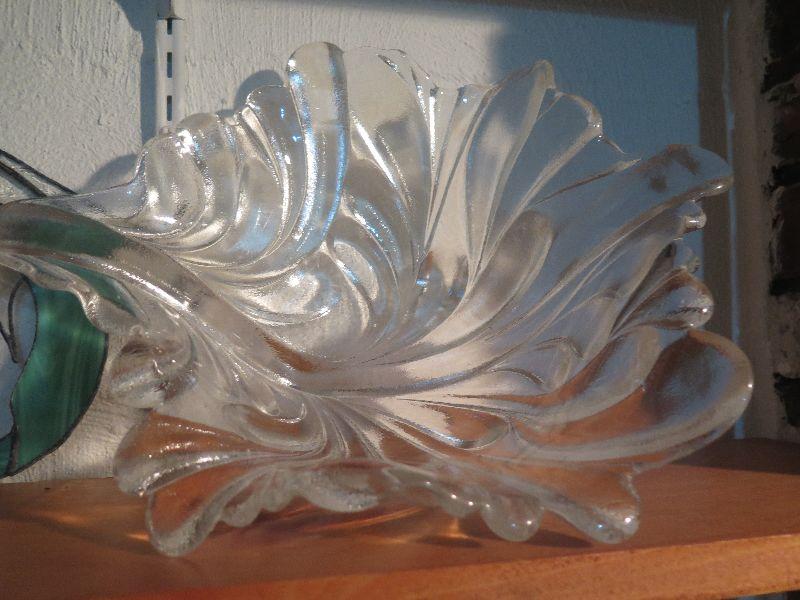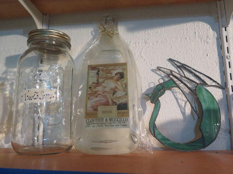 Hurricane lamp, untested, mason jar with lid, glass wine bottle shape serving plate, stained glass dragon, and a swirled glass bowl