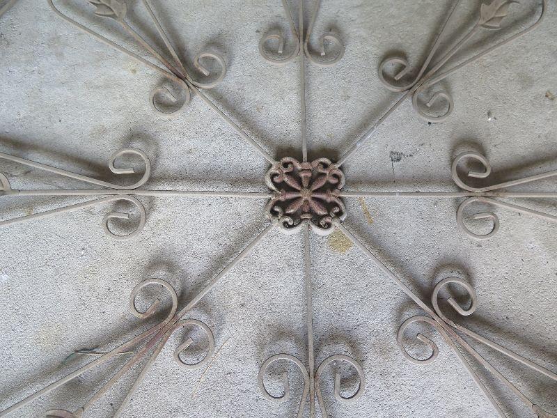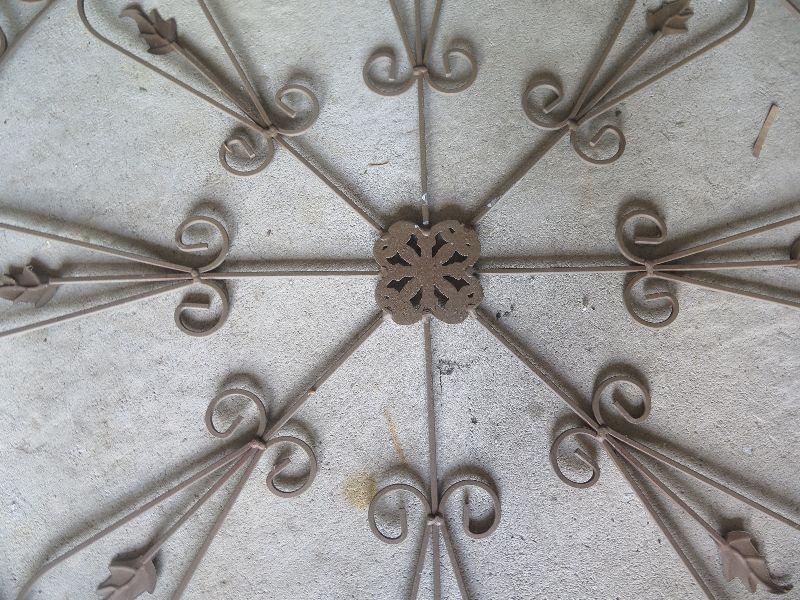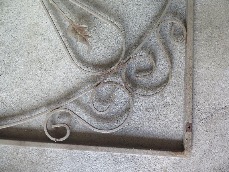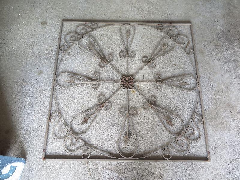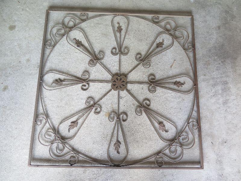Wrought Iron wall hanging, 30 inches square. Weathered. **Please read Terms and Conditions before placing a bid. Pick up is Wednesday July 31st, from 2 pm to 7pm in Sicklerville. All sales are final. All sales are as is, where is. Please review all photos. Any props included in photos are not included in listing. All measurements are approximate.