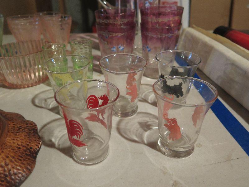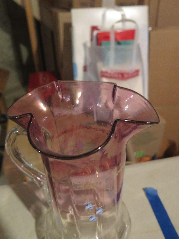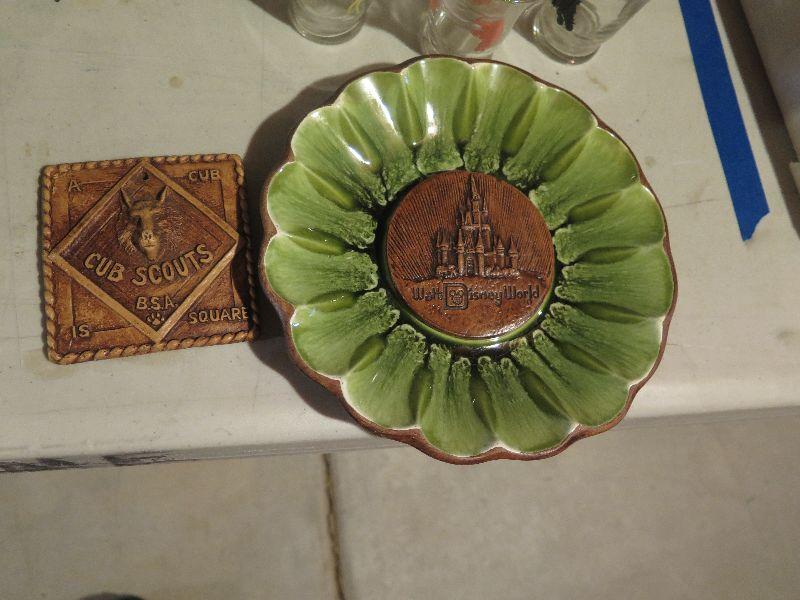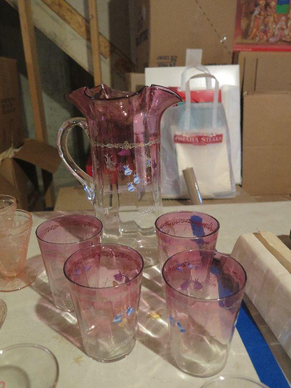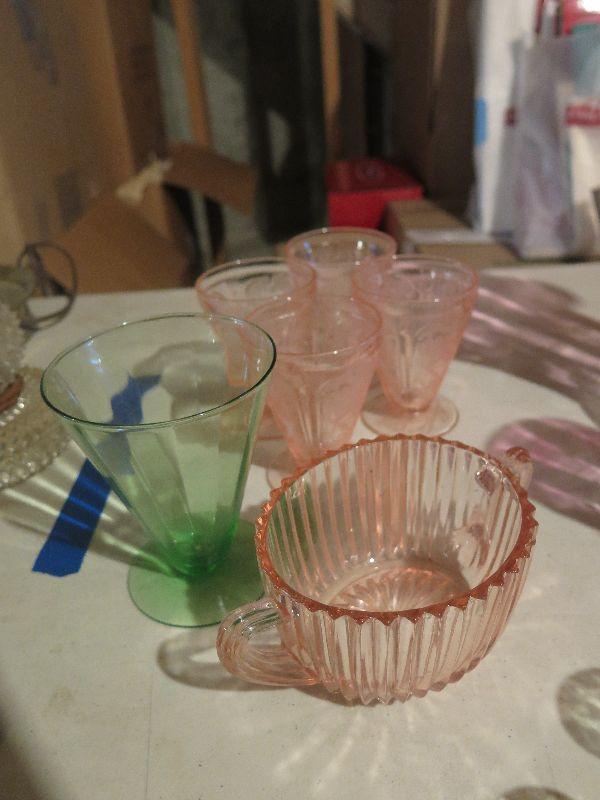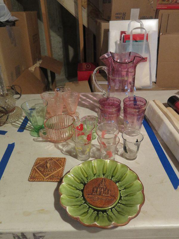 Pink and green depression glass, Walt Disney bowl, Boy Scout plaque, hand blown pitcher and glasses, and juice glasses. Bring box to move from basement. **Please read Terms and Conditions before placing a bid. Pick up is Wednesday July 31st, from 2 pm to 7pm in Sicklerville. All sales are final. All sales are as is, where is. Please review all photos. Any props included in photos are not included in listing. All measurements are approximate.