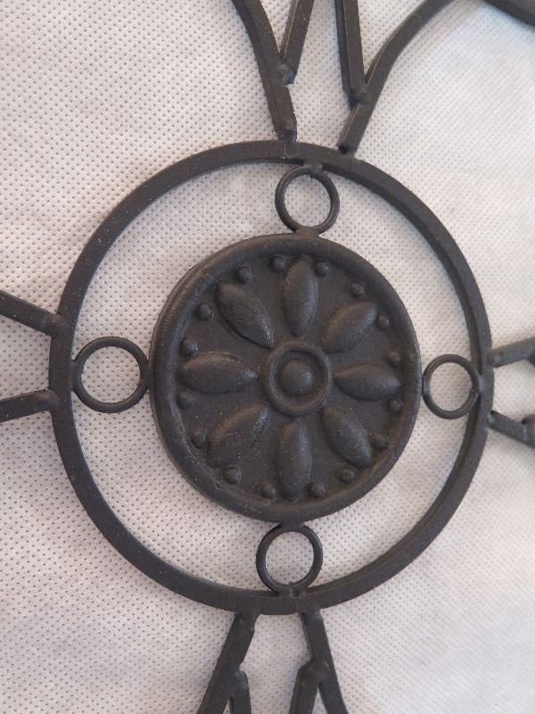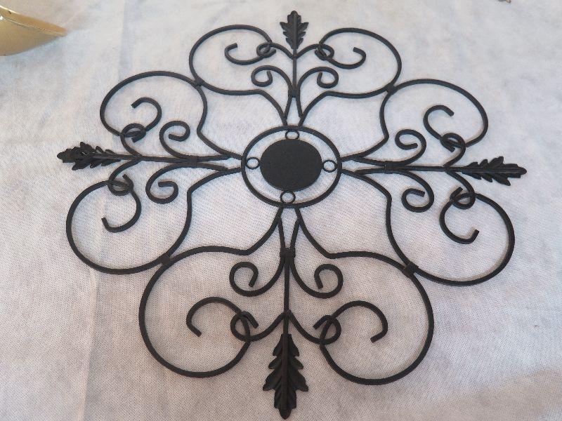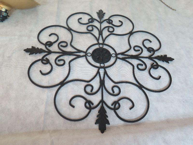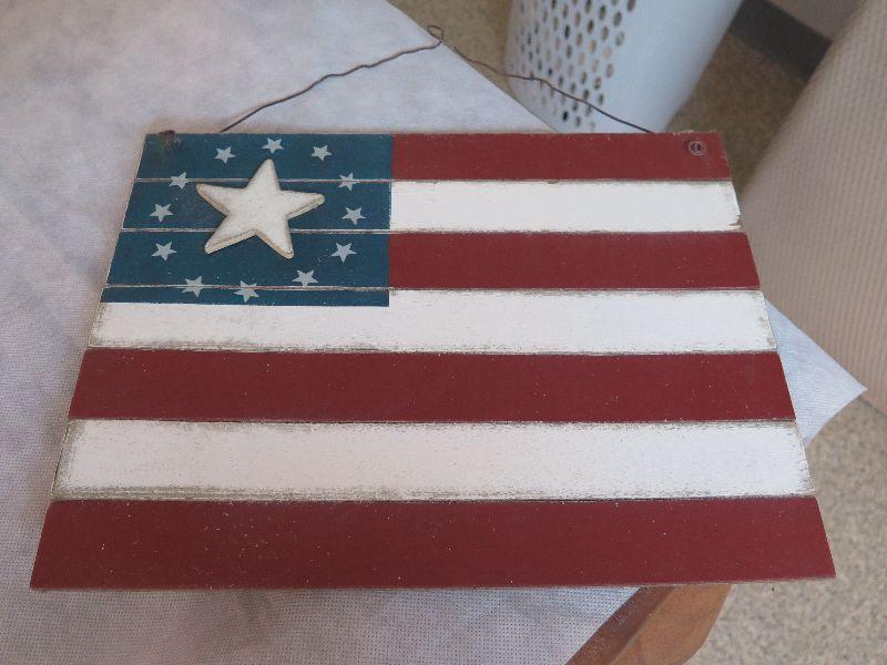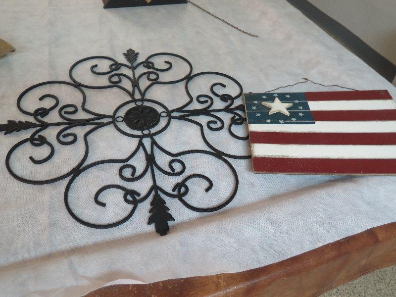 Wooden American flag and a wrought iron wall hanging, 24x24. Located in basement. Please read Terms and Conditions before placing a bid. Pick up is Friday, October 25th between 4 and 7, and Saturday, October 26th between 9 and 1. Props included in photos are not included in listing. All measurements are approximate. Comes from home with cats.