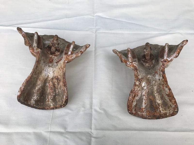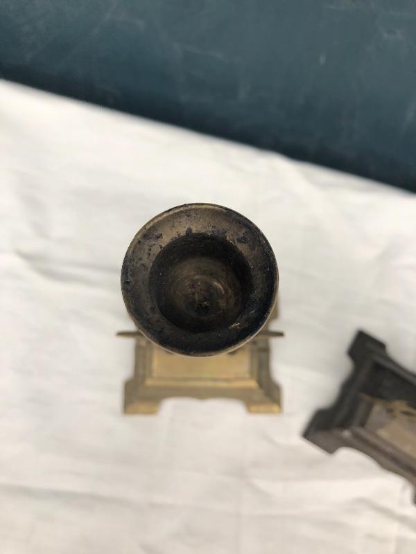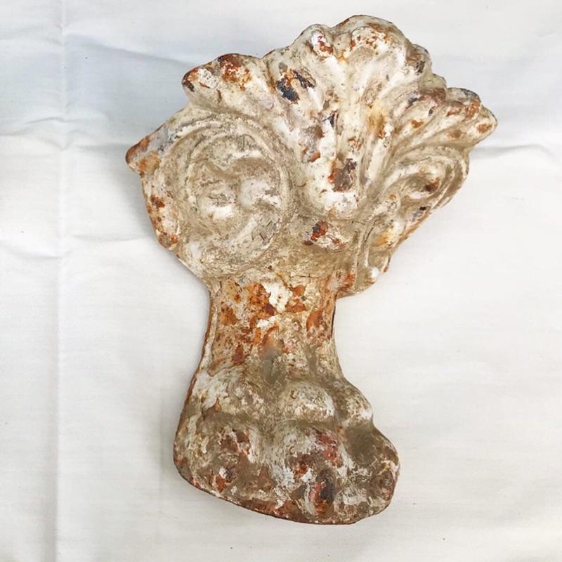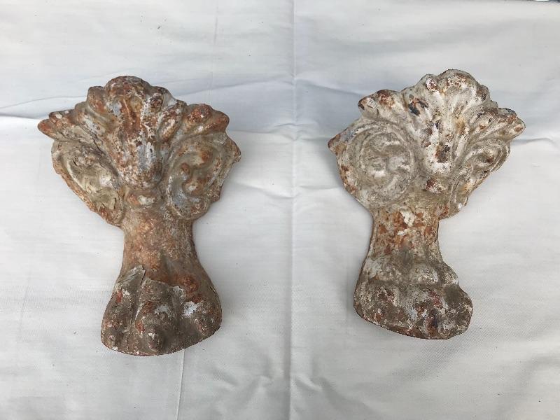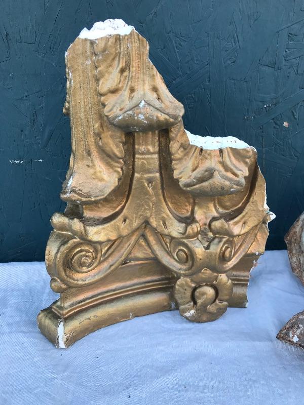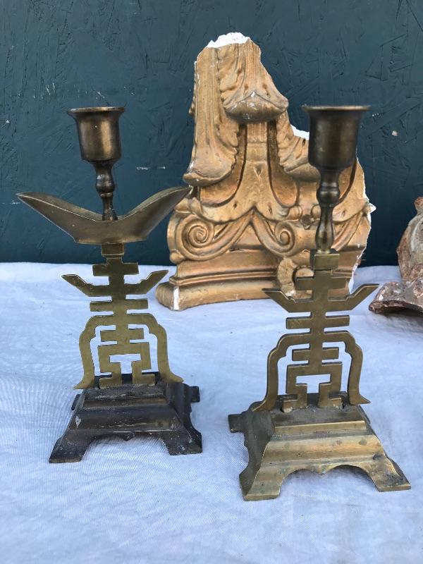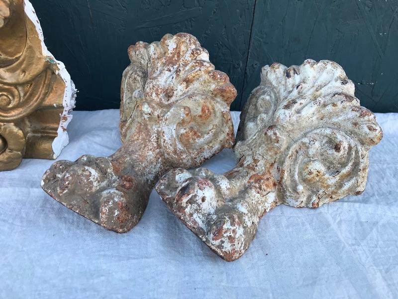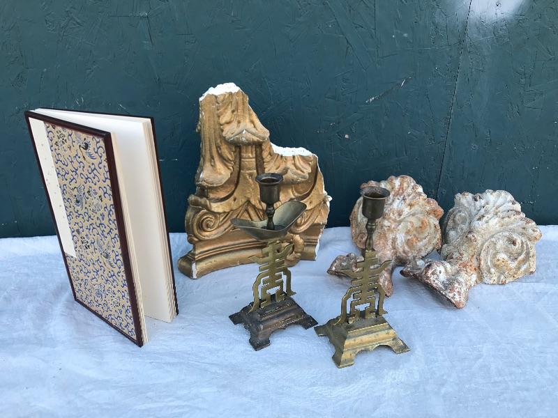 Set includes a salvaged plaster gold corbel, ornate claw feet, brass set of candle stick holders, and an accordian style notebook.