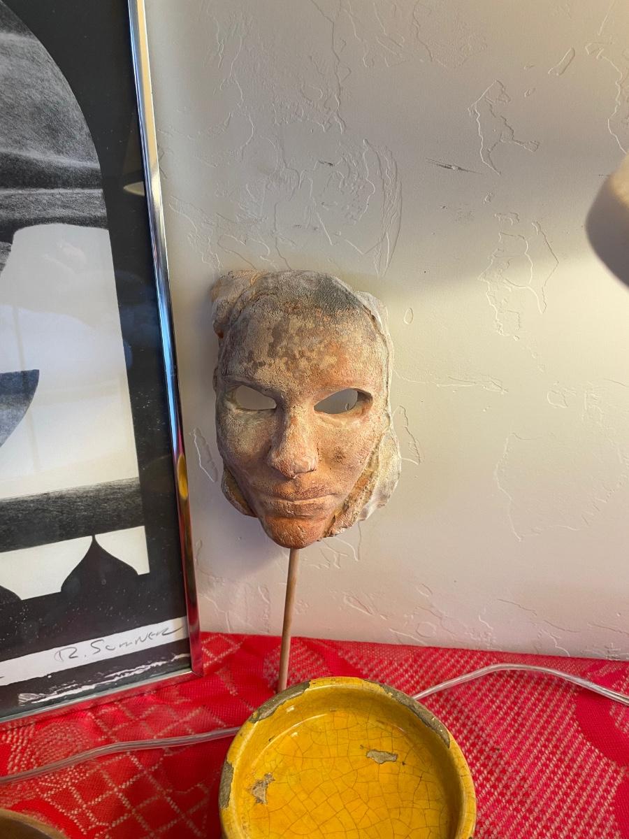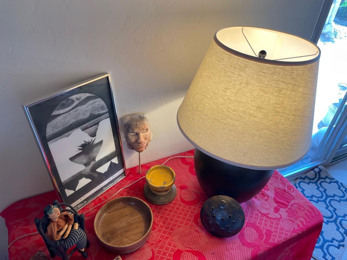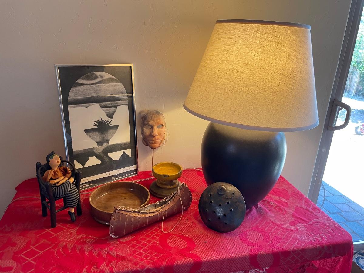 Home decor items includes a large table lamp in working condition, a ceramic mask with gallery markings(Belson Brown Gallery from the 70s), a framed piece of art and more. All in good condition