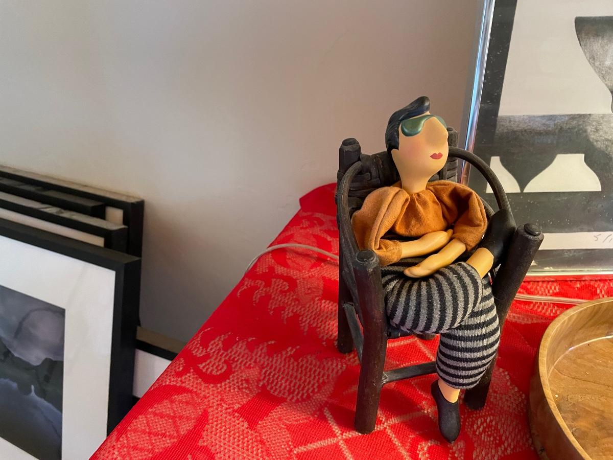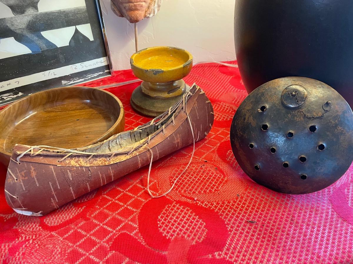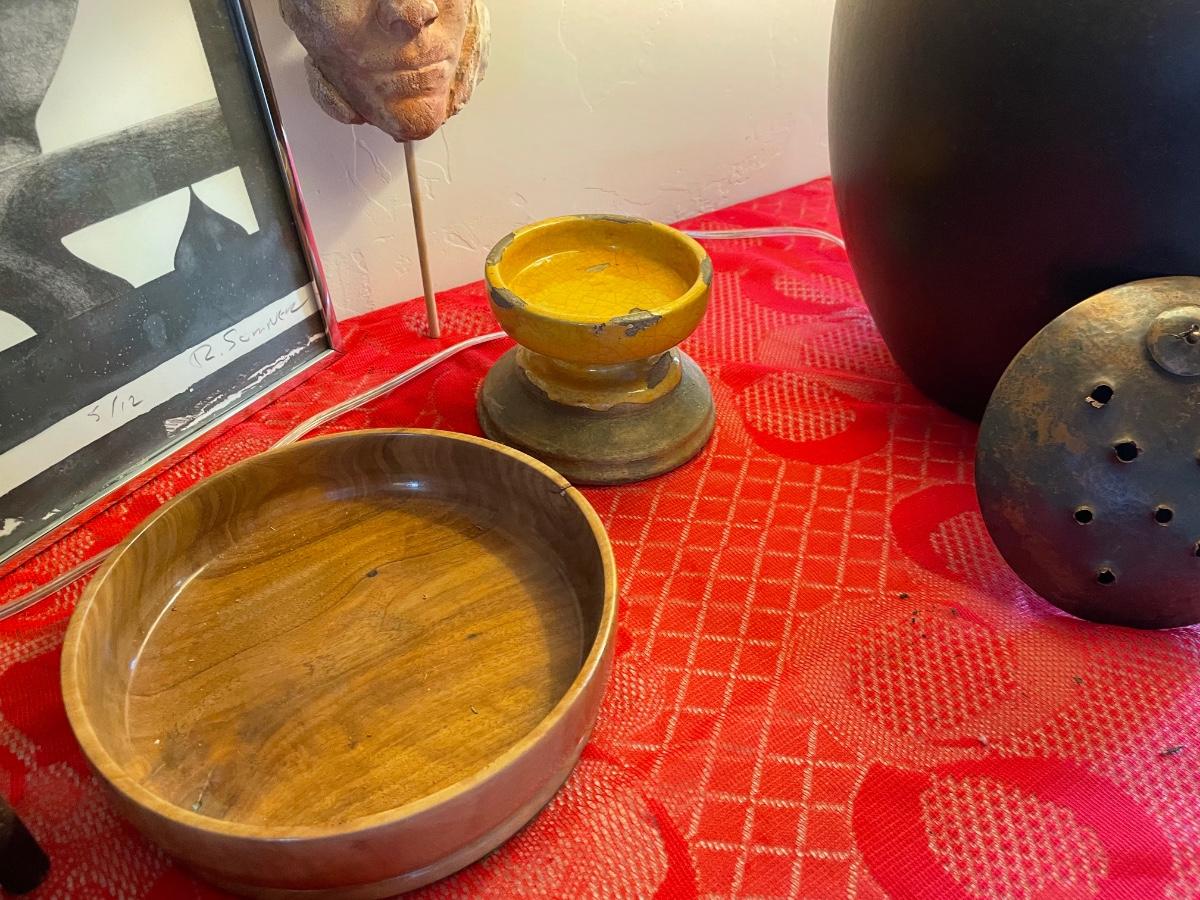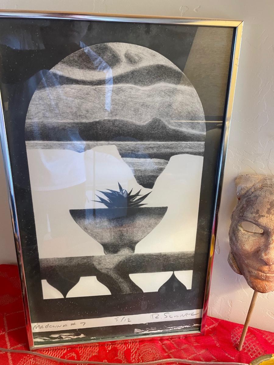 Home decor items includes a large table lamp in working condition, a ceramic mask with gallery markings(Belson Brown Gallery from the 70s), a framed piece of art and more. All in good condition
