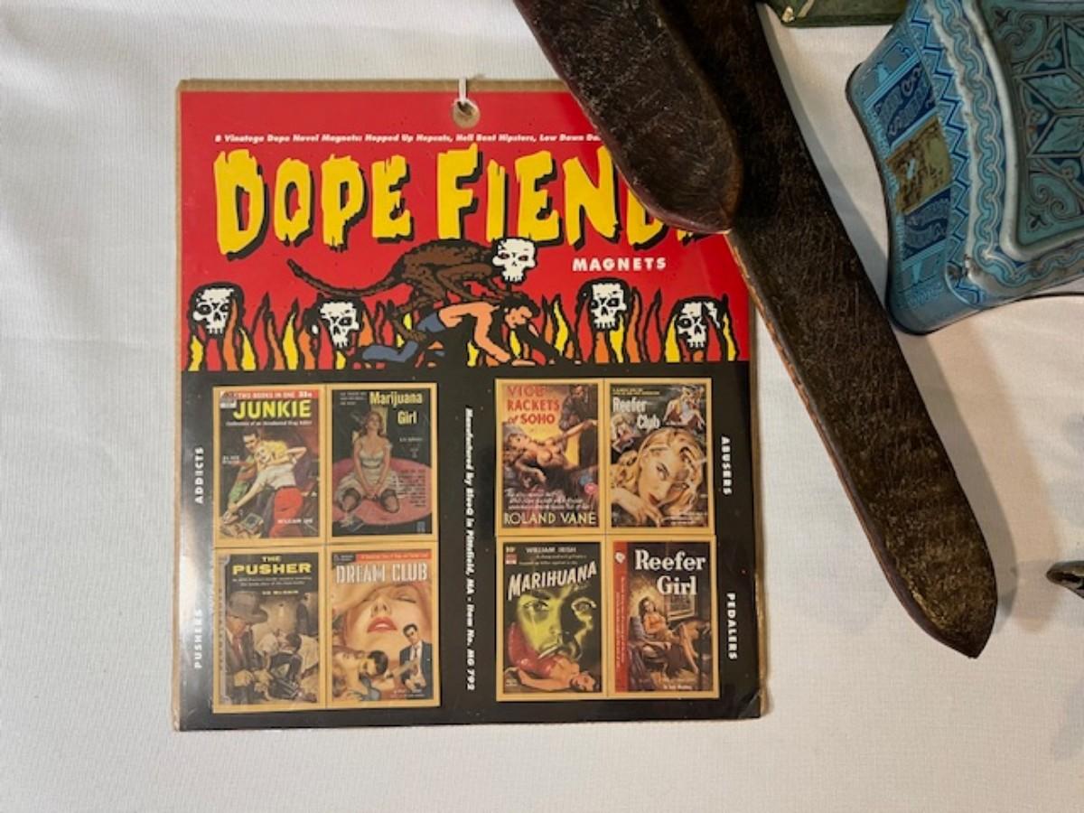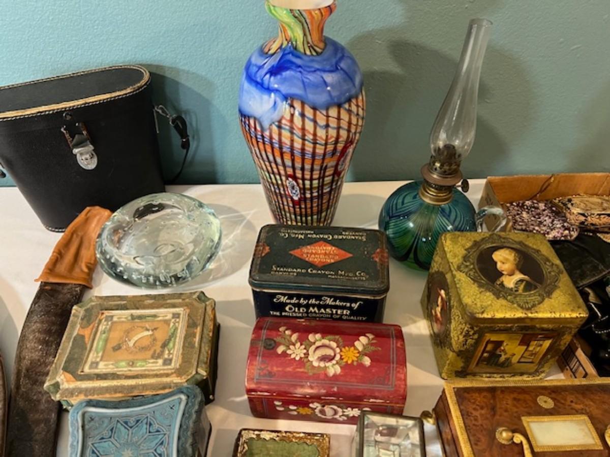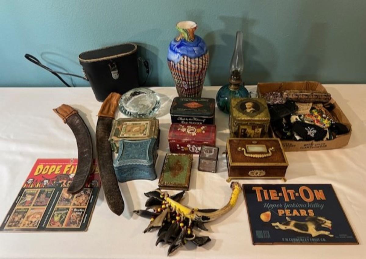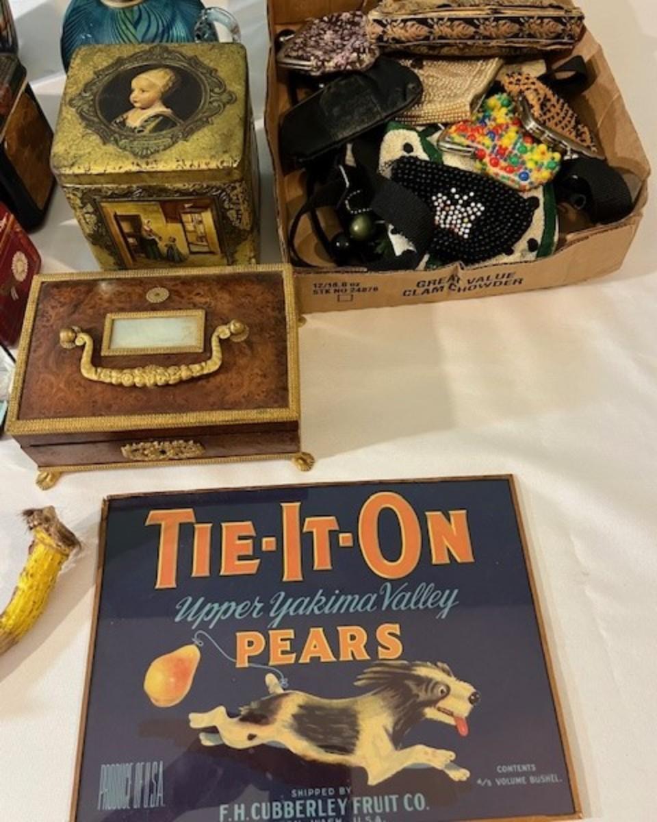 Includes vintage purses, tins, art glass, oil lamp, NOS "Dope Fiends" refrigerator magnets, "Tie-it-On Pears" advertising, and more. Total of 20+ pieces.
