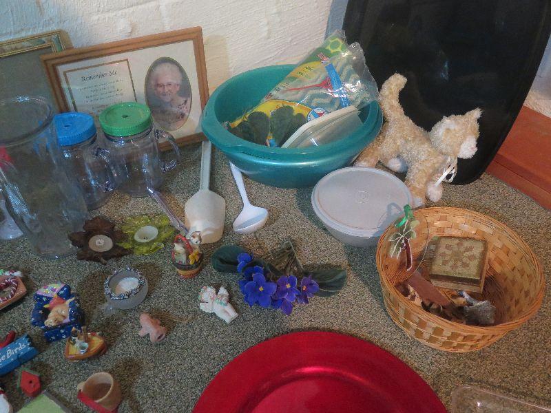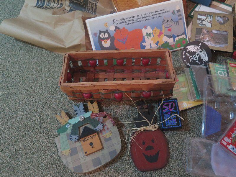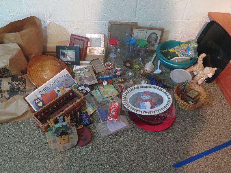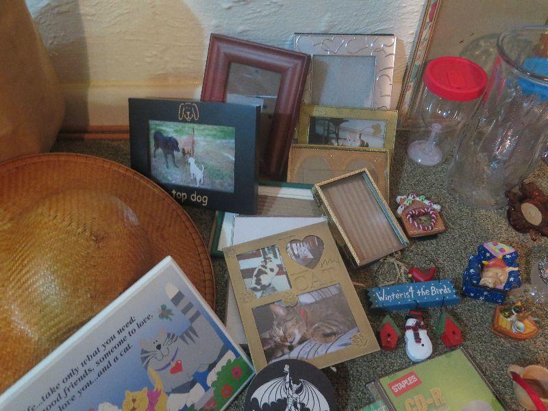 Serving platters, wall art, picture frames, tea light holders, blank cd's, and more. Bring box to move from basement.