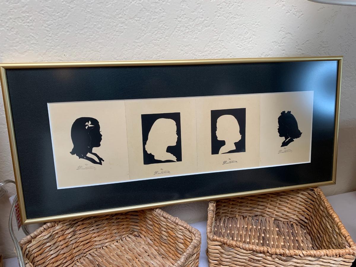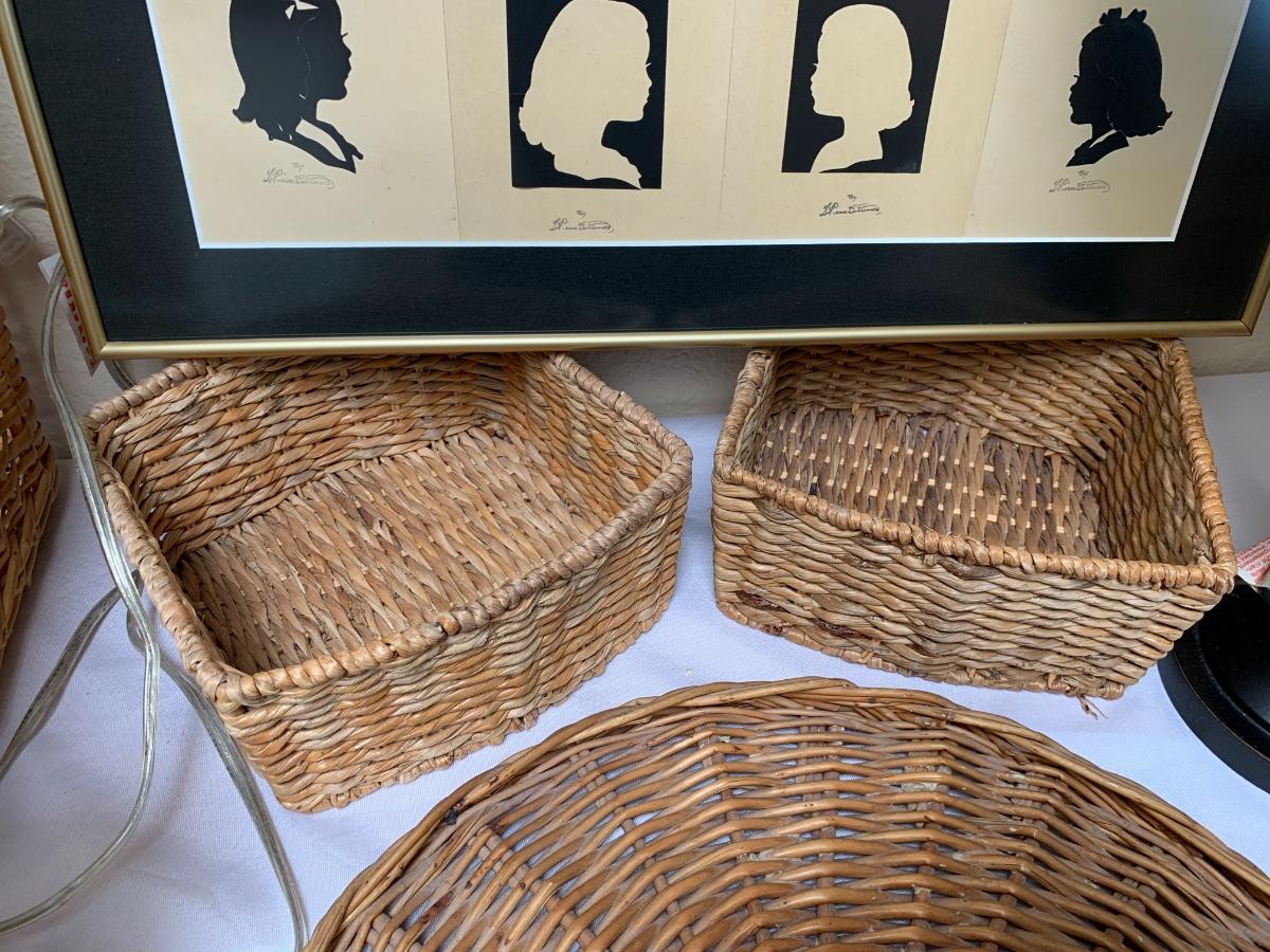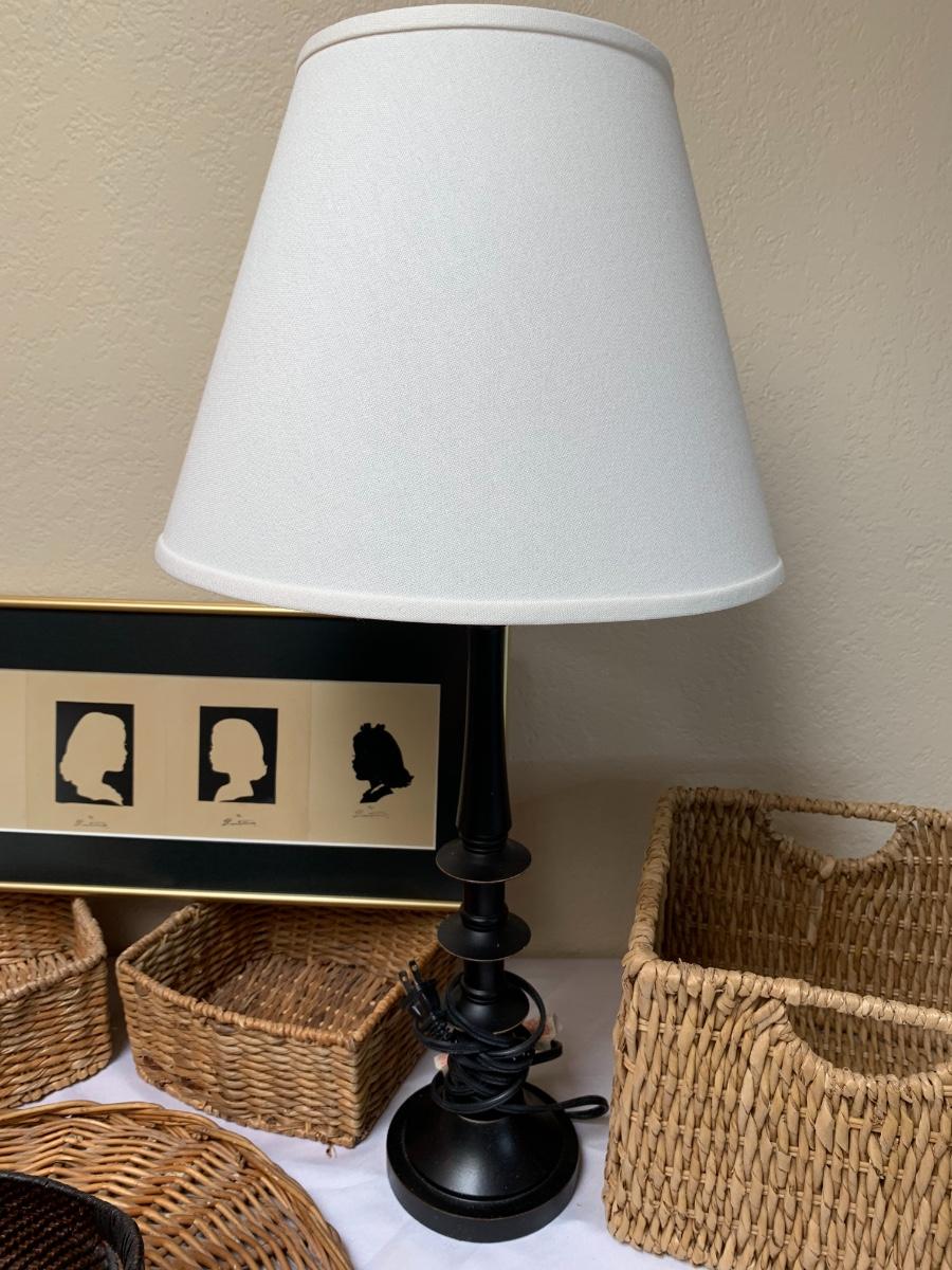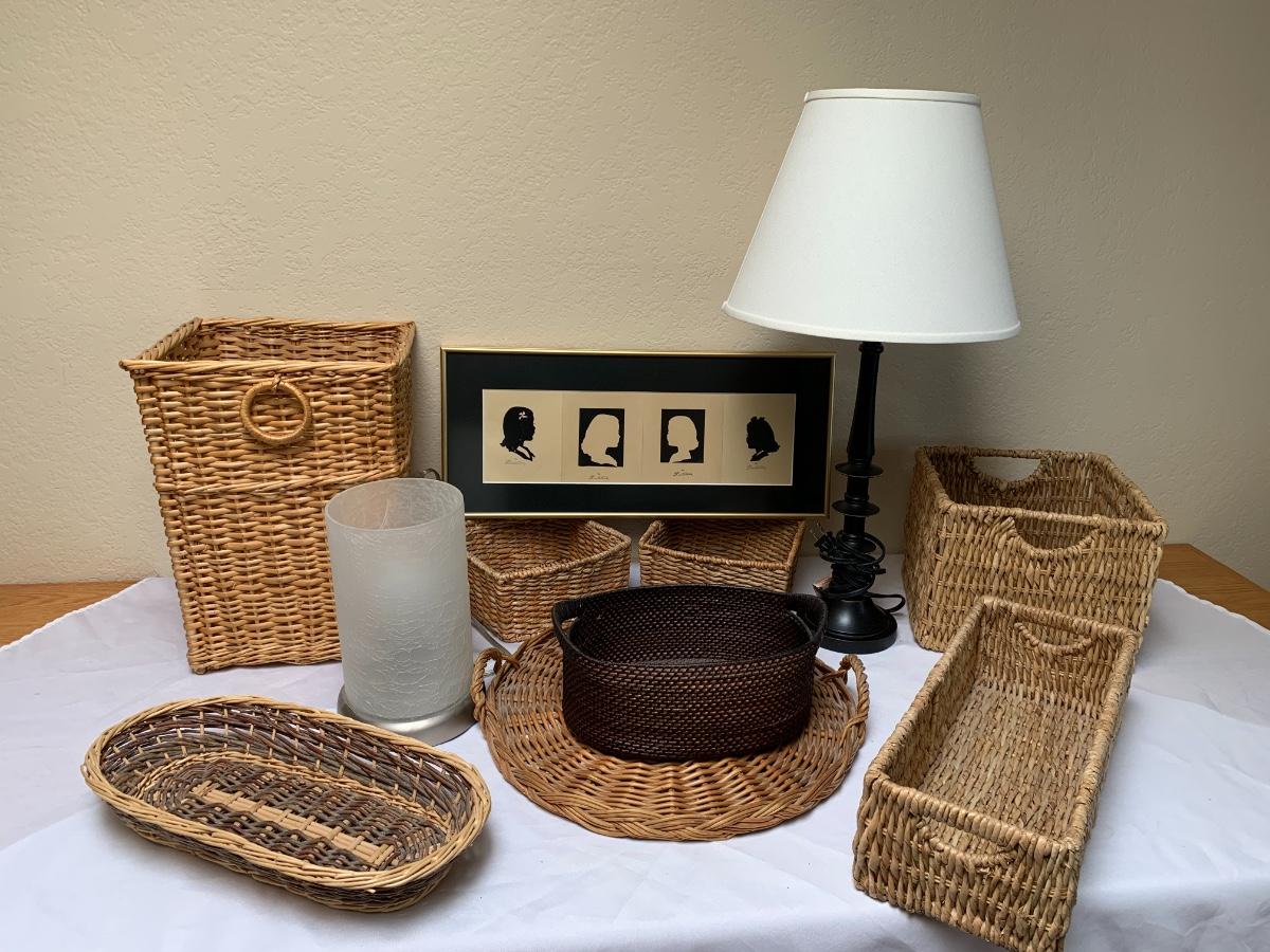 Assorted decor including baskets of different sizes (largest basket is 15 inches tall), one profile portrait artwork piece and one black lamp (26 inches tall) *not tested* all in good to great condition