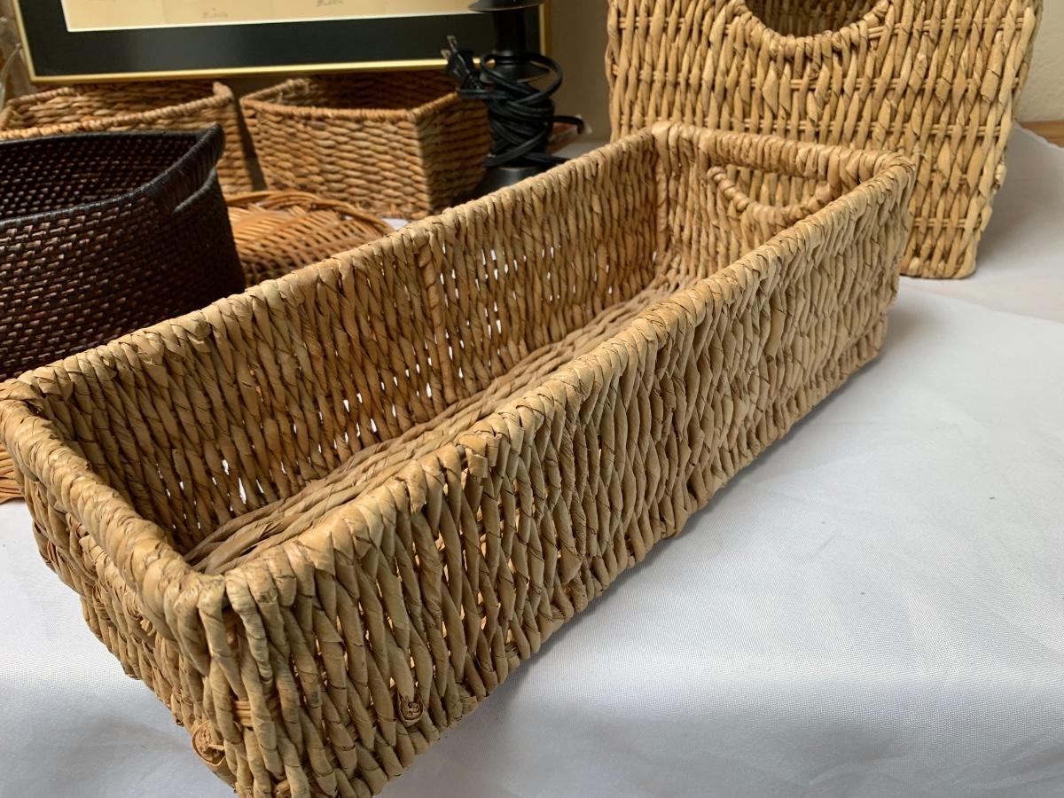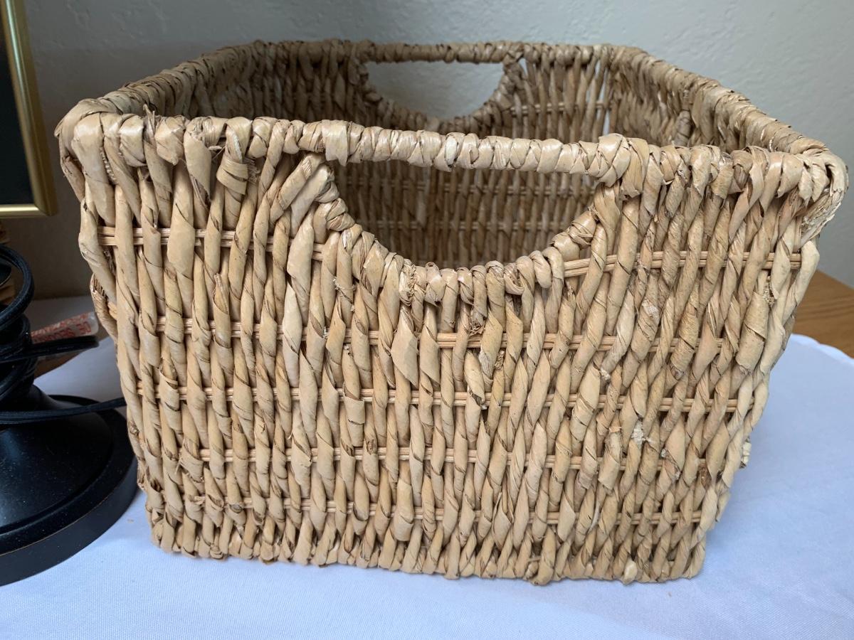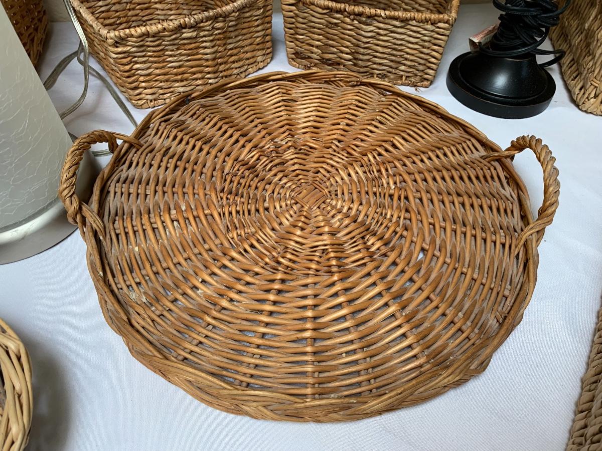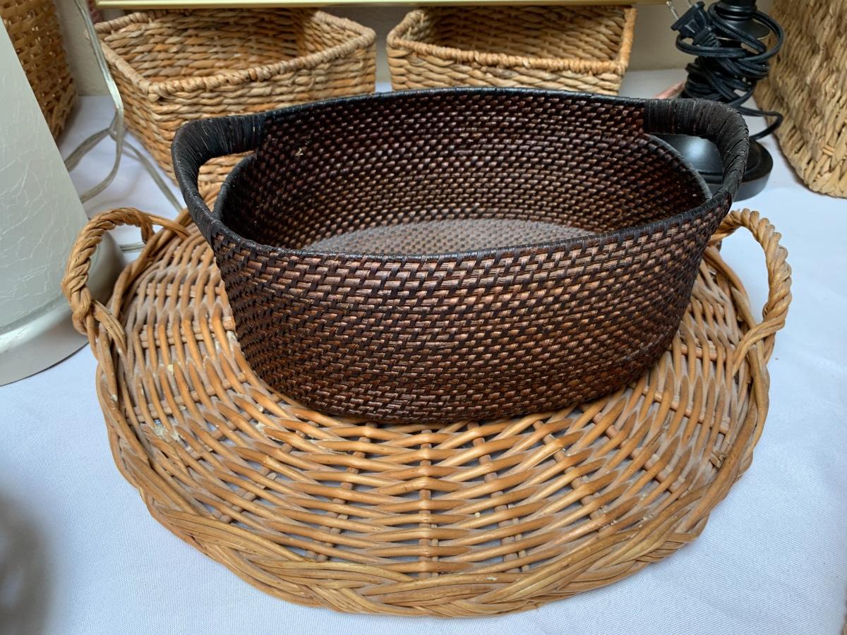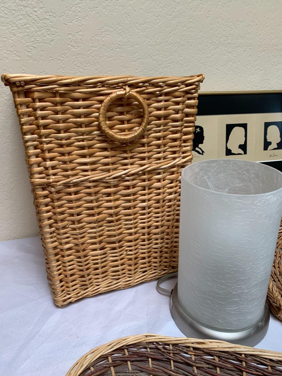 Assorted decor including baskets of different sizes (largest basket is 15 inches tall), one profile portrait artwork piece and one black lamp (26 inches tall) *not tested* all in good to great condition