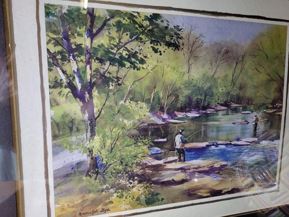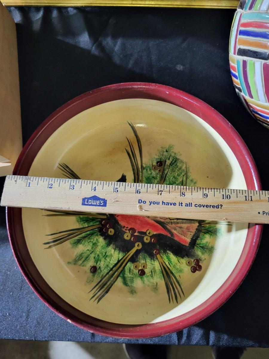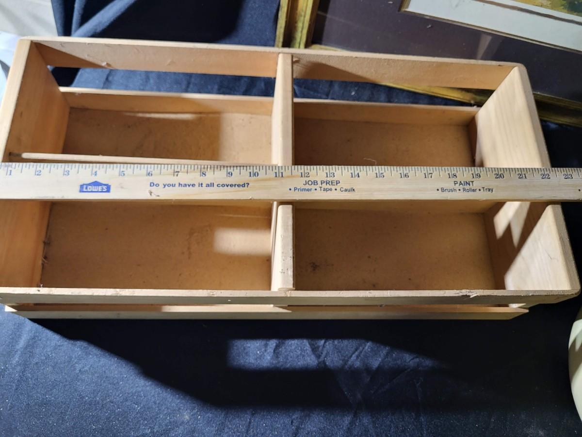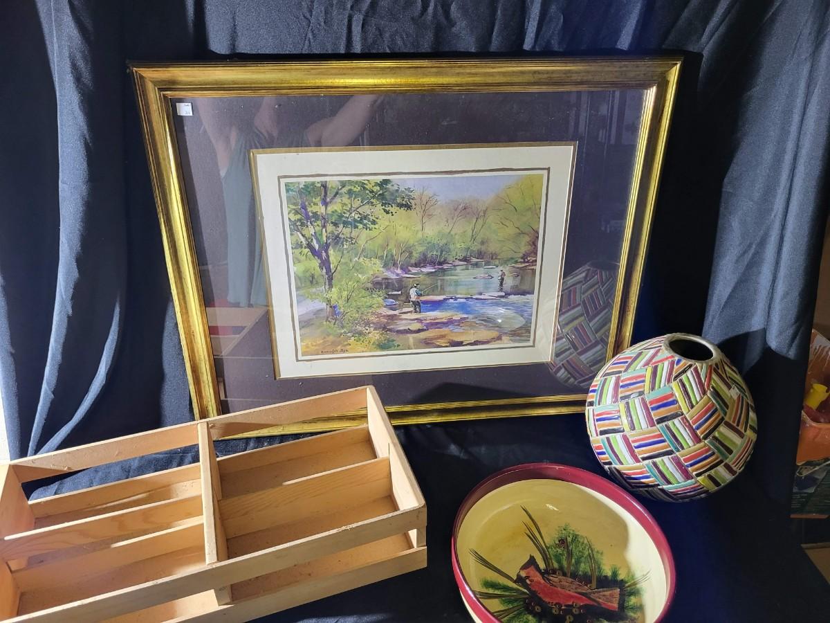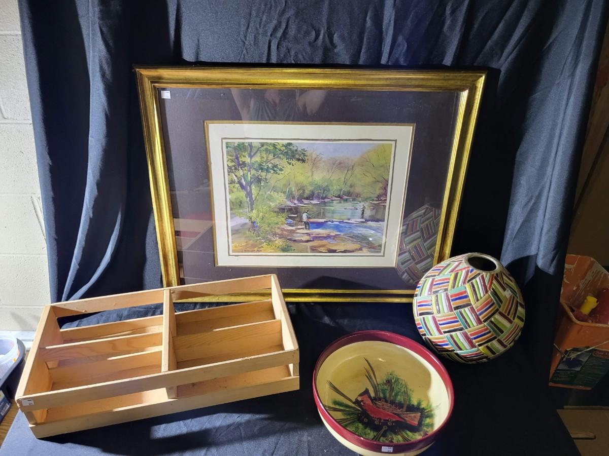 Framed art, crate, bowl, vase
