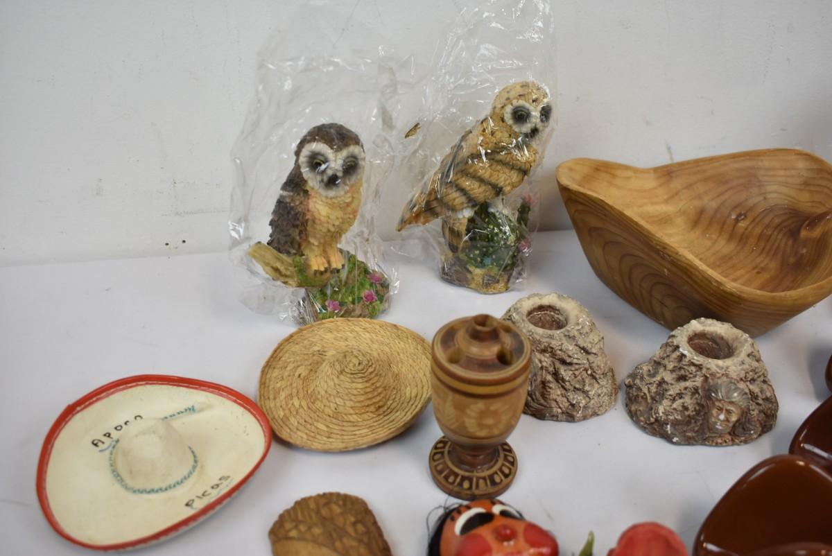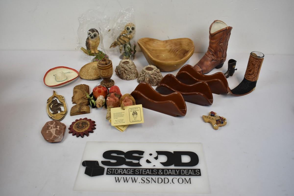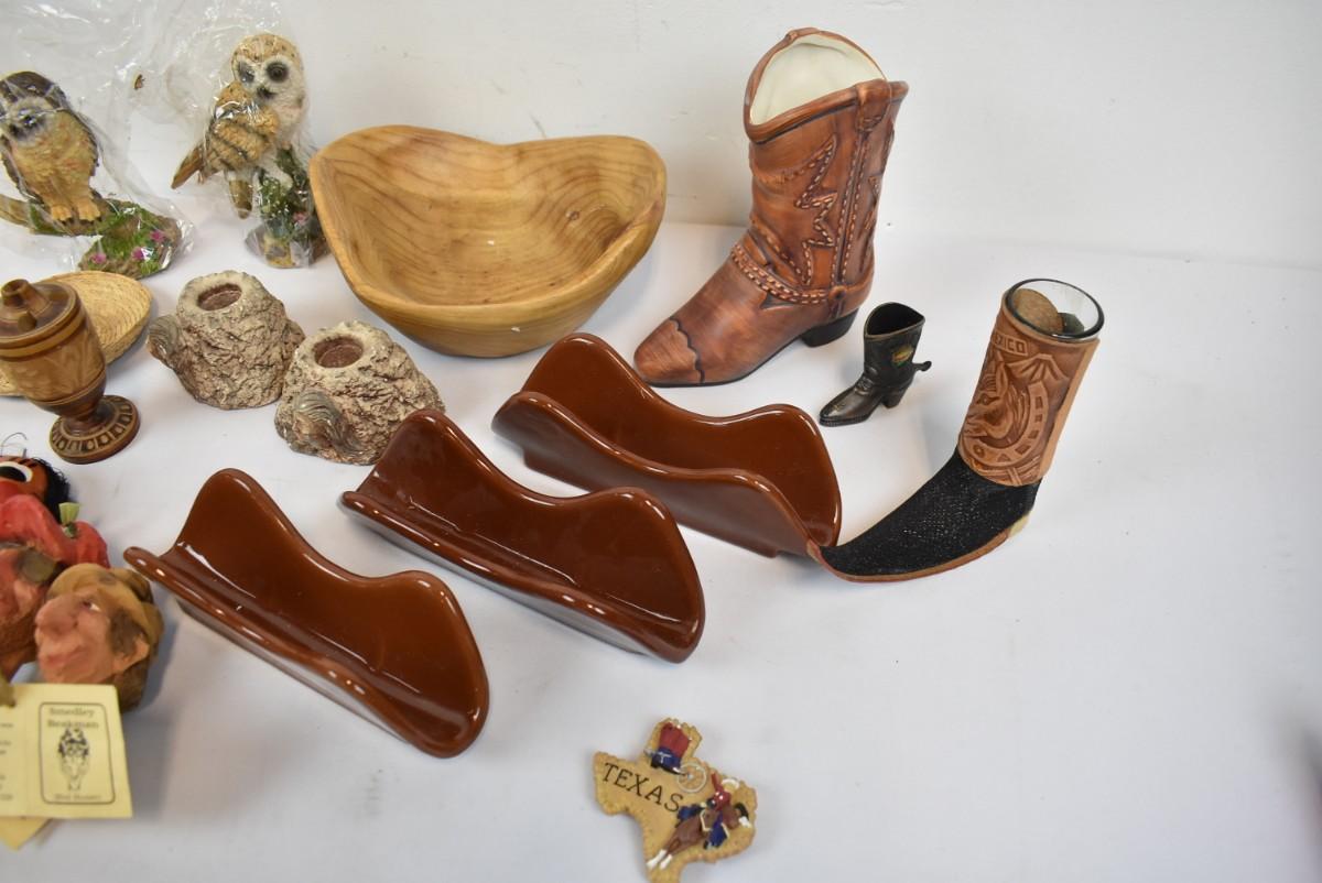 Decor Lot: Ceramic Boot, Shotglass, Candleholders, Owls, etc