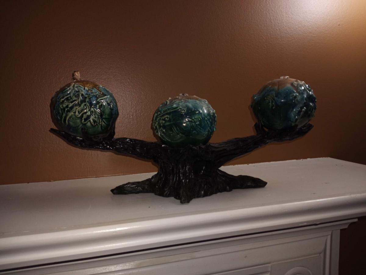 5 piece basket set; 2 candle stands; 4 glass bowls;large round metal blade wall décor; 3 oil burning spheres on stand