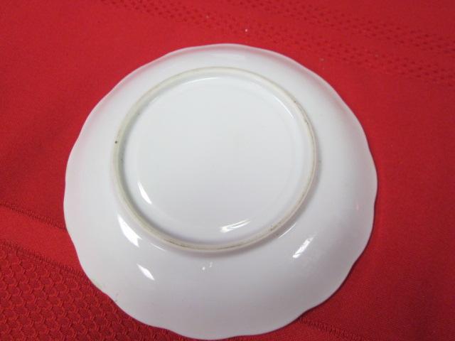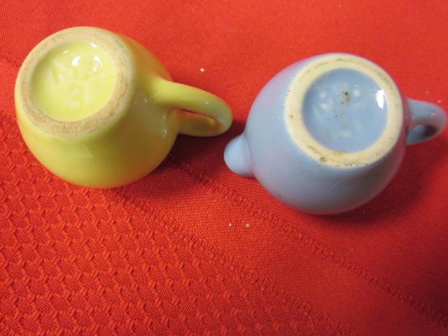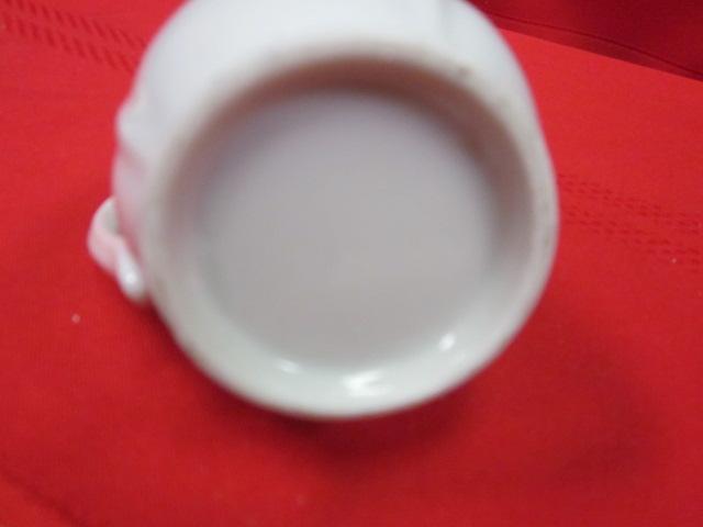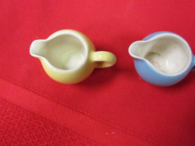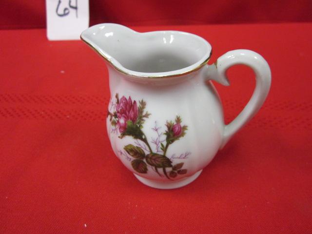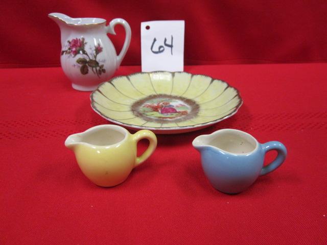 Decor saucer, 2 mini cream pitchers, and floral creamer