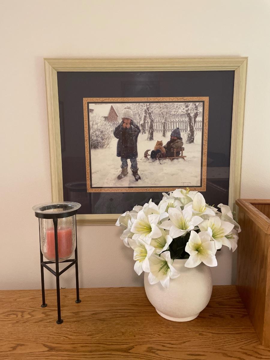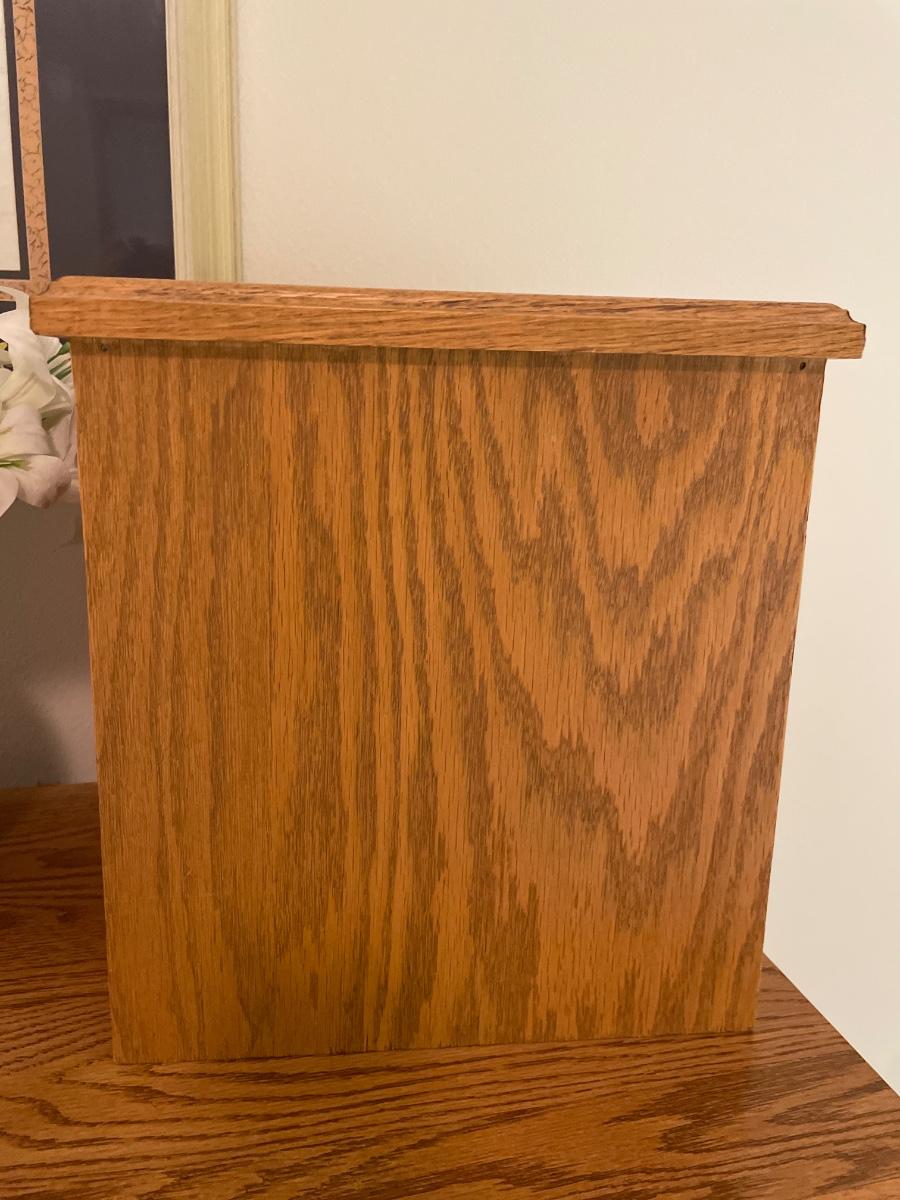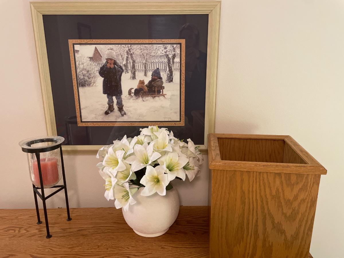 Wooden garbage can with white vase, flowers, candle, and wall decor