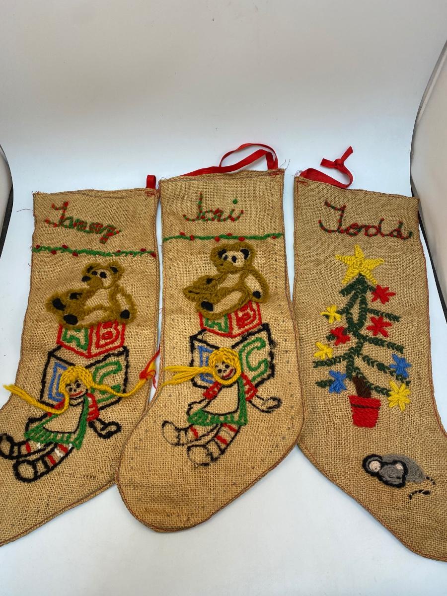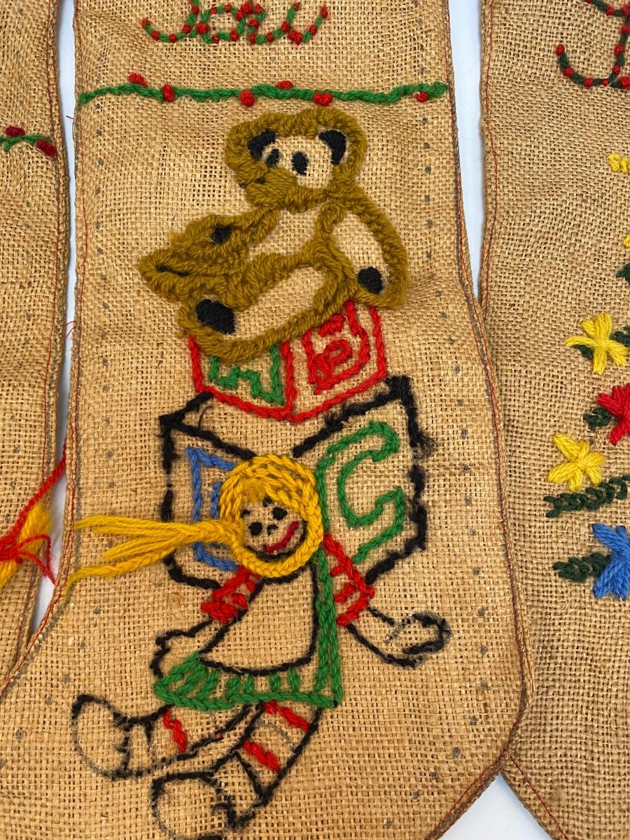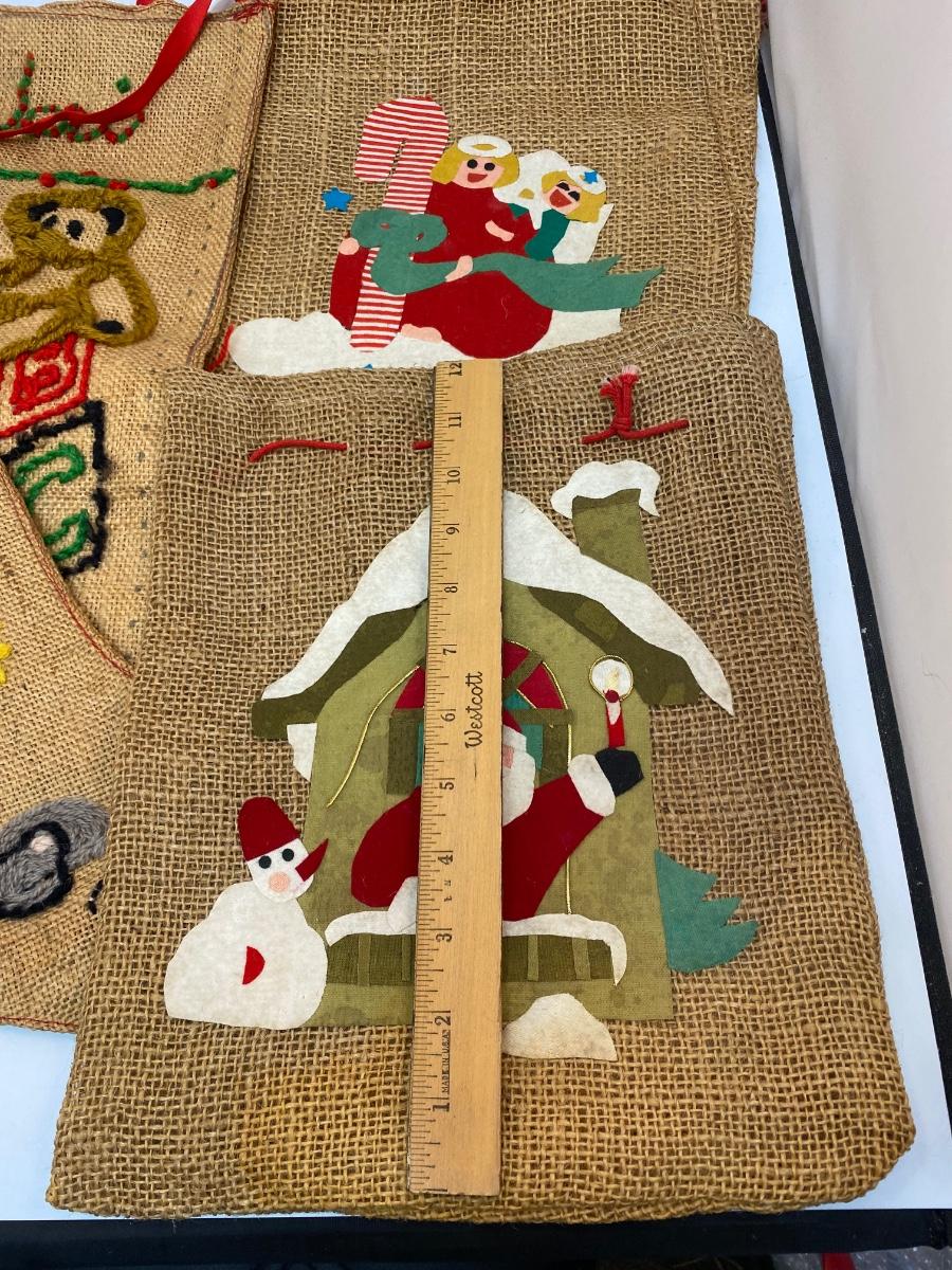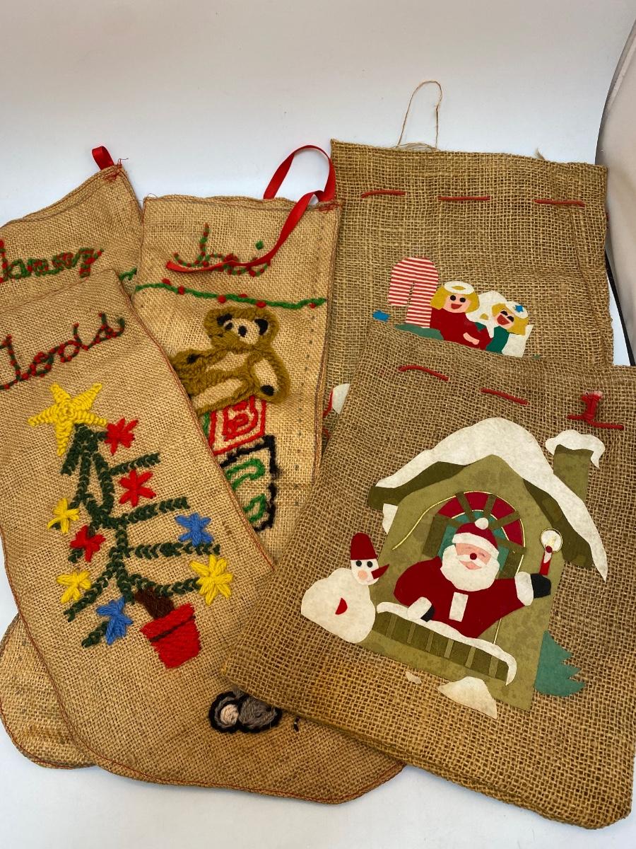 Decorated Burlap Christmas Holiday Stockings and Gift Bags. Might be able to repurpose.