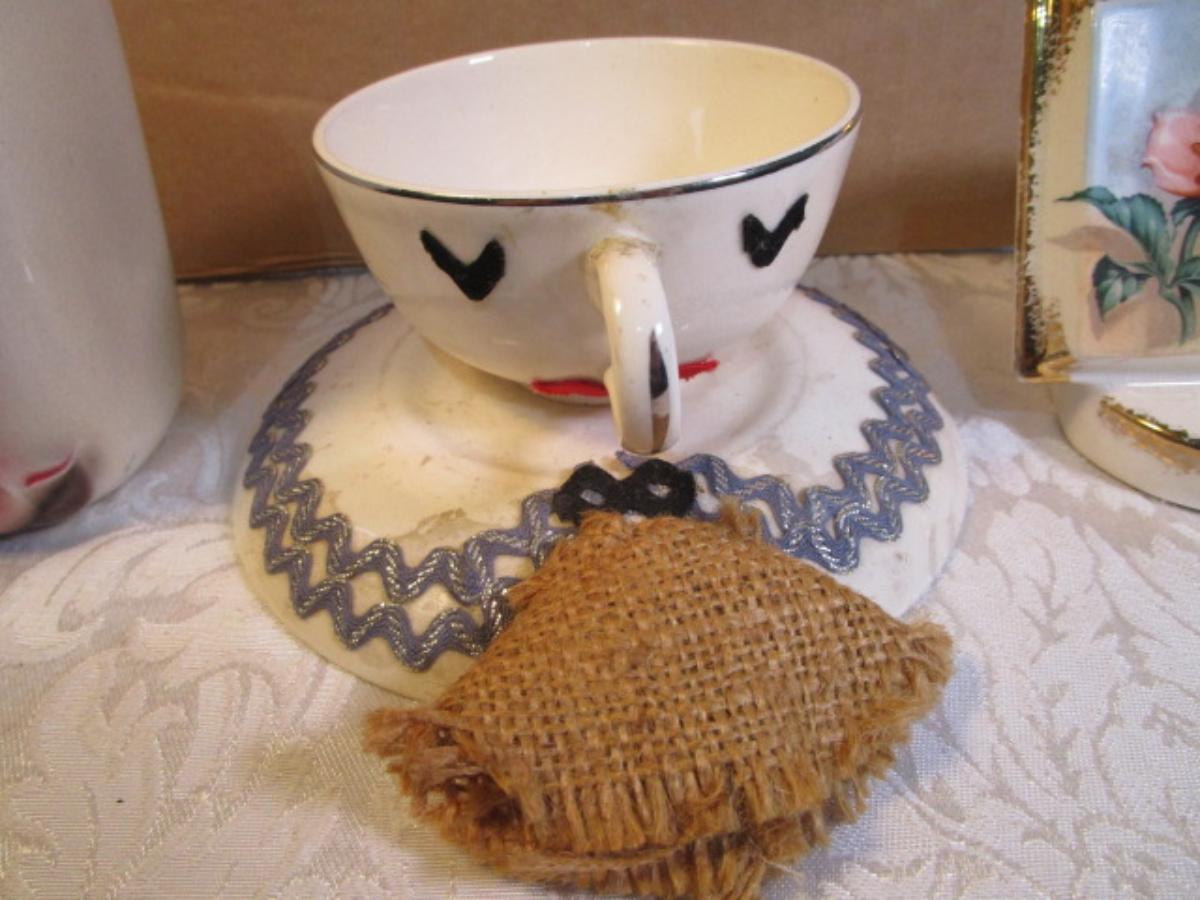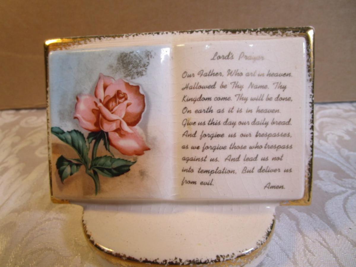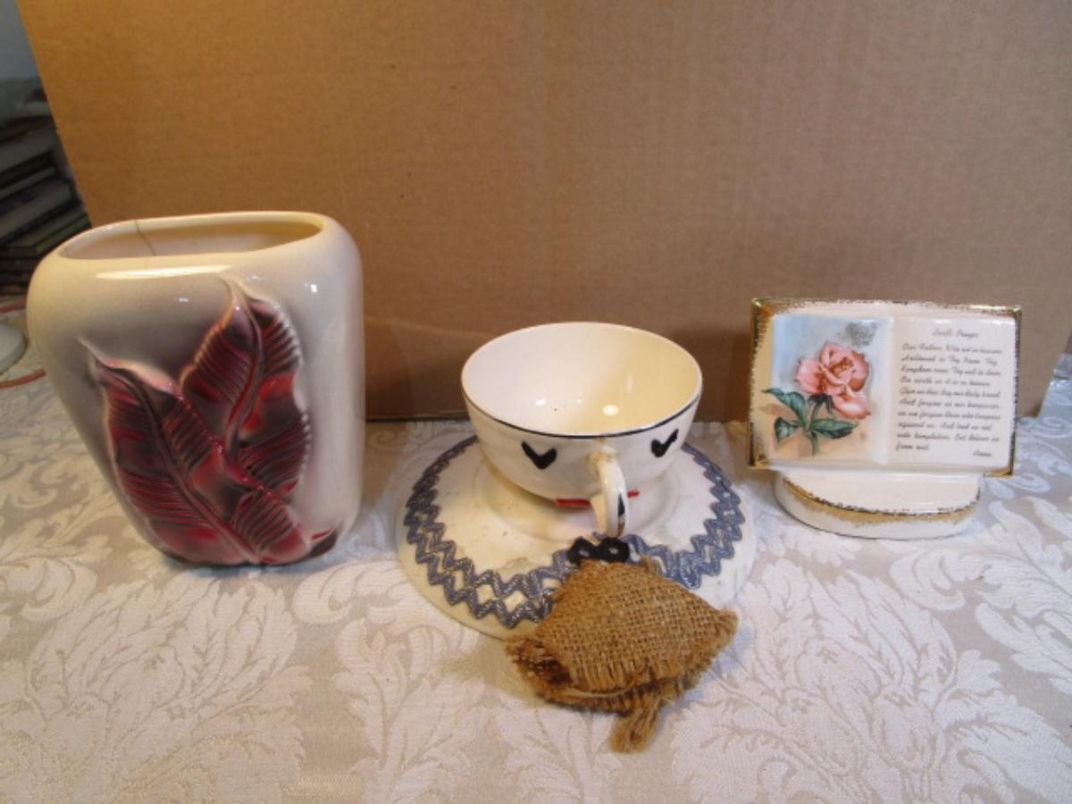 Decorated cup with attached saucer, The Lord's Prayer pen holder, Ceramic vase