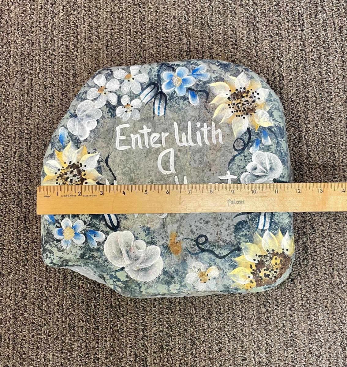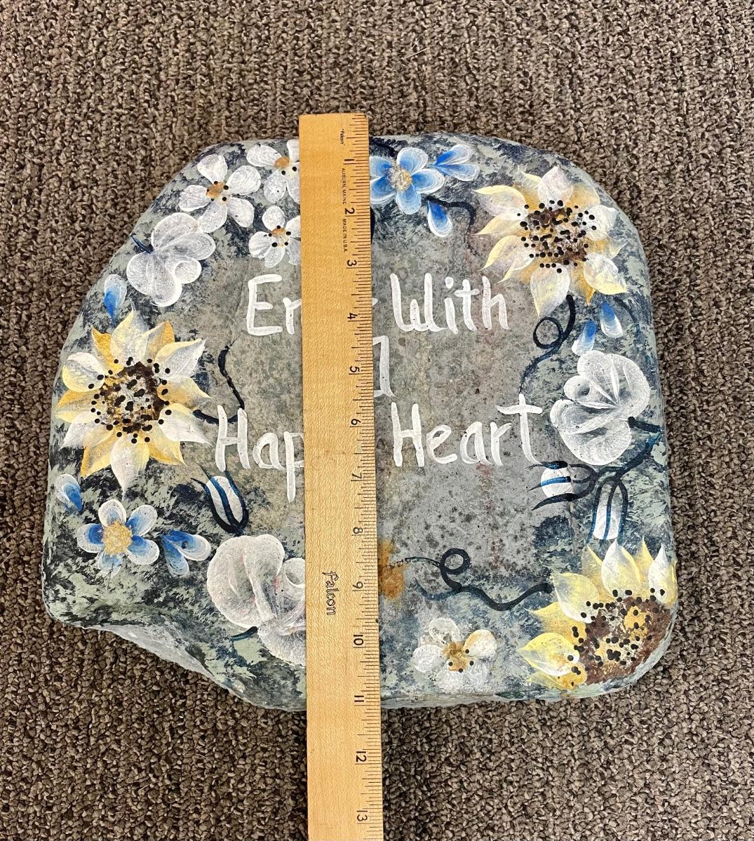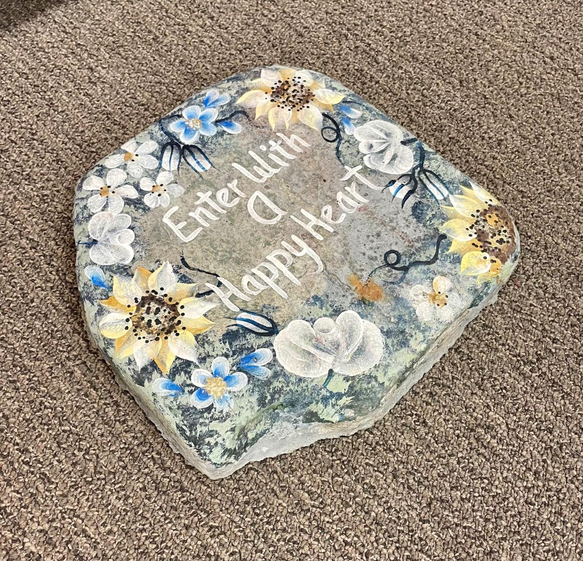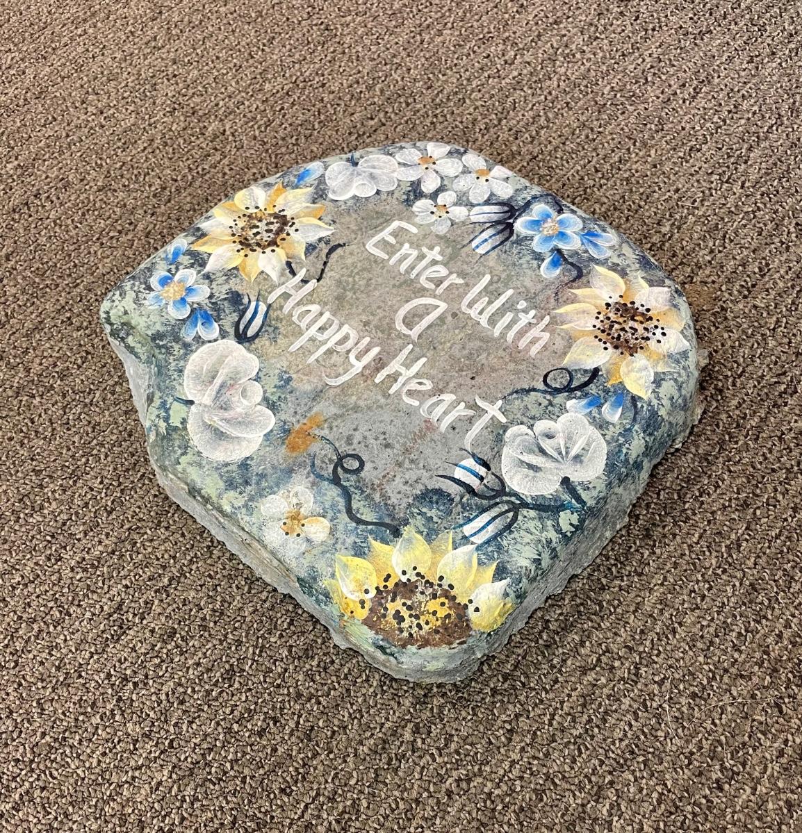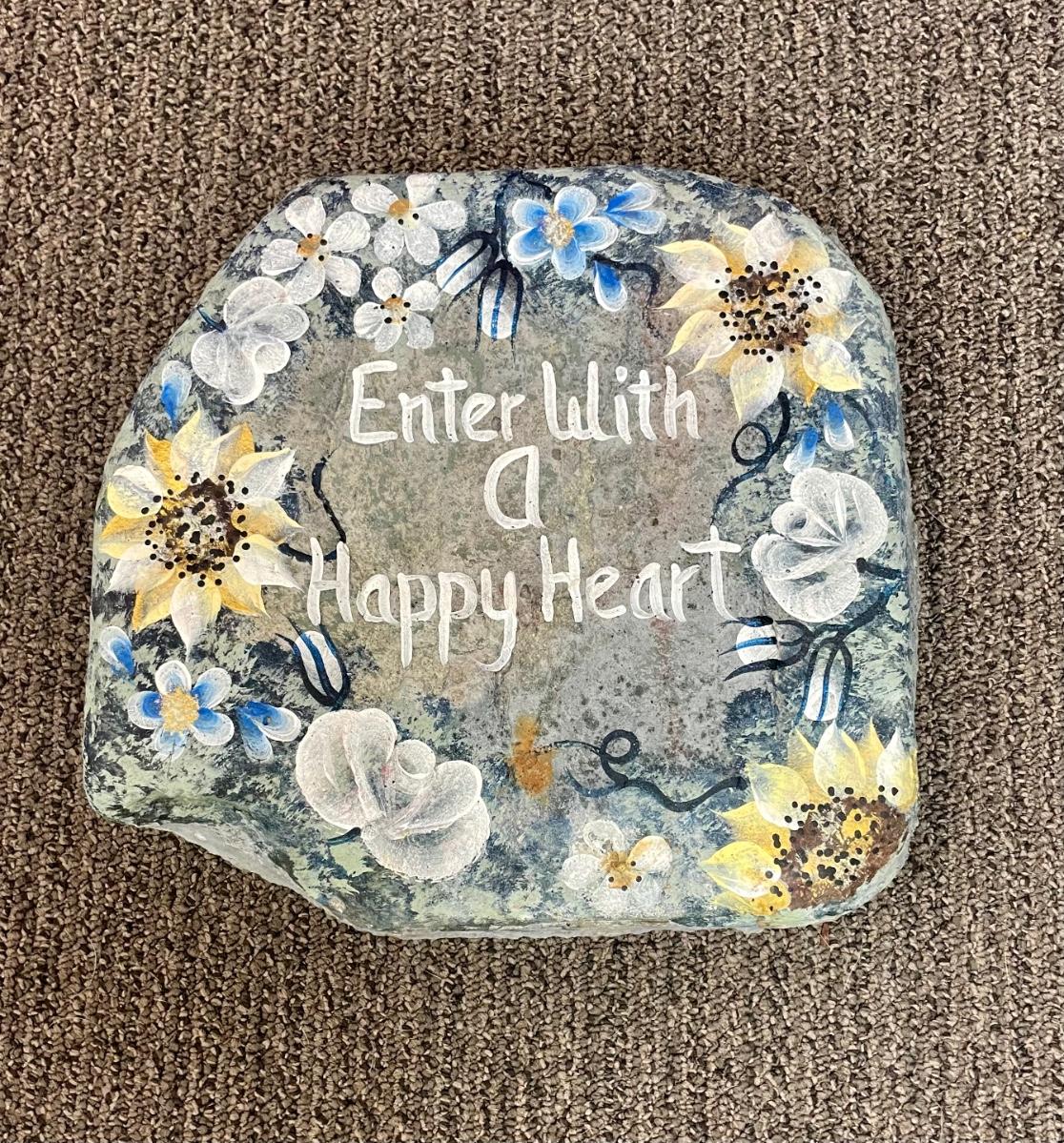Concrete step stone with hand-painted garden flowers, reads “Enter With a Happy Heart”. Approx 12” x 14”.